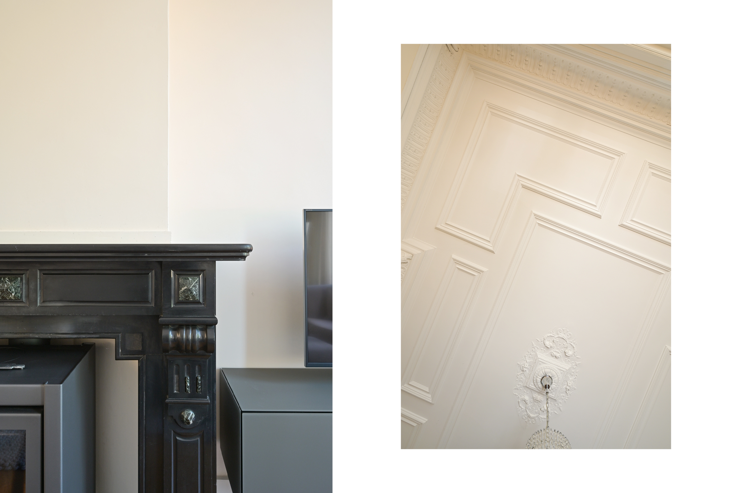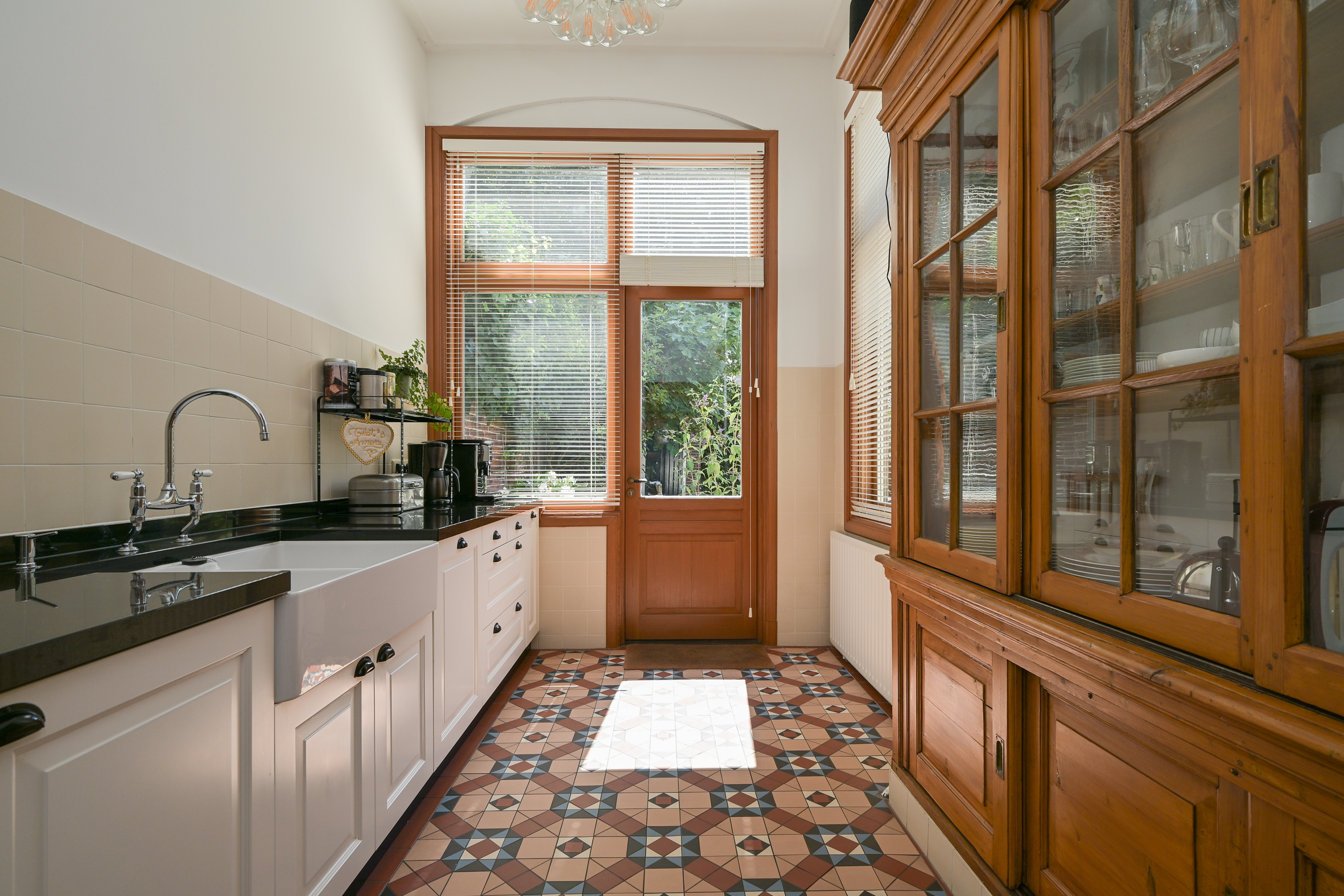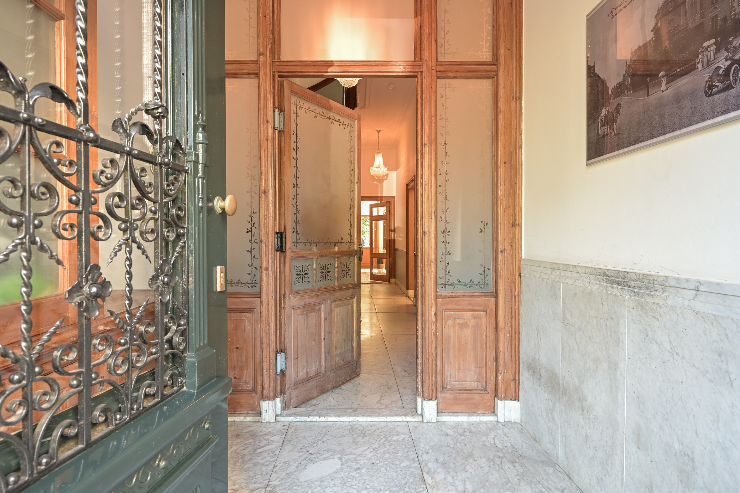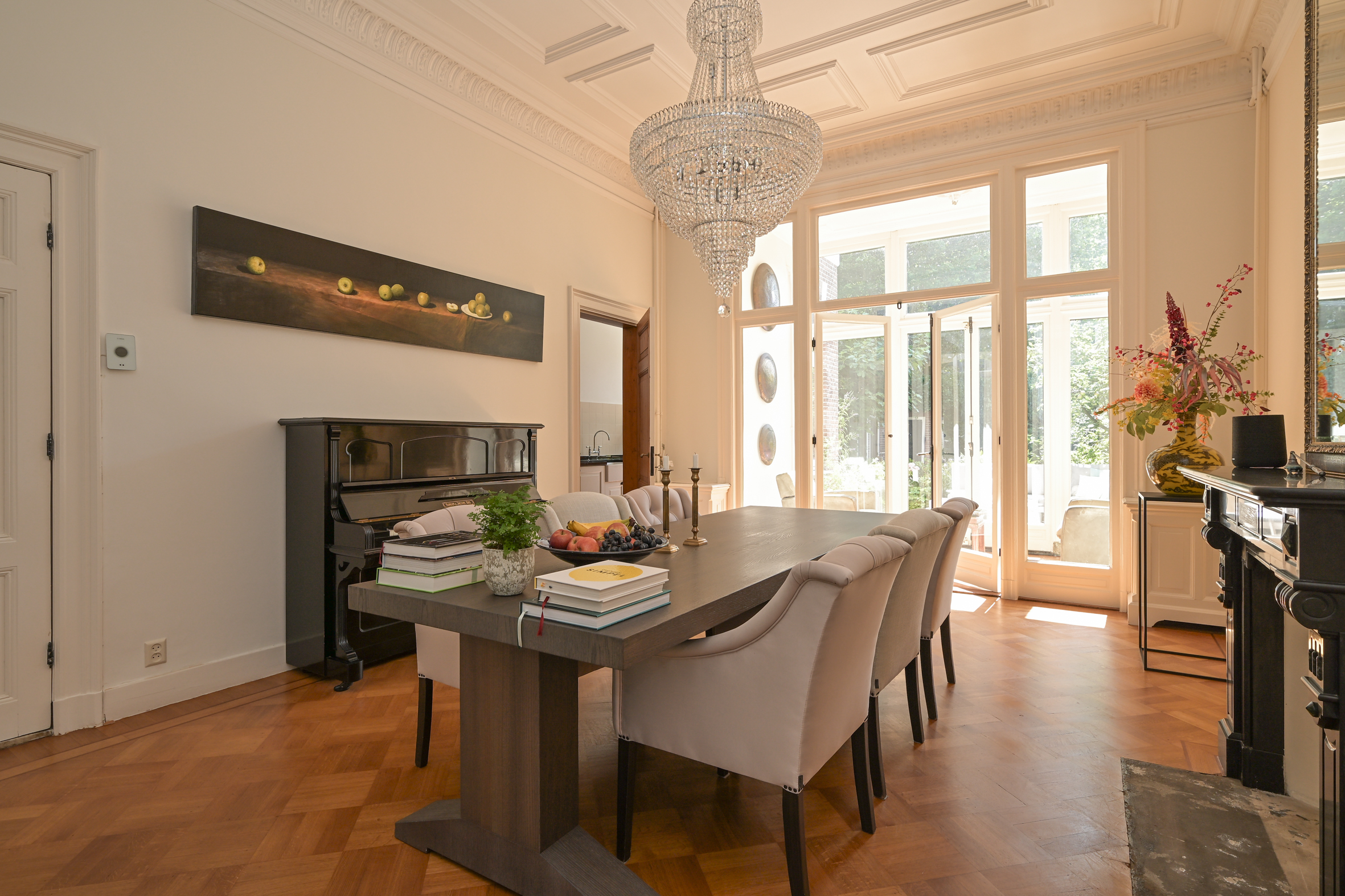 The front door opens to a spacious vestibule with an anti-draught door to a wide hallway, both with marble flooring, and a modern guest lavatory. There are two generous reception rooms separated by sliding doors framed by built-in storage, each with high moulded plaster ceilings, beautiful parquet flooring, and marble mantels. The front room features a wood-burning fireplace; the one facing the back has double doors to a sun room and open access to a huge modern kitchen outfitted with integrated appliances as well as a stunning original built-in crockery cupboard. Both back rooms have doors to the large sunny garden with storage sheds and a back entrance. There is also a 14m2 standing height cellar under the kitchen.