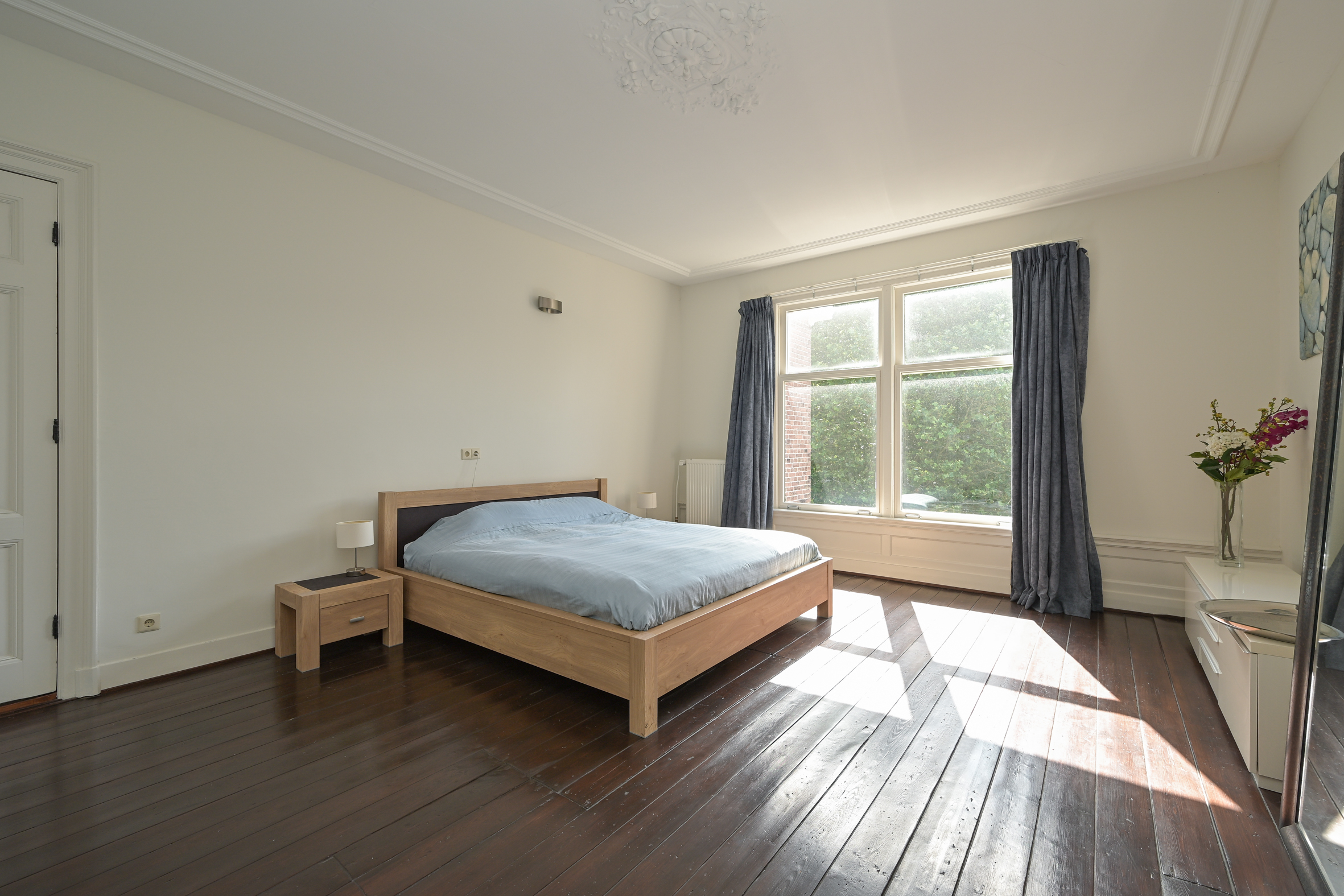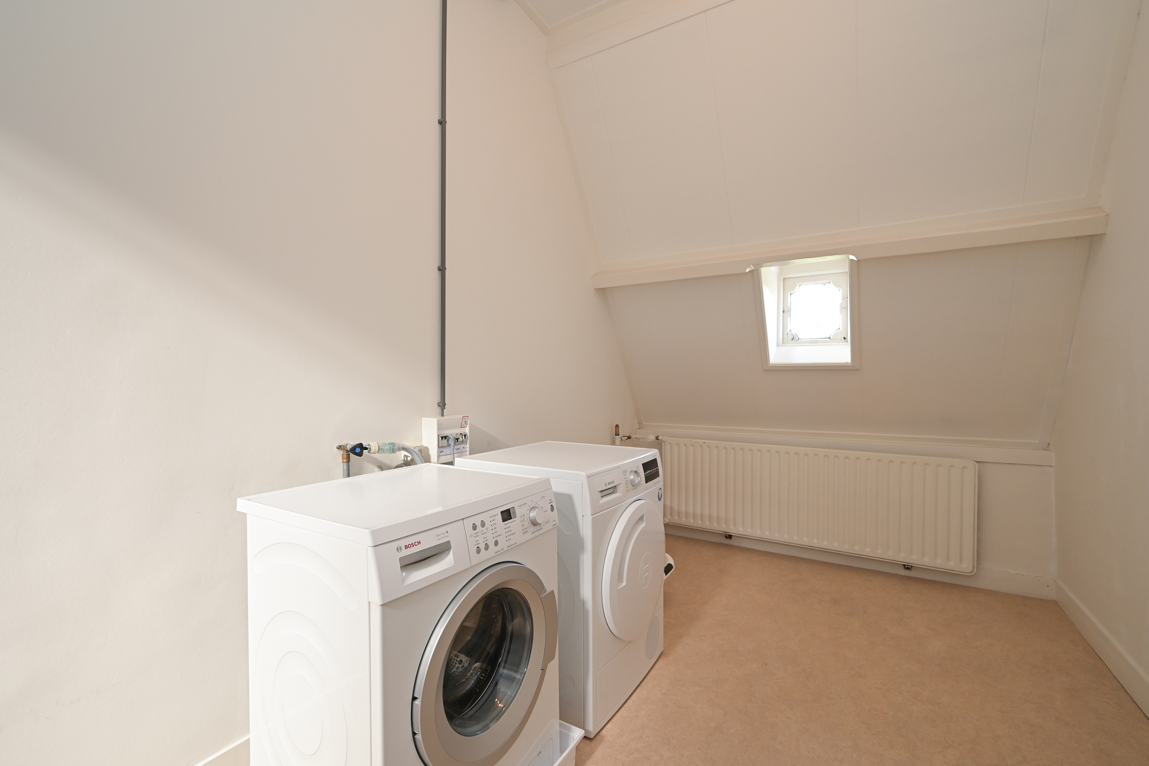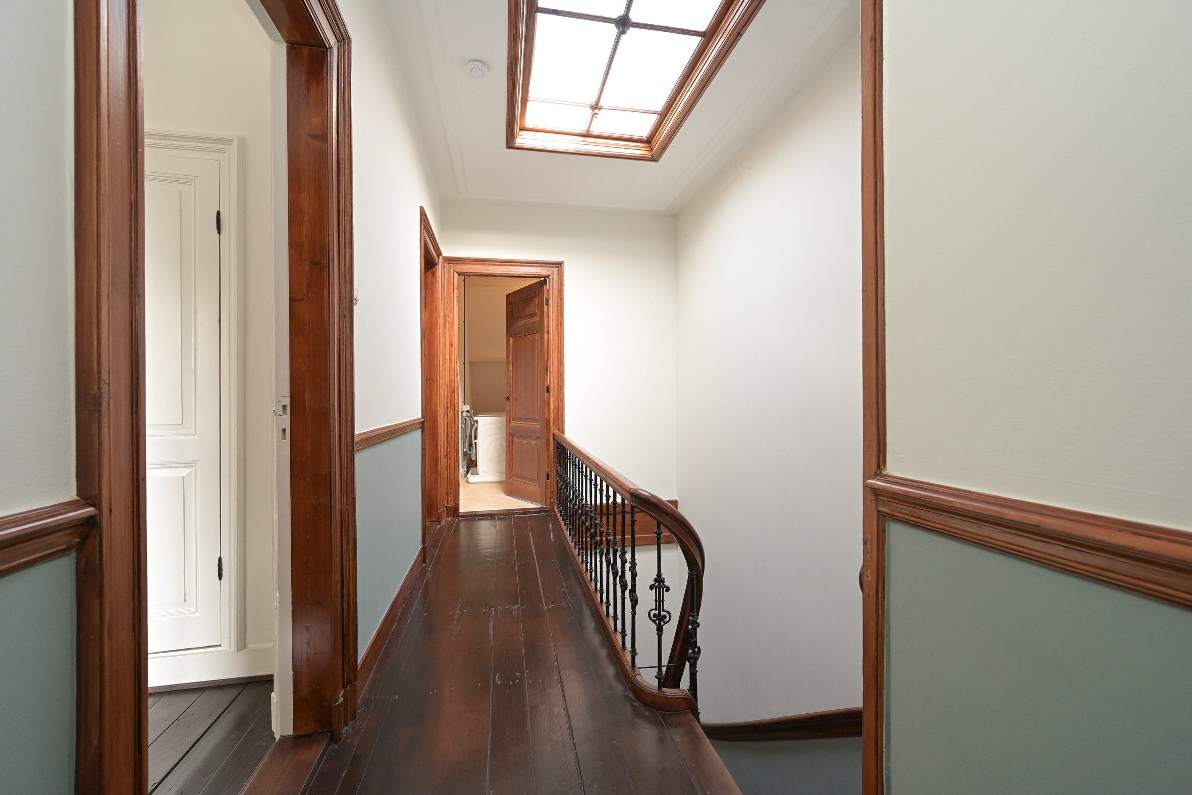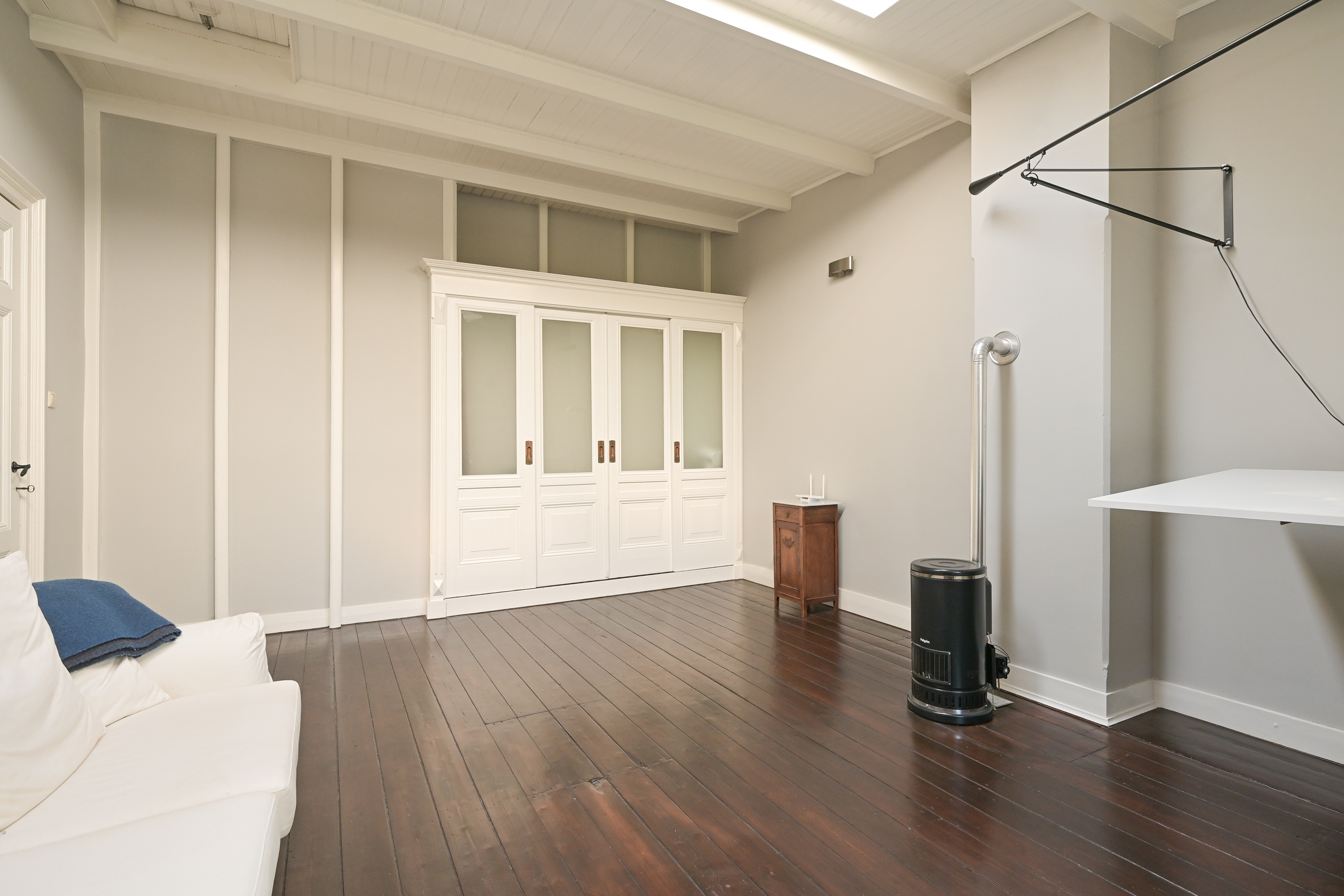 The 2nd floor (surface area ca. 88 m2, ceiling height 2.97 meters) has wooden flooring throughout and a landing that is bathed in sunlight from a large skylight, plus a separate wc. There is an especially bright, good-sized front room with a dormer and high ceiling, as well as a big back bedroom - both with built-in wardrobes. Two smaller rooms, of which one houses the laundry, offer the possibility of creating a second bathroom, see artist impresion (cost circa €16.000 - €18.000; quotation available). The back rooms have partially unobstructed views over the iconic Haganum building.