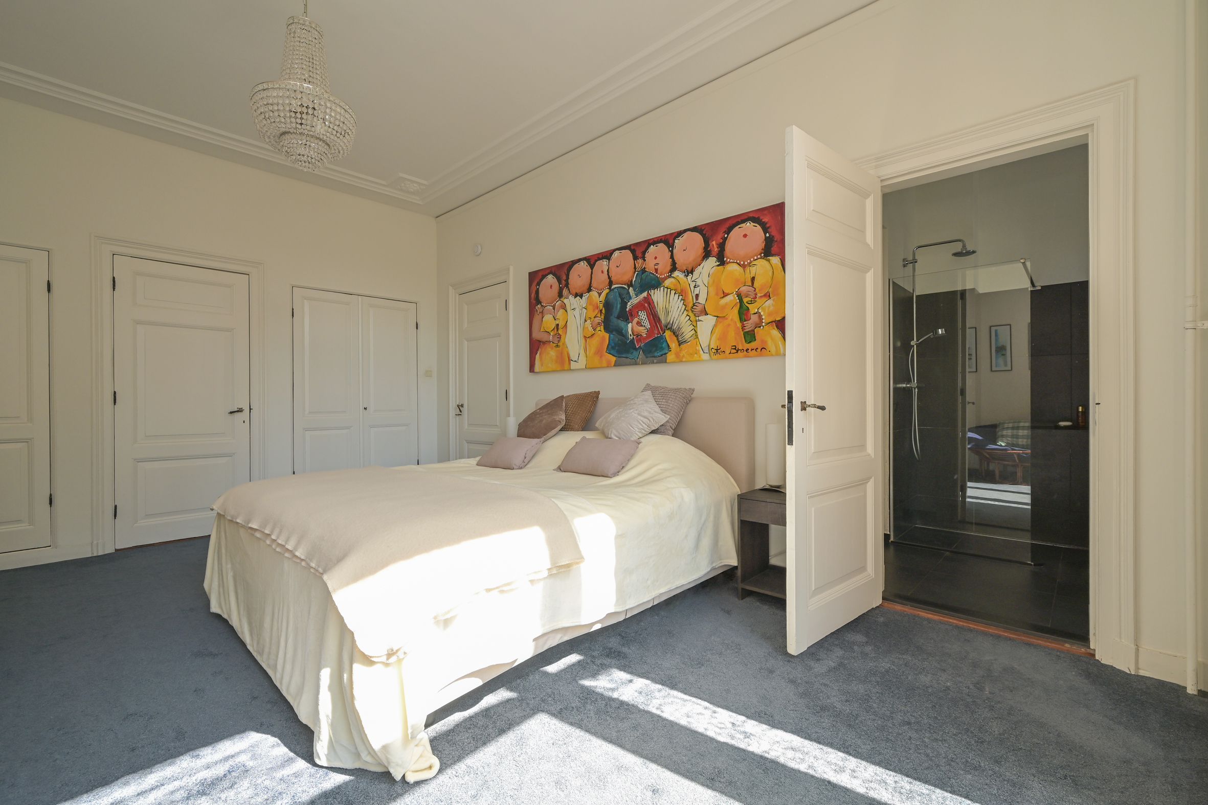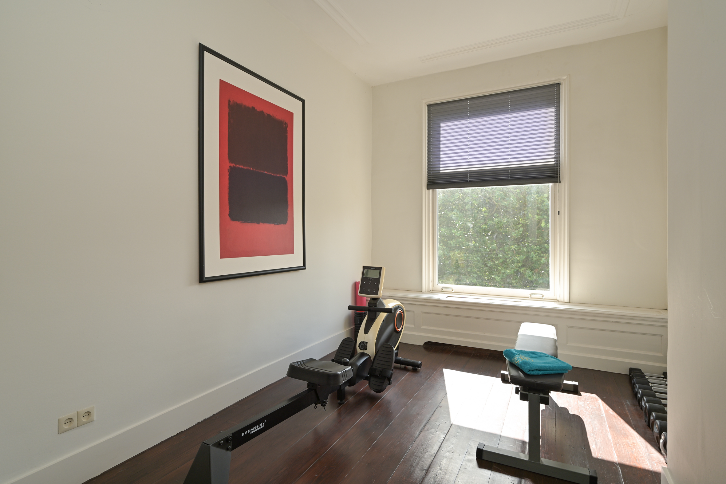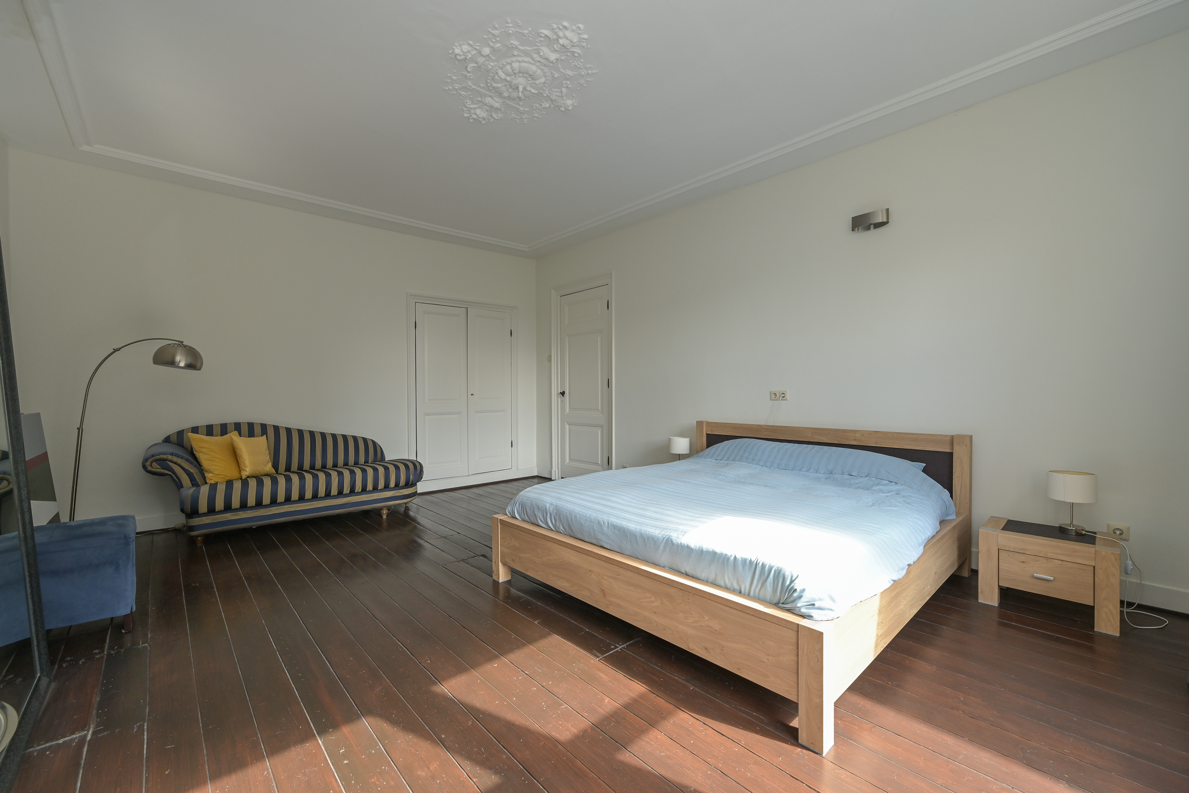 The 2nd floor (surface area ca. 88 m2, ceiling height 2.97 meters) has wooden flooring throughout and a landing that is bathed in sunlight from a large skylight, plus a separate wc. There is an especially bright, good-sized front room with a dormer and high ceiling, as well as a big back bedroom - both with built-in wardrobes. Two smaller rooms, of which one houses the laundry, offer the possibility of creating a second bathroom, see artist impresion (cost circa €16.000 - €18.000; quotation available). The back rooms have partially unobstructed views over the iconic Haganum building.