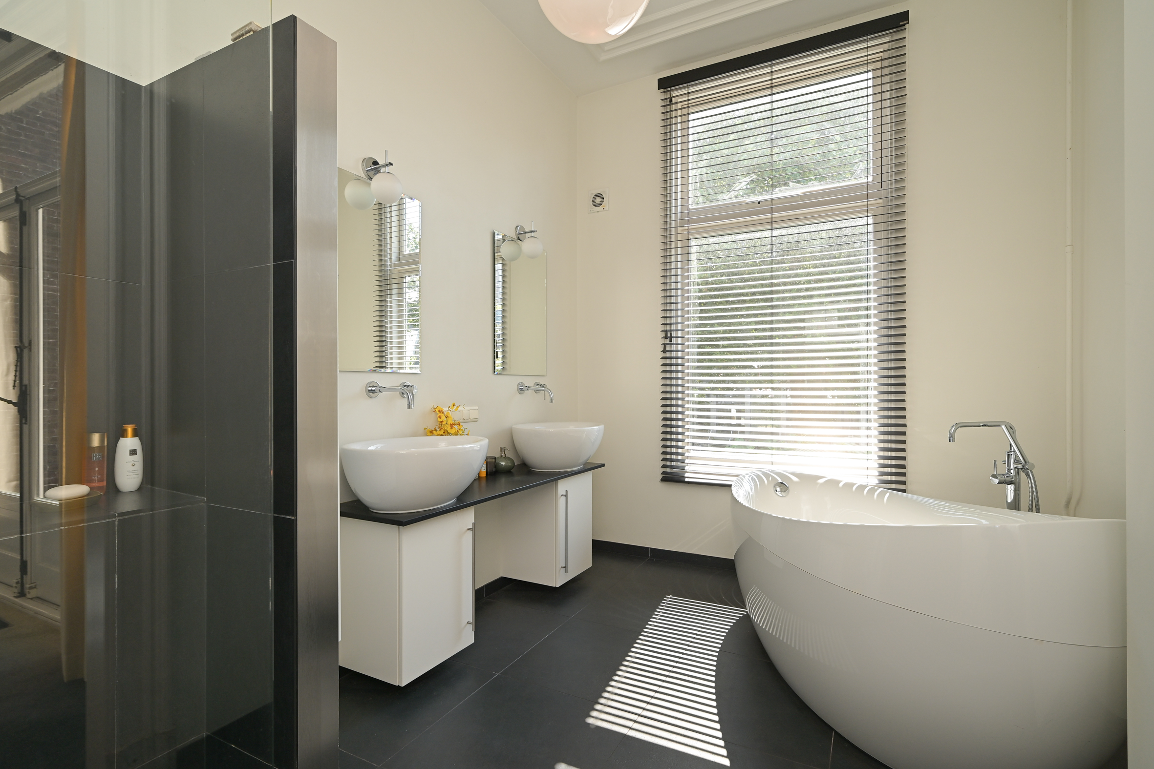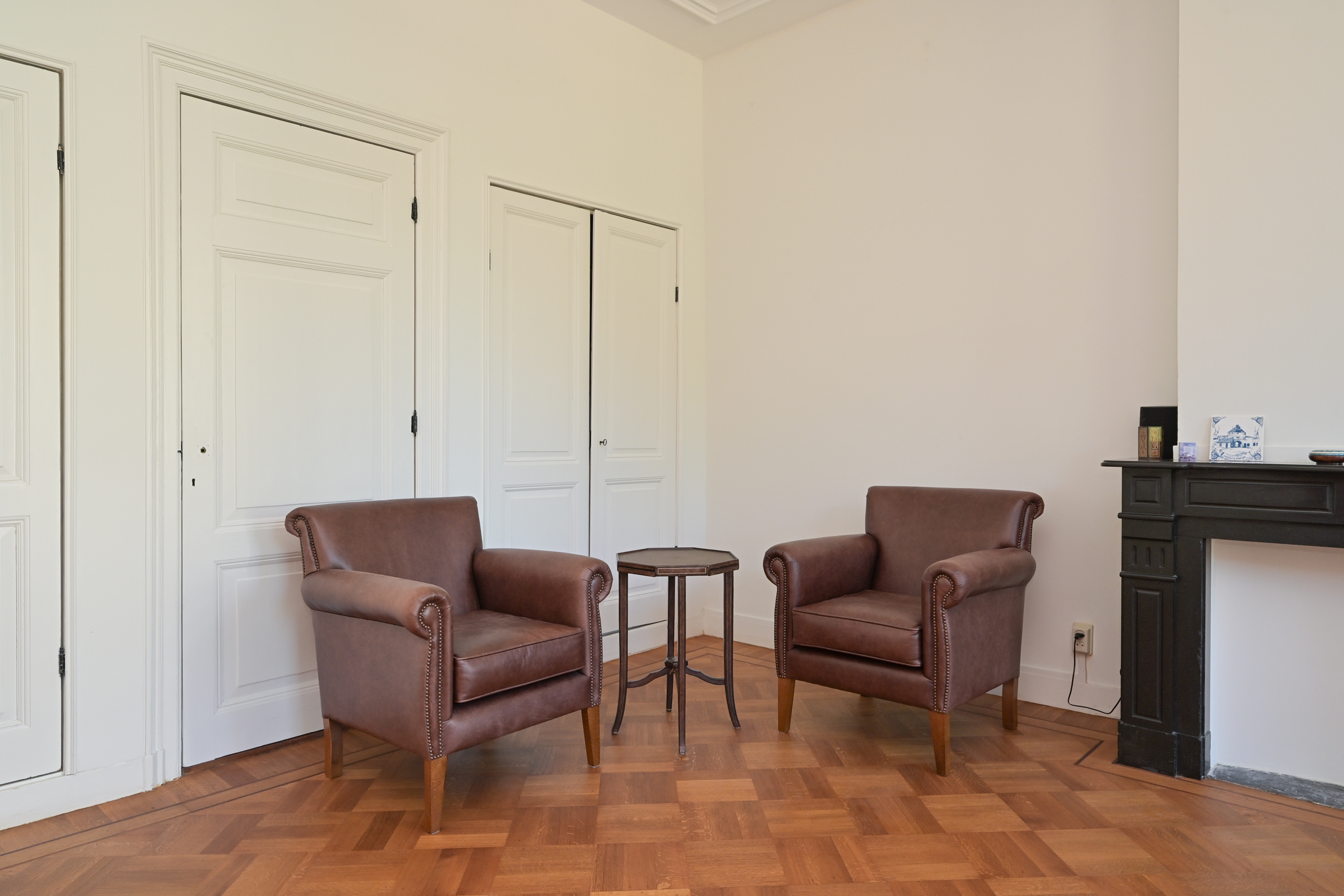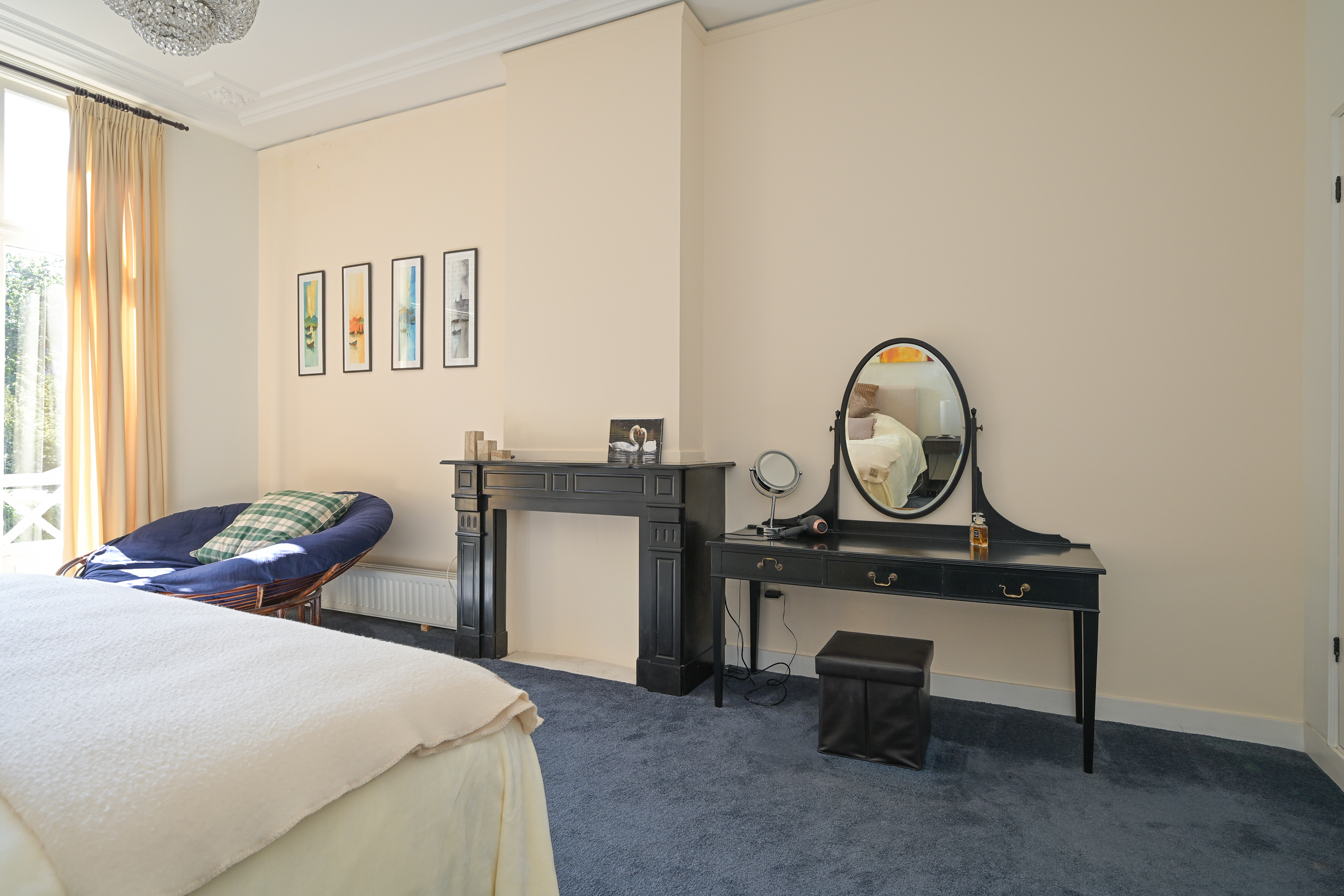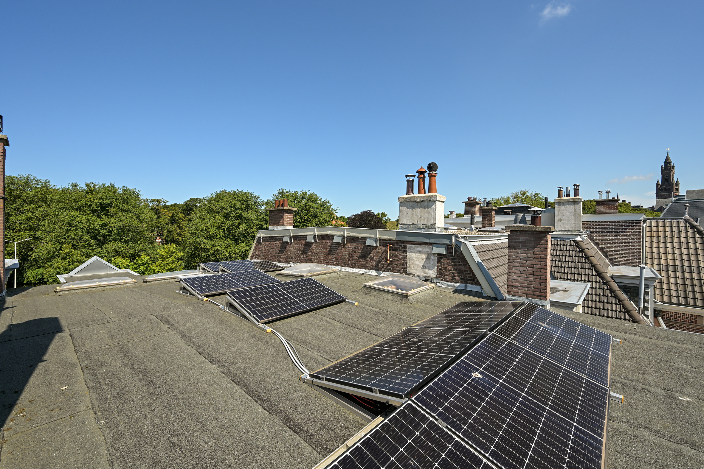 The 2nd floor (surface area ca. 88 m2, ceiling height 2.97 meters) has wooden flooring throughout and a landing that is bathed in sunlight from a large skylight, plus a separate wc. There is an especially bright, good-sized front room with a dormer and high ceiling, as well as a big back bedroom - both with built-in wardrobes. Two smaller rooms, of which one houses the laundry, offer the possibility of creating a second bathroom, see artist impresion (cost circa €16.000 - €18.000; quotation available). The back rooms have partially unobstructed views over the iconic Haganum building.