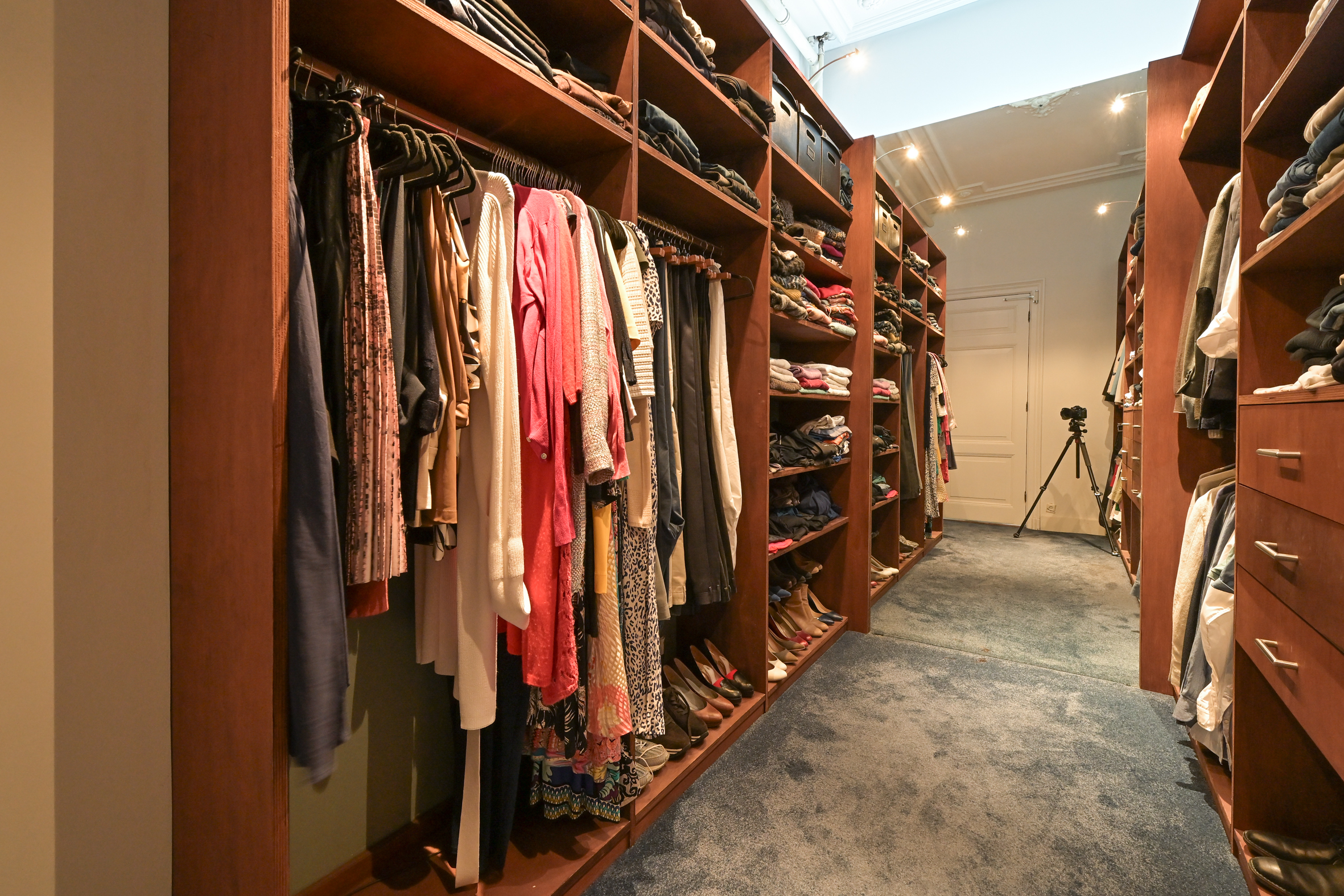 At the top of the stairs is a landing with a separate modern wc. There is a large front room with an unimpeded view and a back room with access to a balcony, both with high moulded ceilings, marble mantels, and fitted wardrobes. A third room, currently in use as a walk-in closet, could function as a study or extra bedroom. The complete modern bathroom, with bath, walk-in shower, double vanity, and heated floors is accessible from both the landing and the back bedroom.