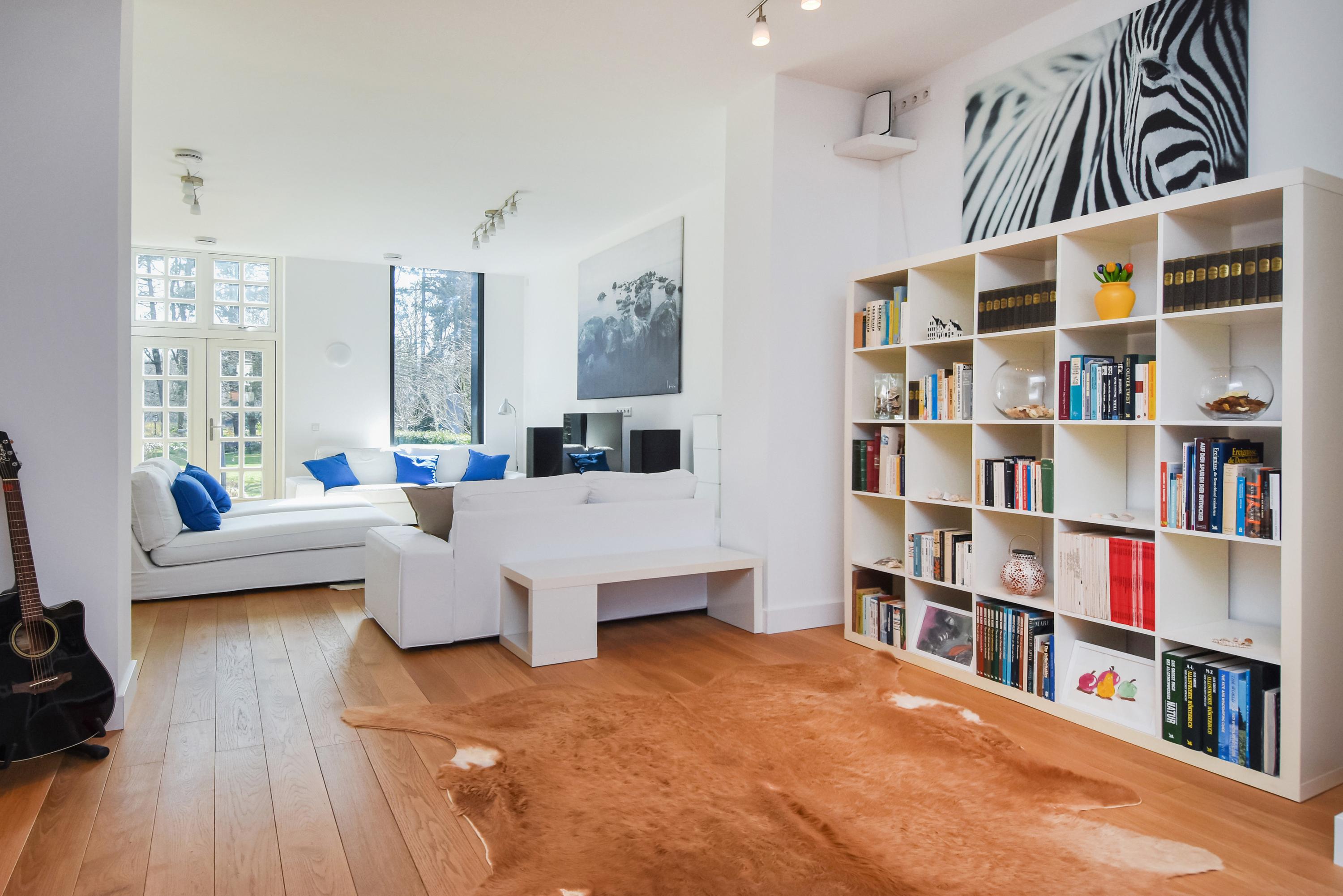 Upon entering the bright hallway, you are welcomed by a spacious, high-end designer kitchen featuring a central cooking island, premium Miele appliances, and every conceivable luxury – including a built-in climate cabinet for your wine. From the kitchen, you reach the sunny living room, where high ceilings and large windows flood the space with natural light. Elegant double doors open onto the spacious, sunny garden, perfect for relaxation and outdoor living.
