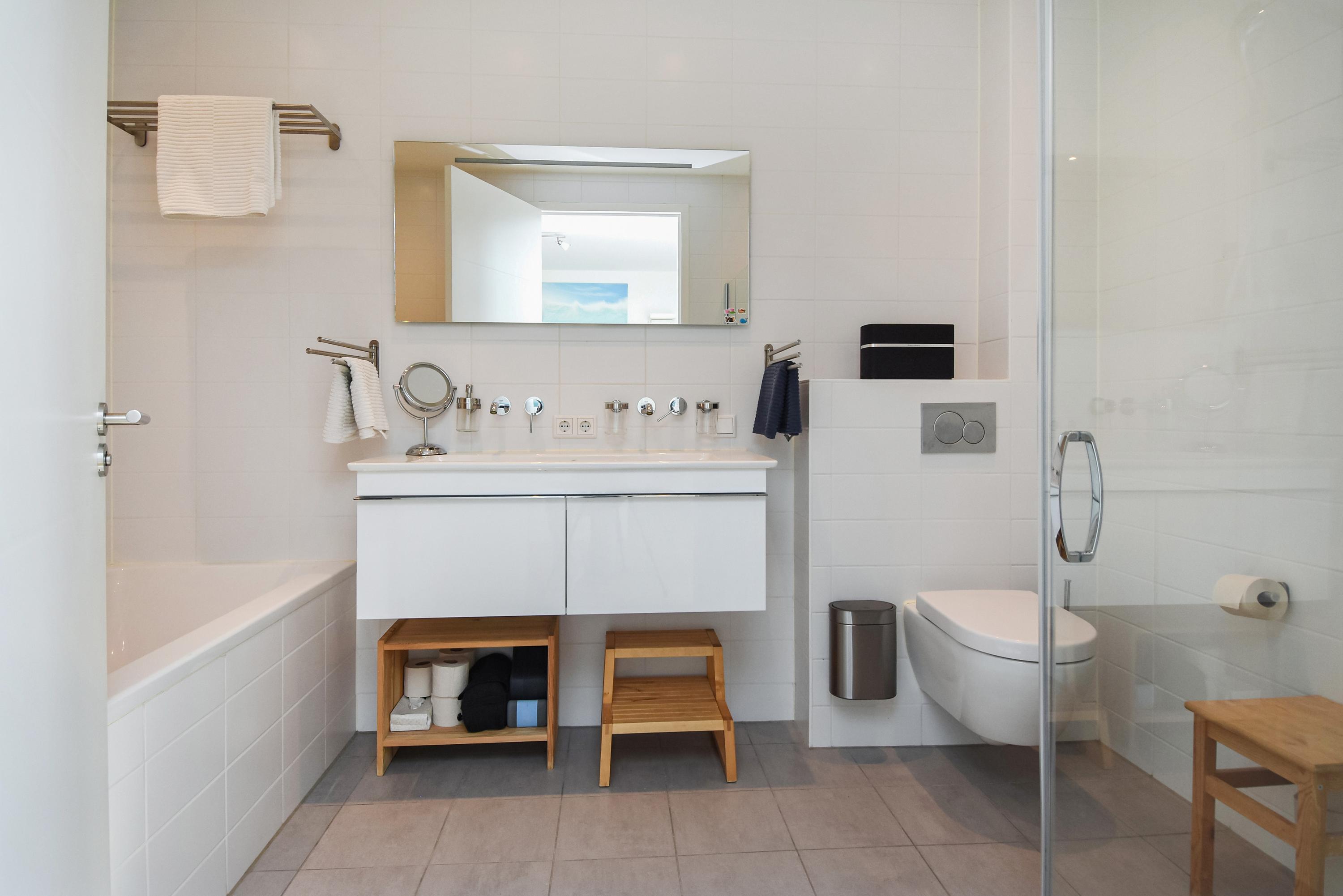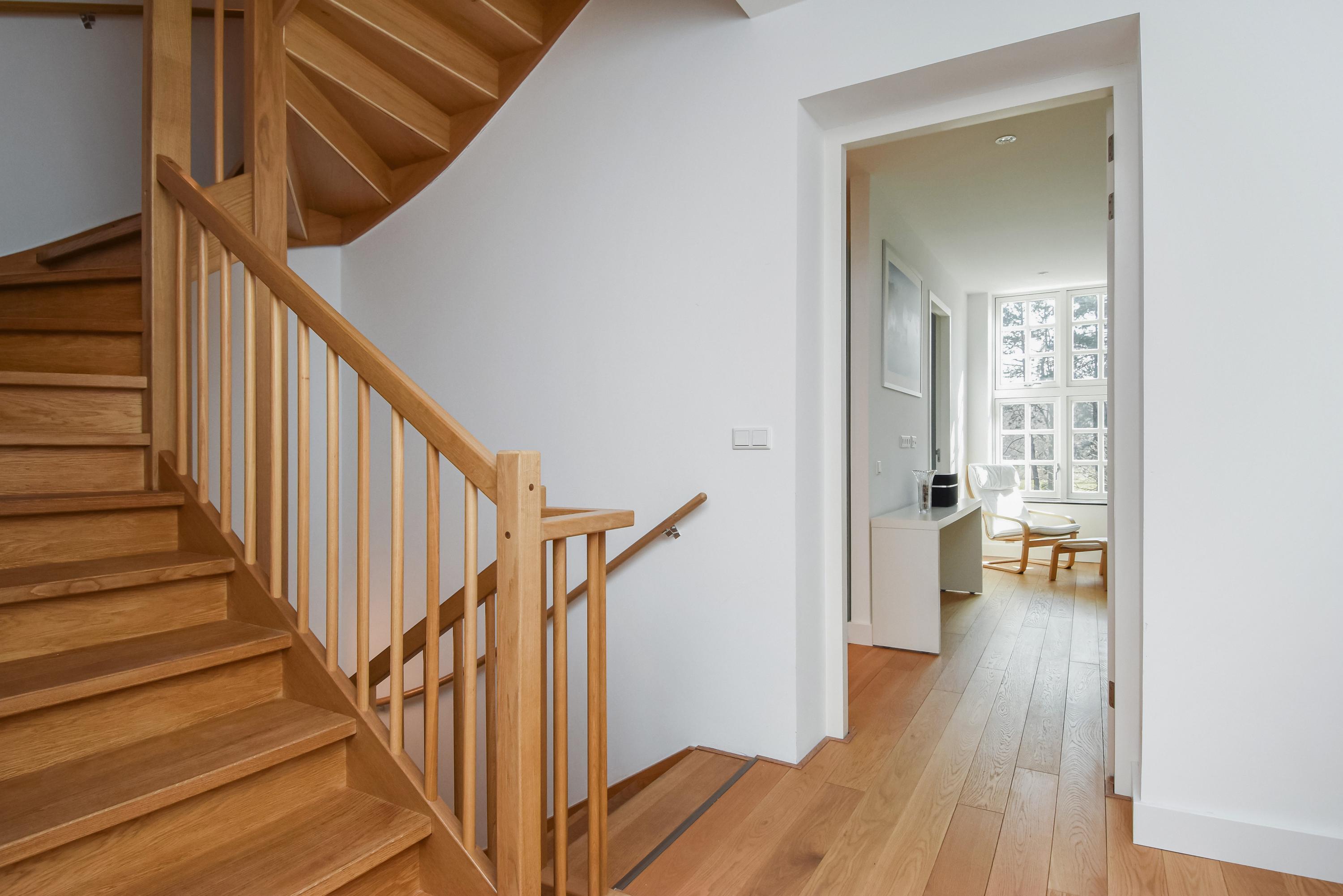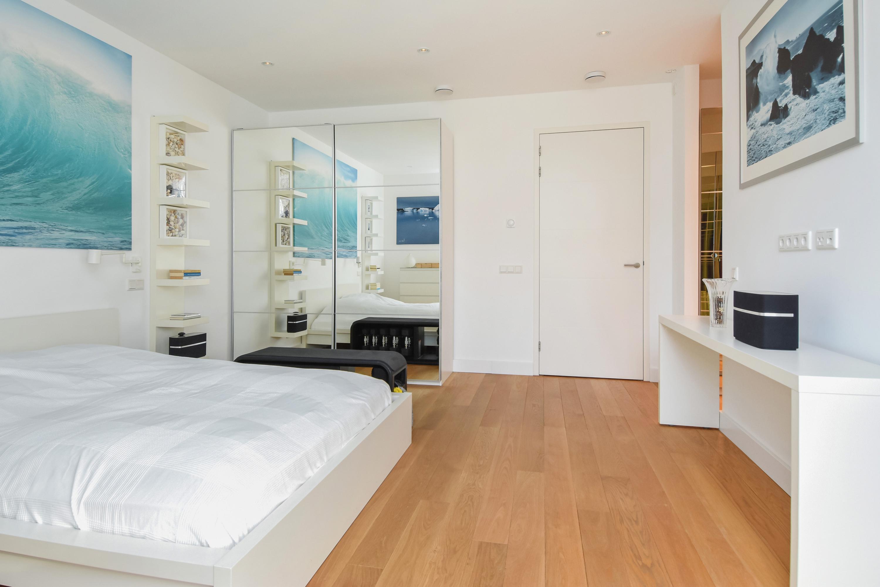 The first floor houses three spacious bedrooms and two luxurious bathrooms. The master bedroom of approximately 20 m² includes a generous walk-in closet and a private en-suite bathroom, equipped with a walk-in shower, bathtub, double washbasin and toilet.