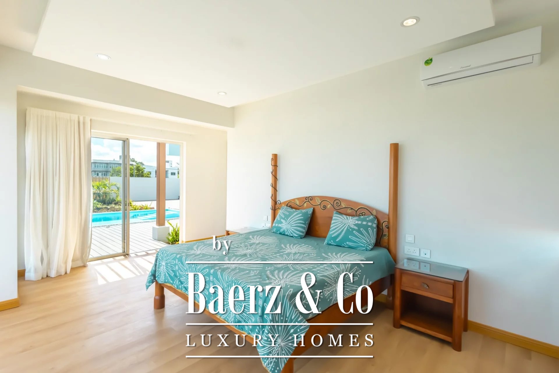 A spacious terrace extends toward a large swimming pool, framed by mature greenery and designed for outdoor dining or quiet contemplation. Air conditioning, double glazing, and thoughtful amenities add comfort without ostentation. Garden and pool views enhance the sense of sanctuary, while the setting invites a slower pace of life within a secure estate in Albion. This is a property attuned to those who value discretion and authentic quality.