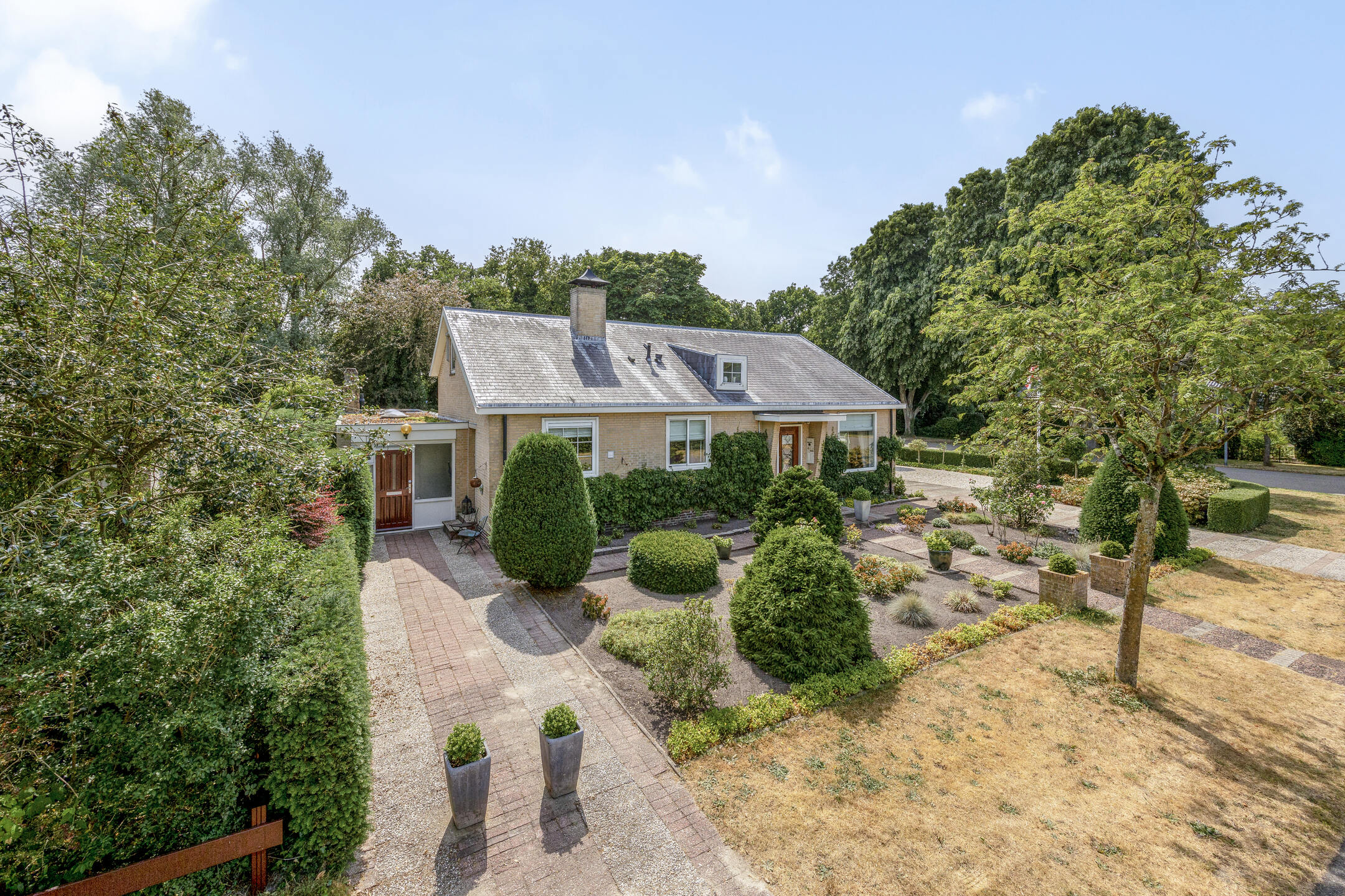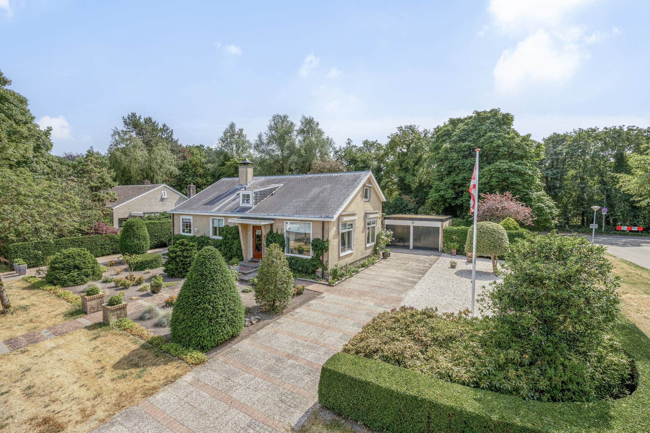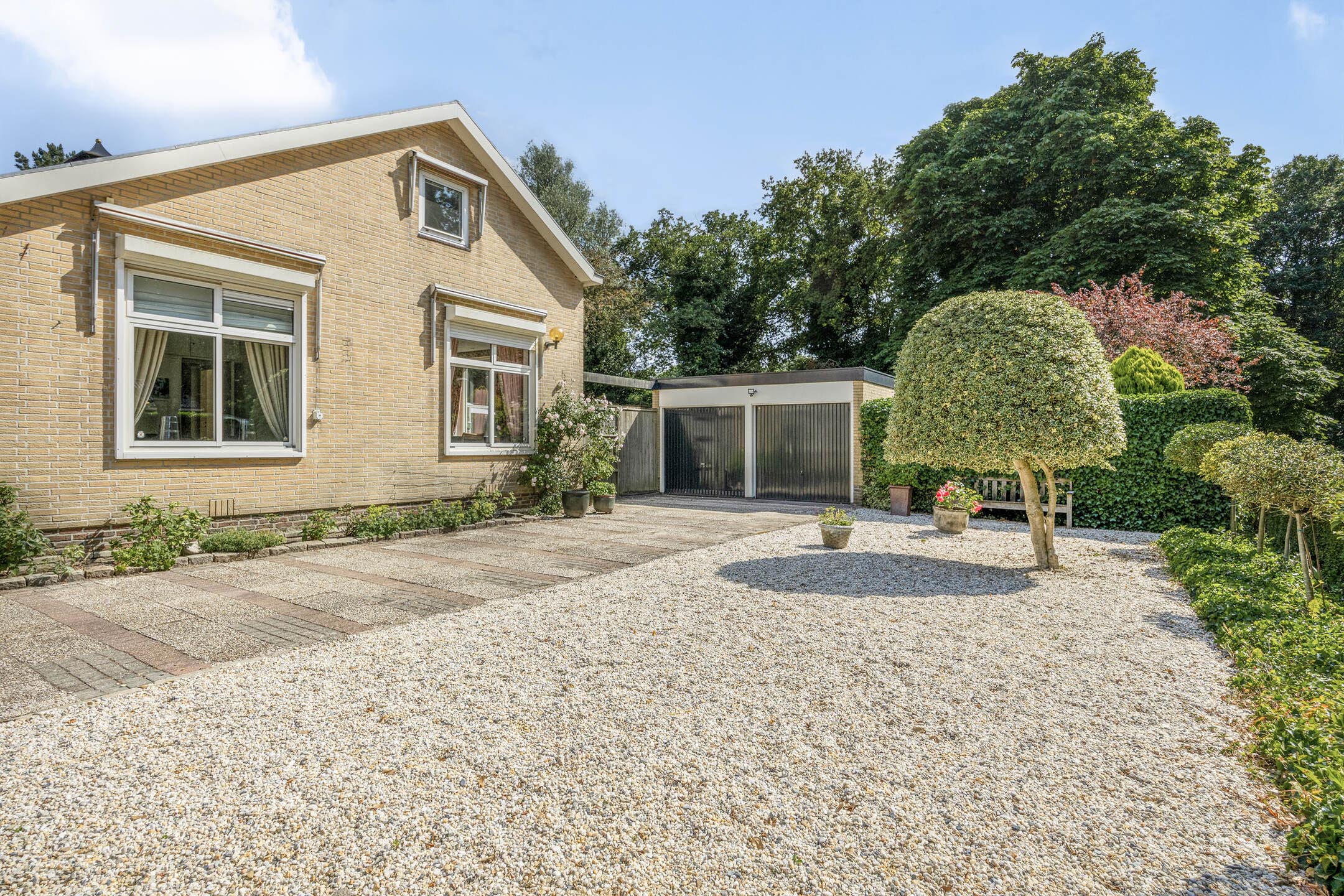 The spacious driveway offers space for several cars, in addition to the detached double garage and a lush front garden.