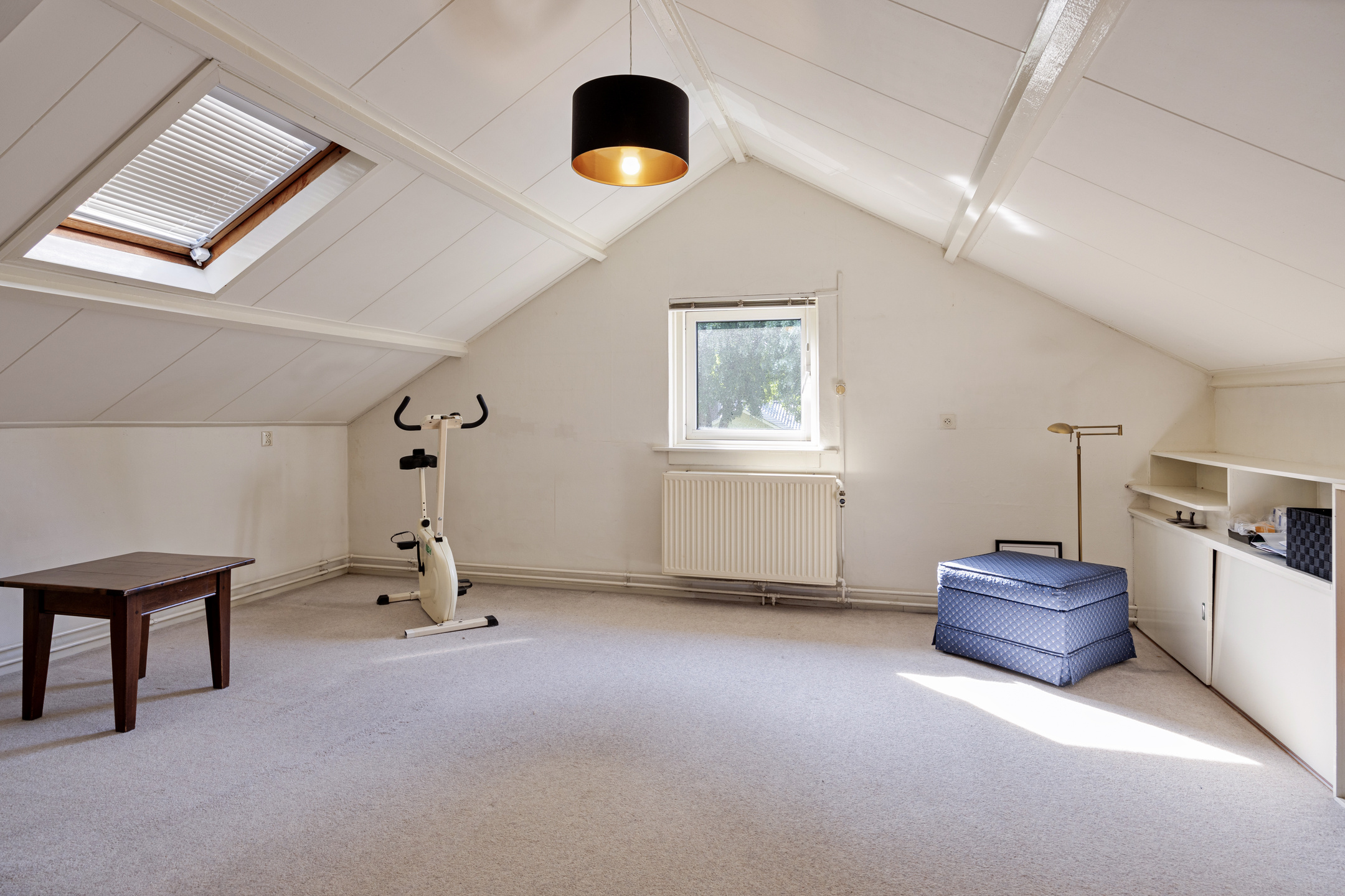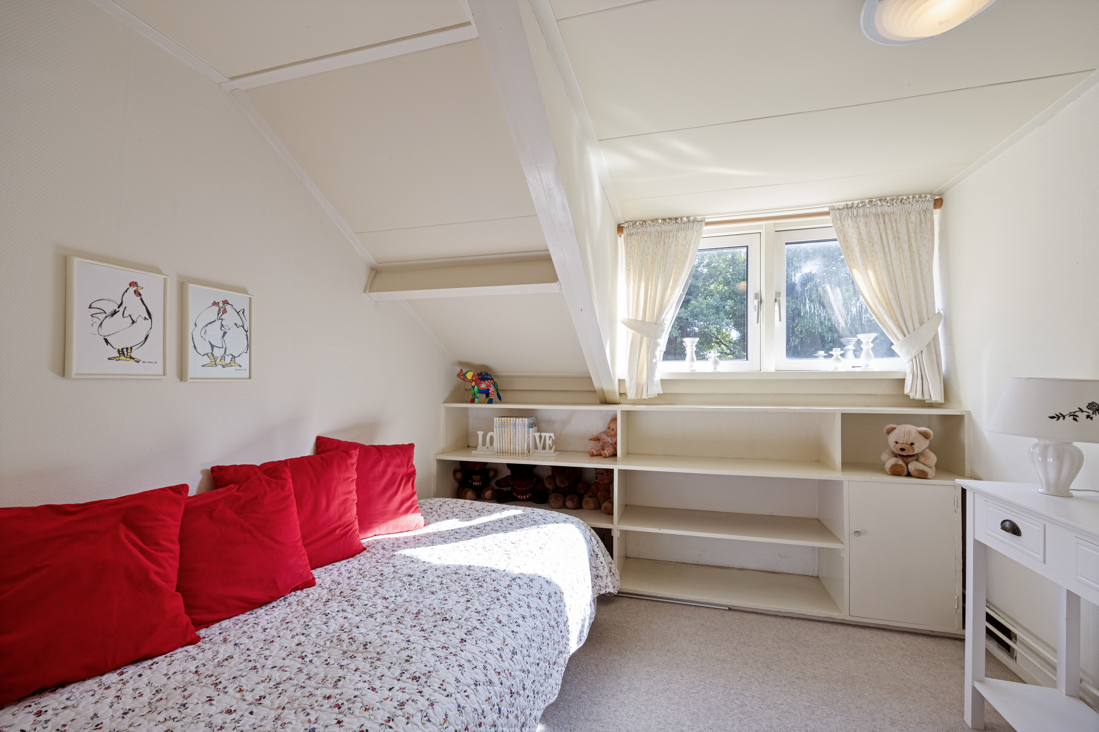 1 Large bedroom on the corner on the east side with the gable roof in view, storage spaces behind the knee walls and a Velux roof window.