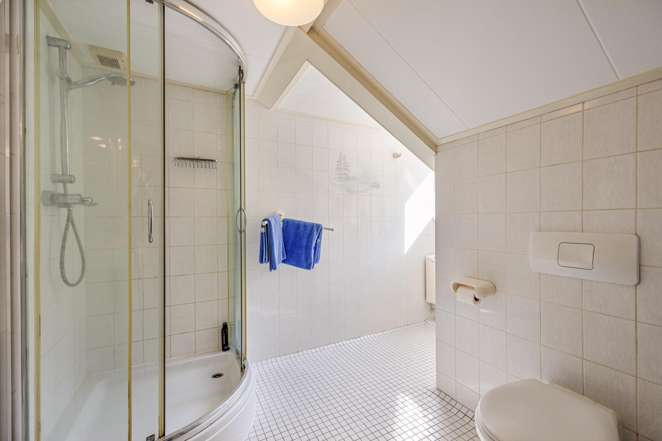 The bathroom is fitted with a shower cubicle, sink with surround, 2nd WC wall closet, light tiling and a plastic dormer window.