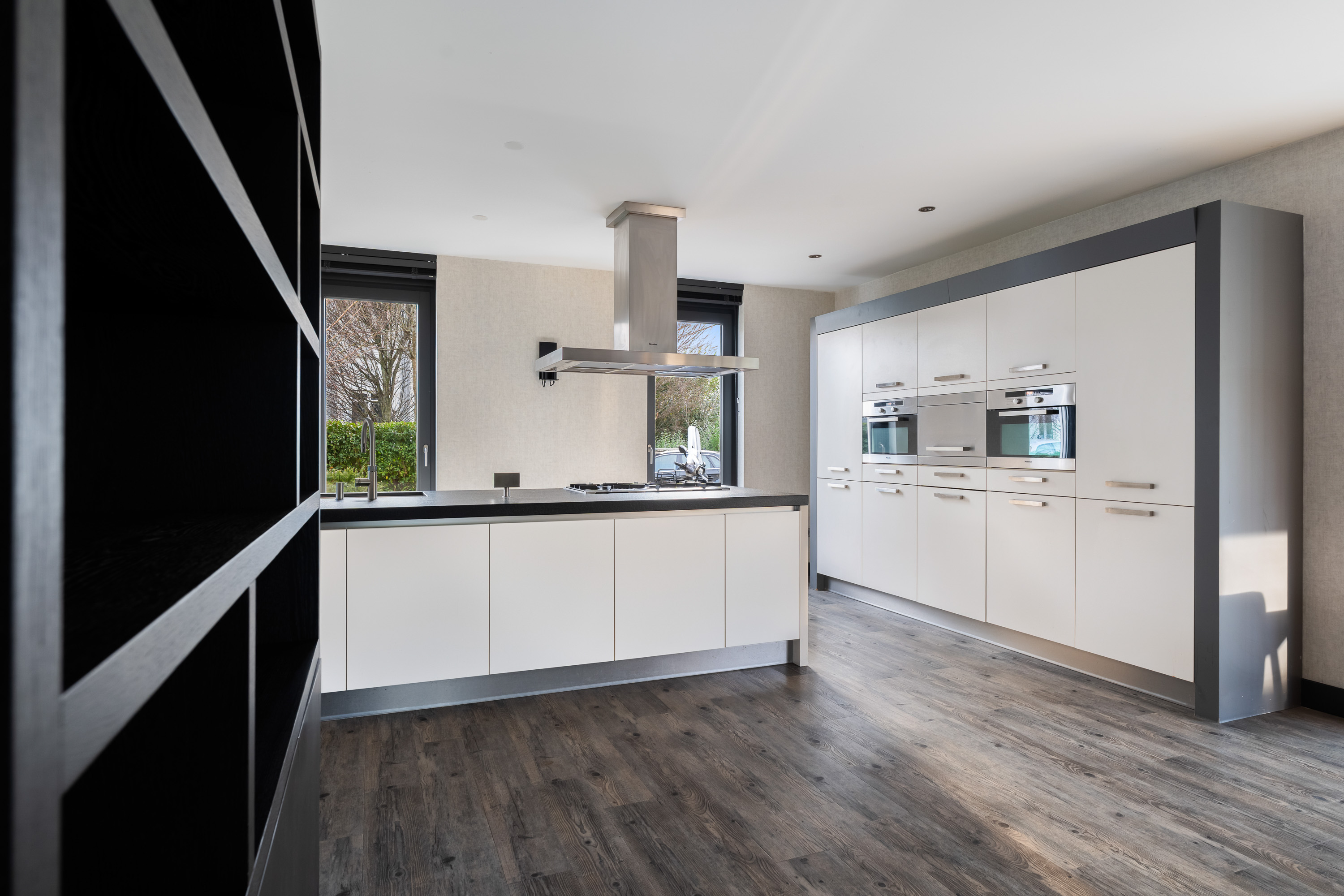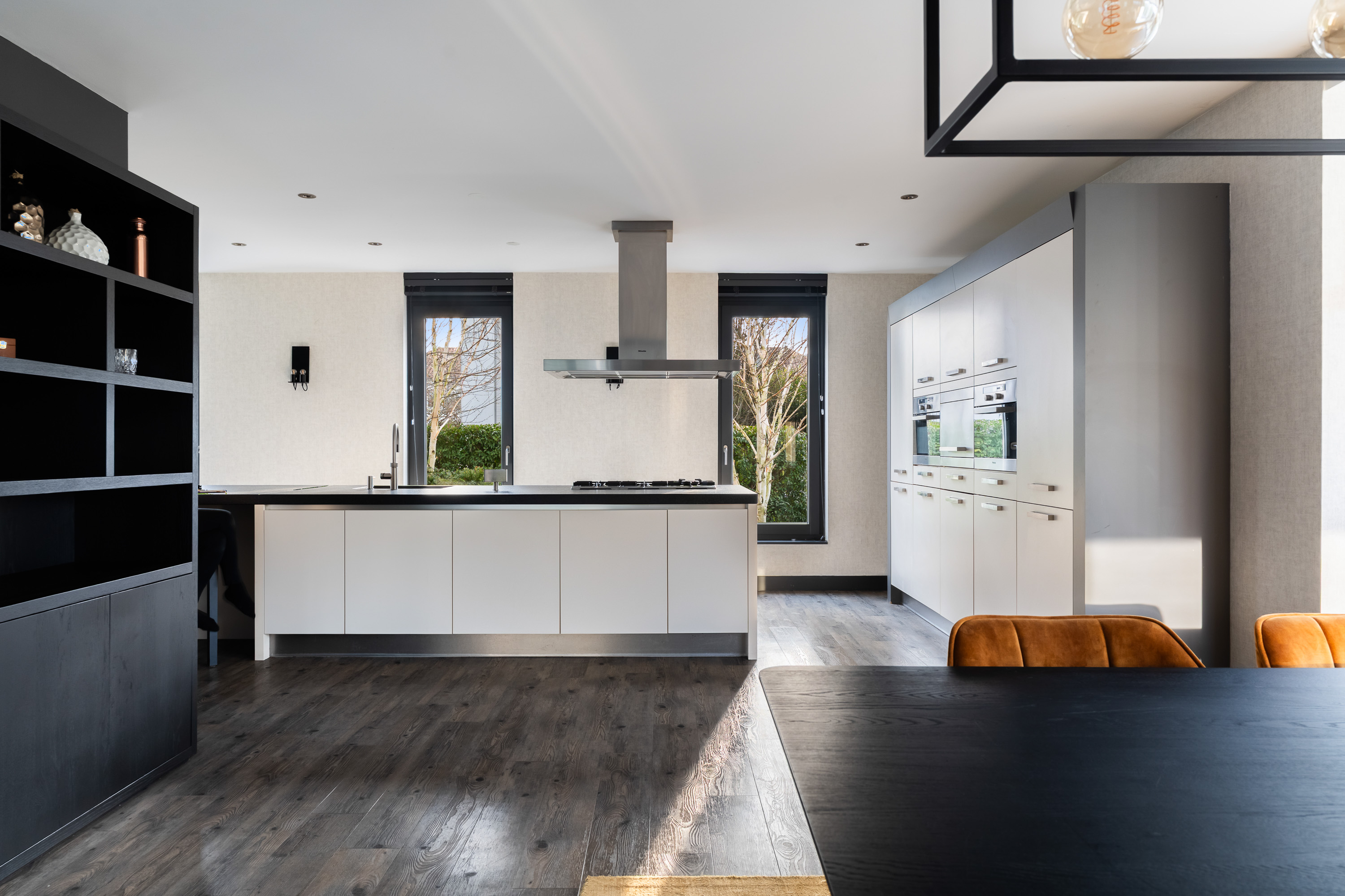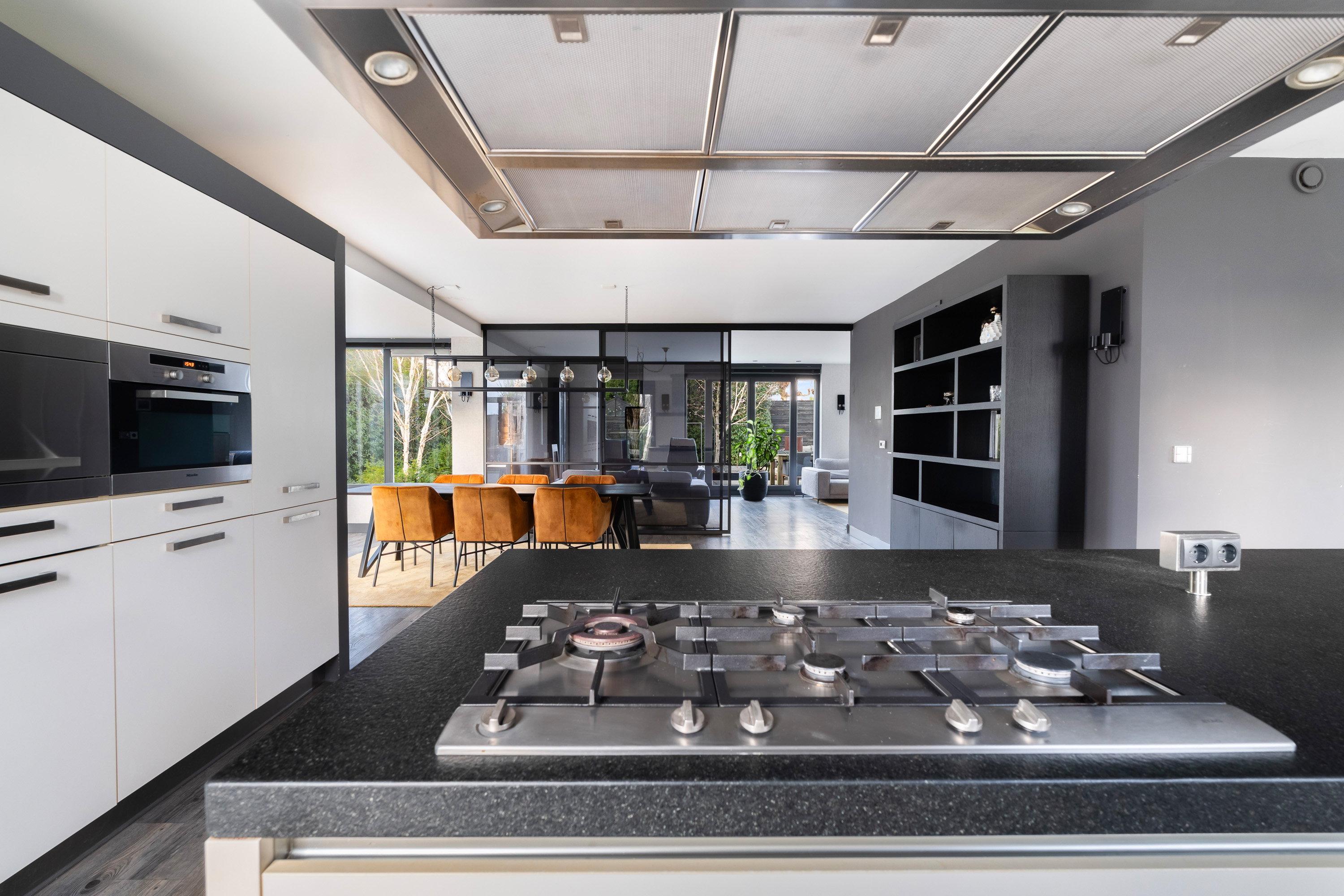 The luxurious open-plan kitchen forms the heart of the home. The large cooking and seating island with a unique worktop invites you to enjoy extensive cooking, cosy breakfasts and long evenings of dining together. The kitchen is equipped with high-end Miele built-in appliances, including two combi ovens, a steam oven, a 5-burner gas hob with wok burner, a dishwasher and two fridge-freezer combinations.