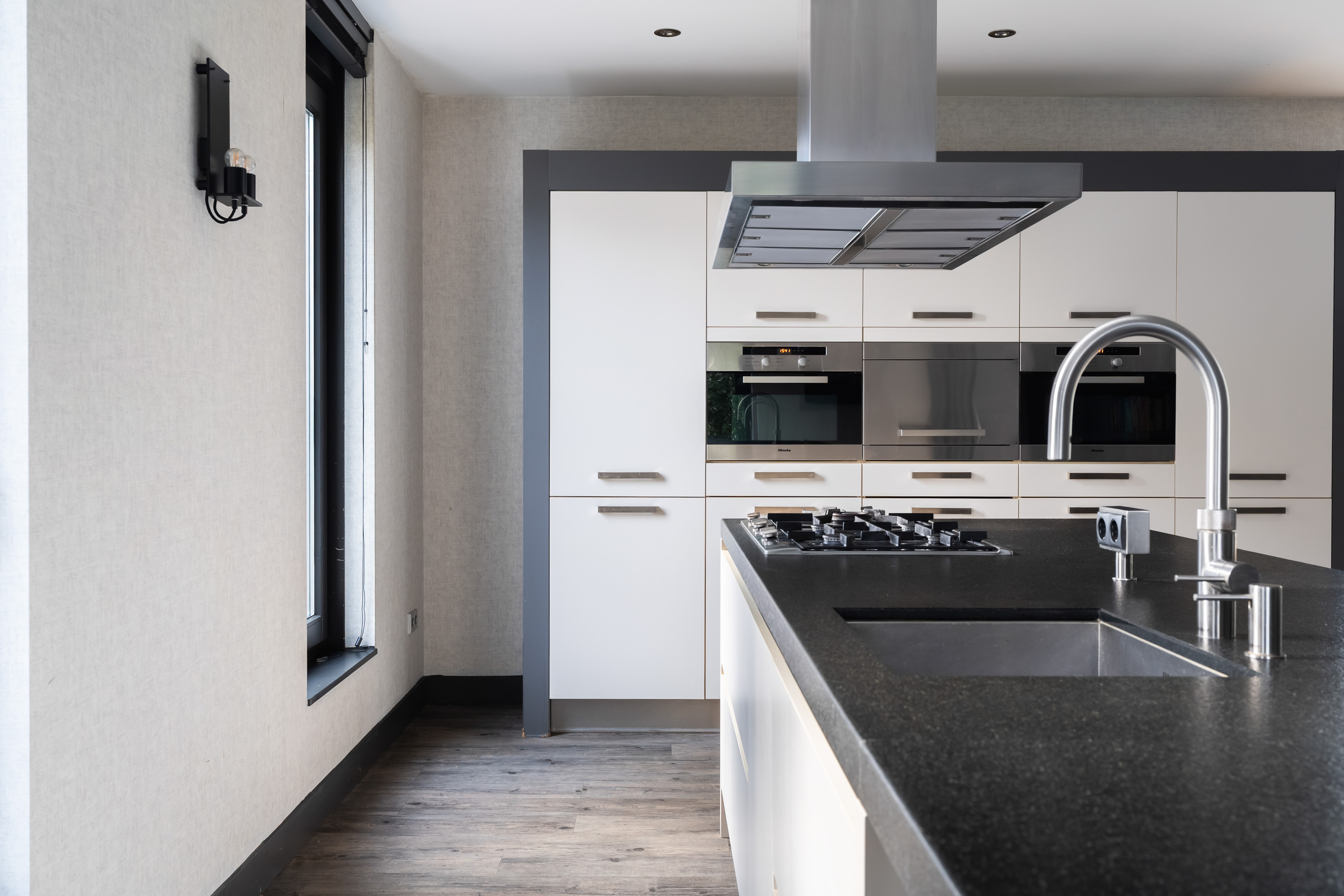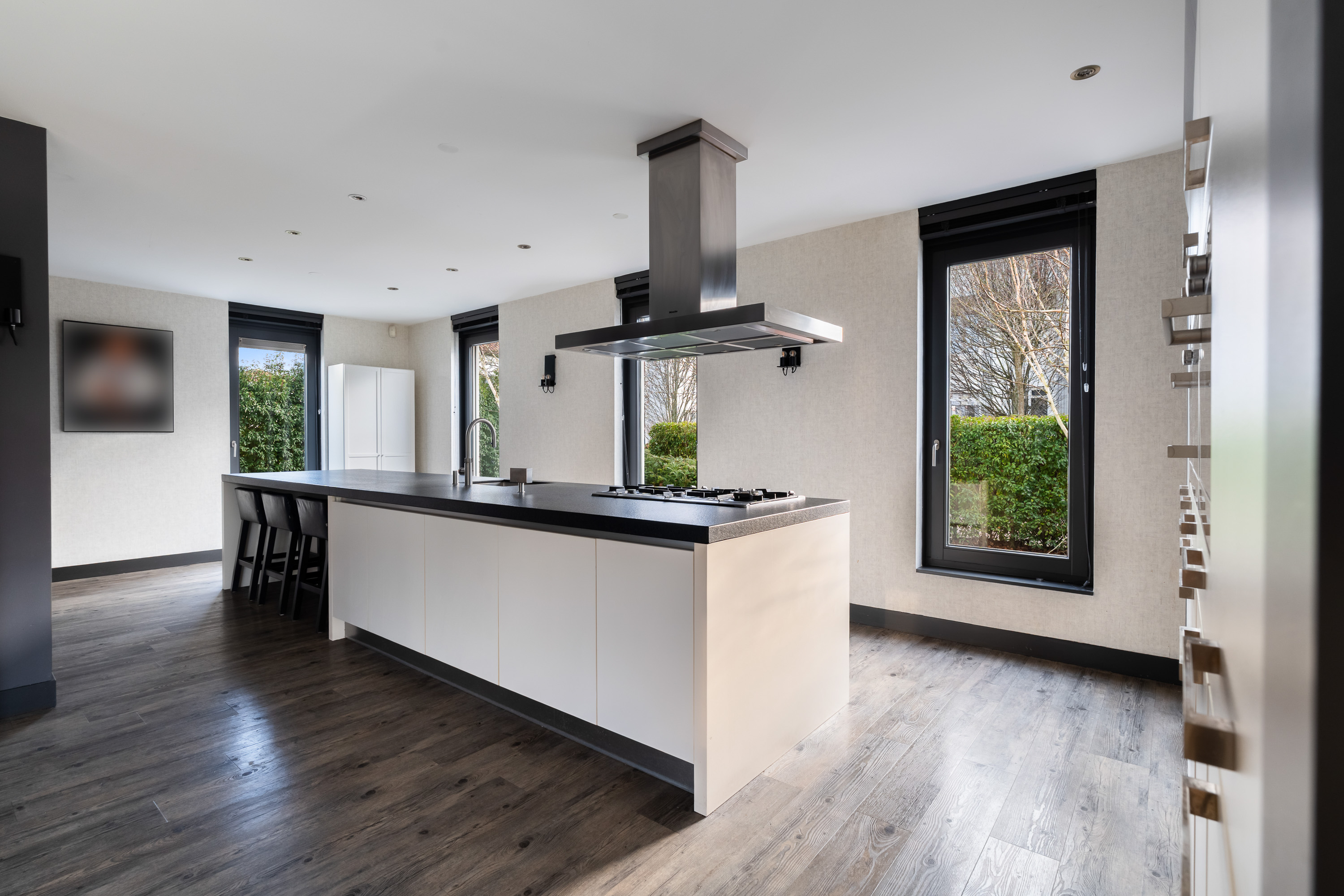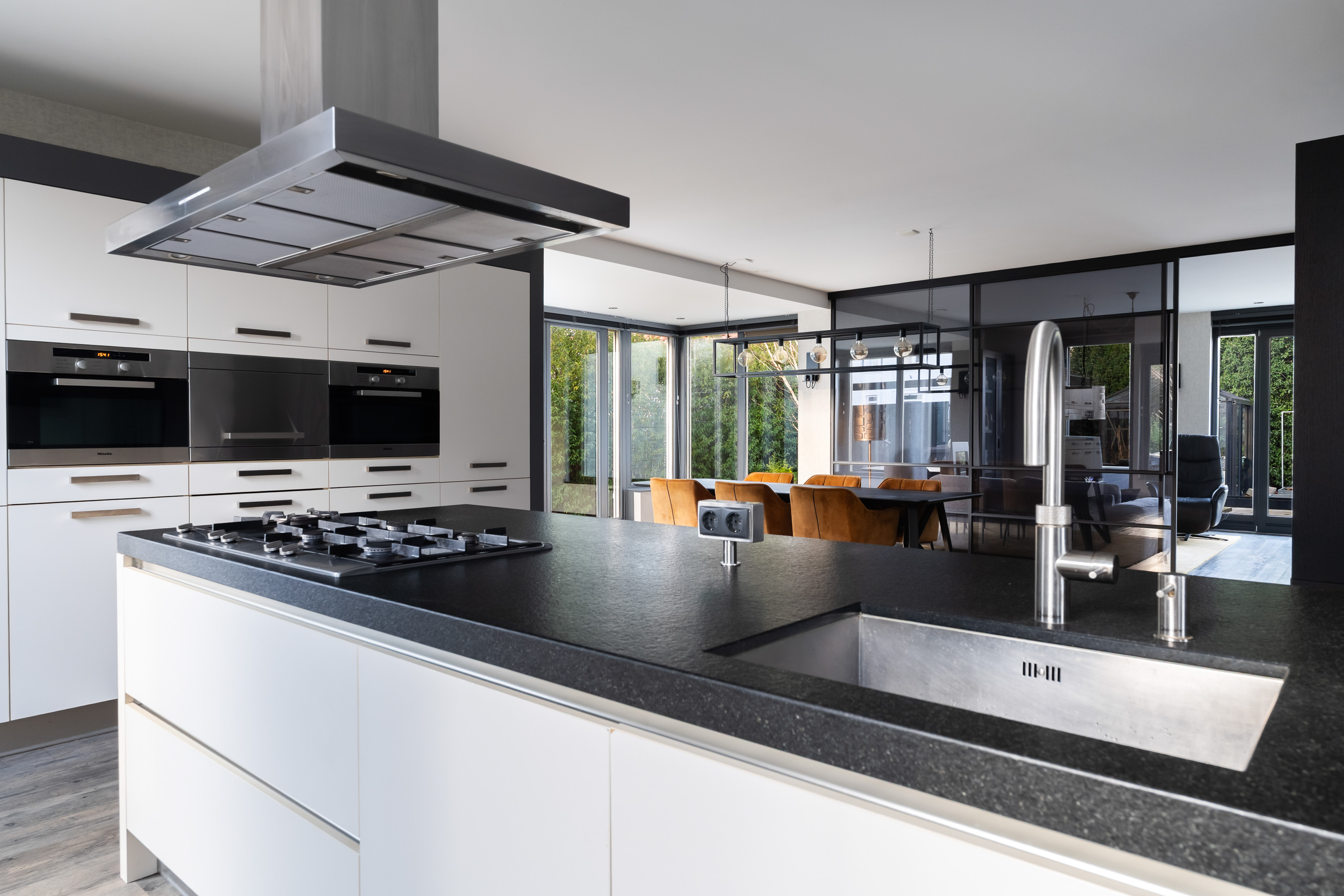 The luxurious open-plan kitchen forms the heart of the home. The large cooking and seating island with a unique worktop invites you to enjoy extensive cooking, cosy breakfasts and long evenings of dining together. The kitchen is equipped with high-end Miele built-in appliances, including two combi ovens, a steam oven, a 5-burner gas hob with wok burner, a dishwasher and two fridge-freezer combinations.