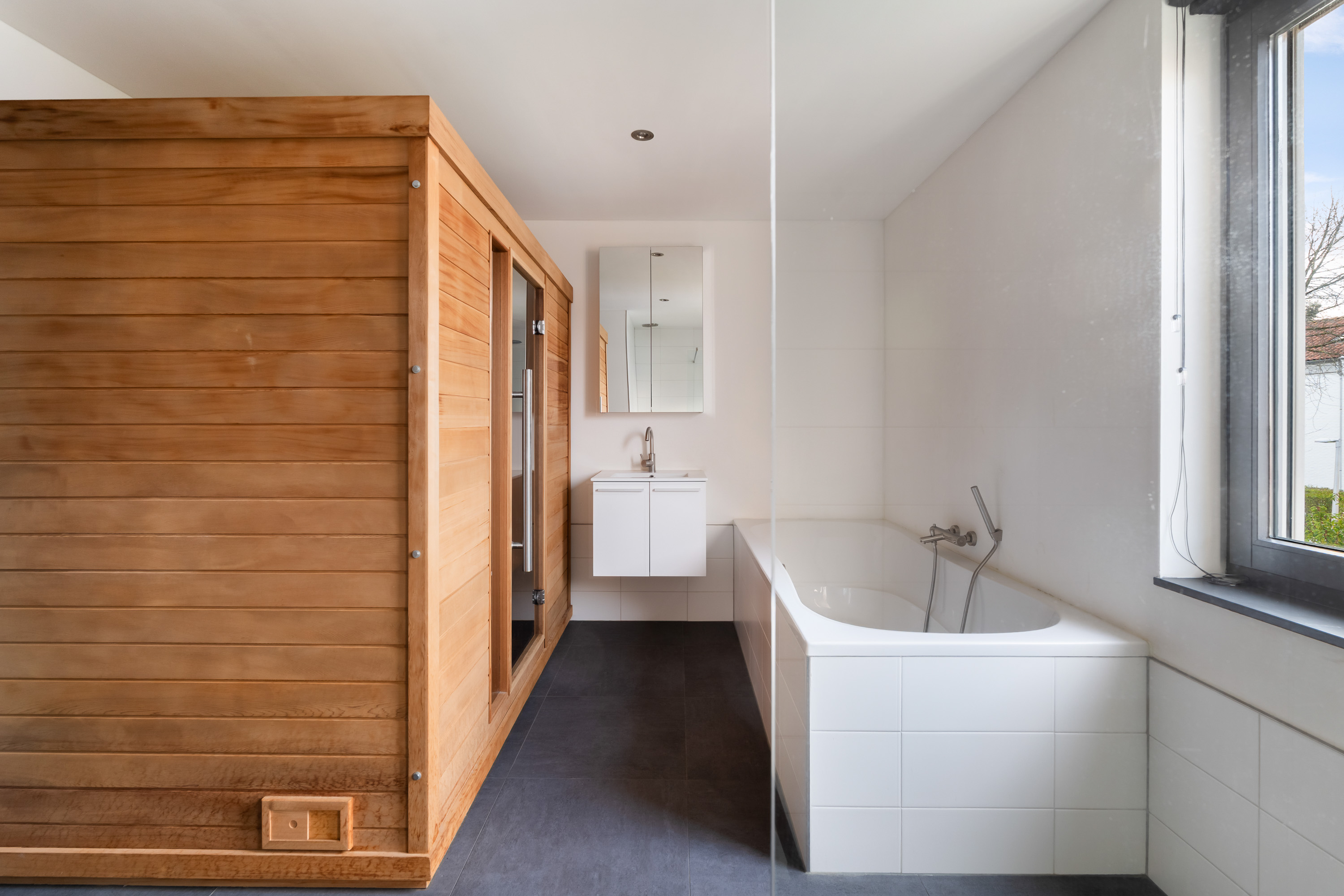 The bathroom is designed as a luxurious wellness space, featuring a bathtub, a spacious walk-in shower with rain shower, a large Finnish sauna with infrared function, and a washbasin unit with mirrored cabinet and additional storage. A wonderful place to fully unwind.