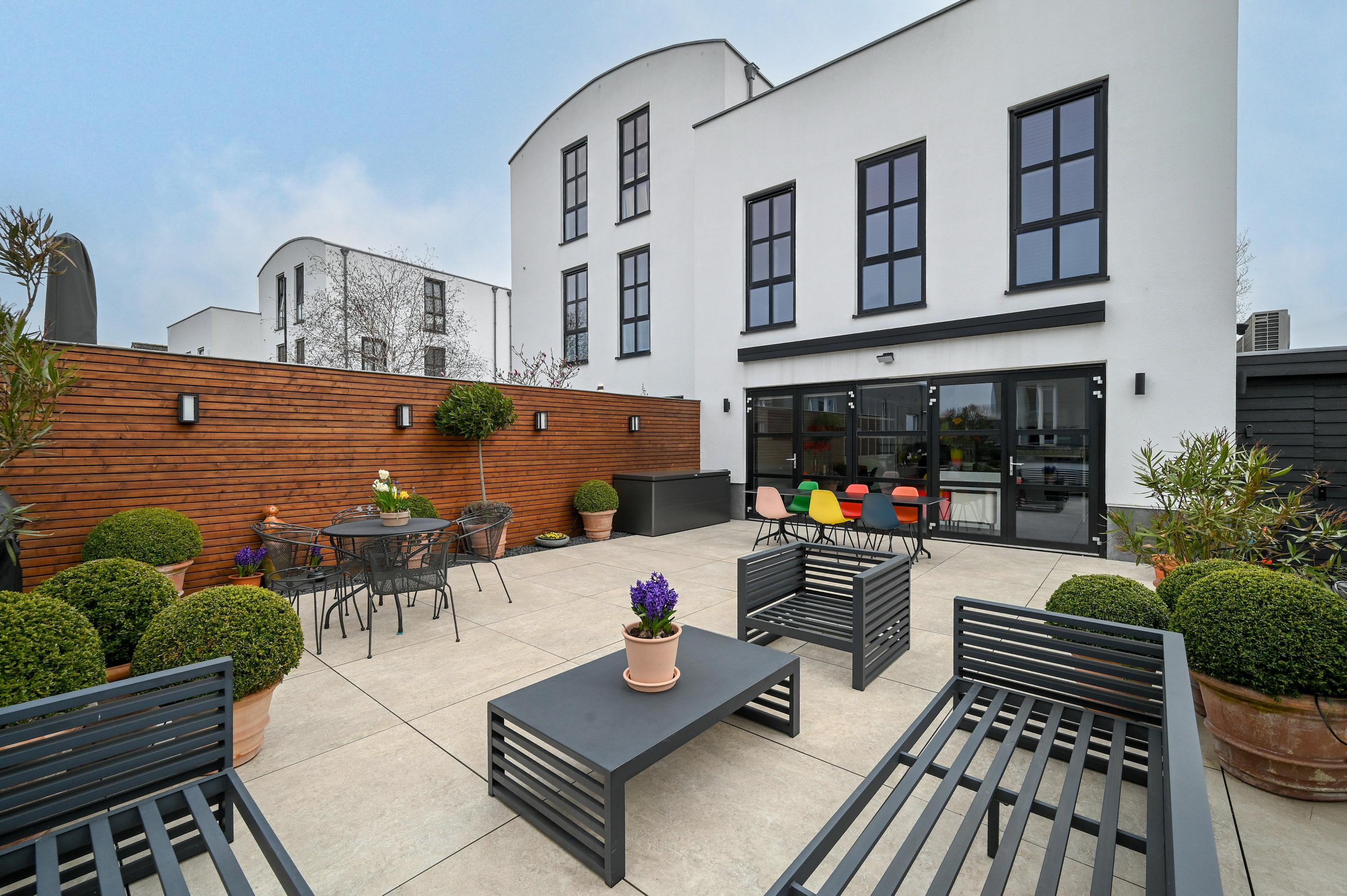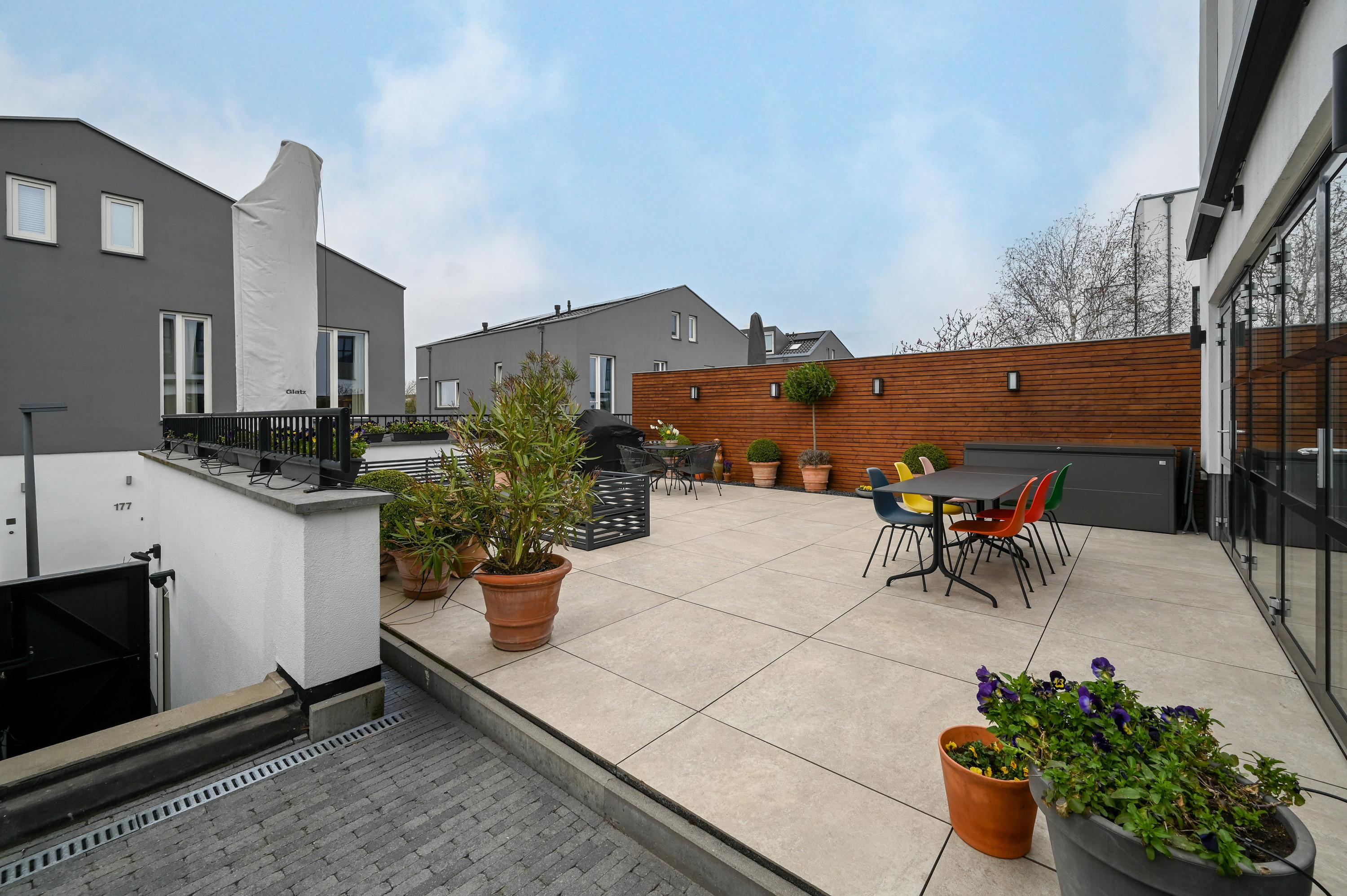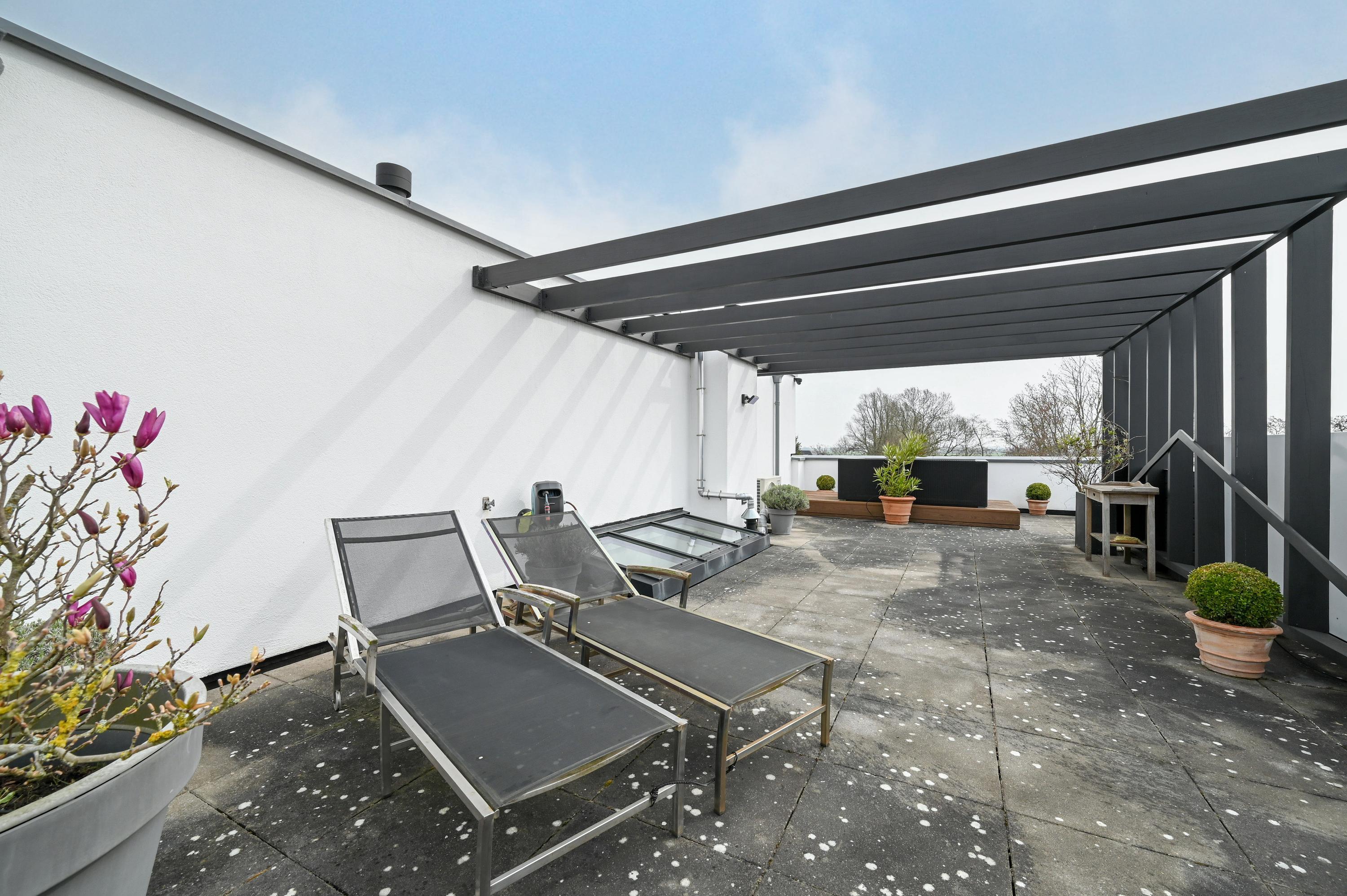 The terrace is fully tiled with large, light-colored tiles and bordered by well-maintained planting. Subtle garden lighting creates a stylish and inviting outdoor space, perfect for enjoying the outdoors both during the day and in the evening. An electric awning provides shade when needed.