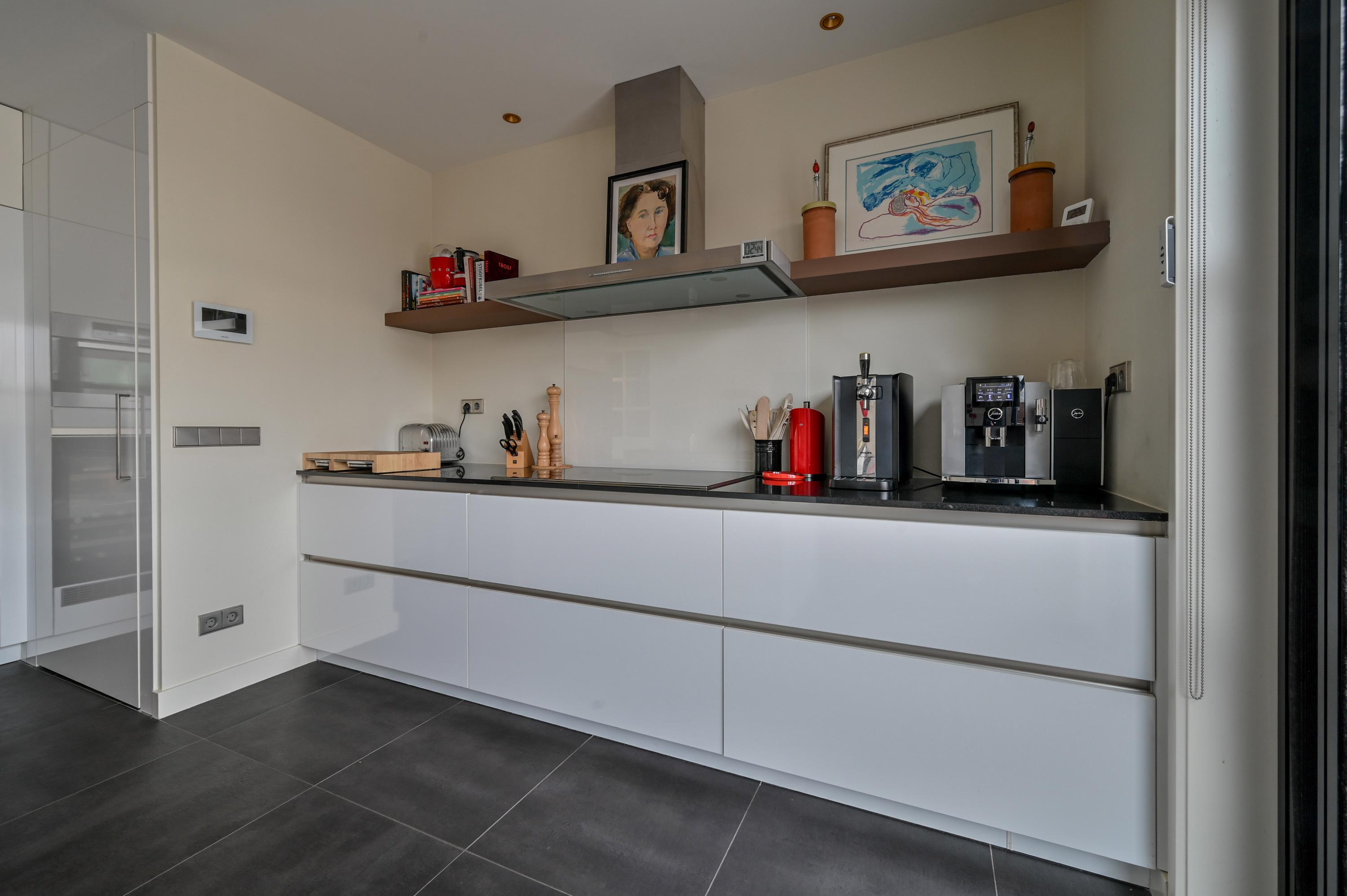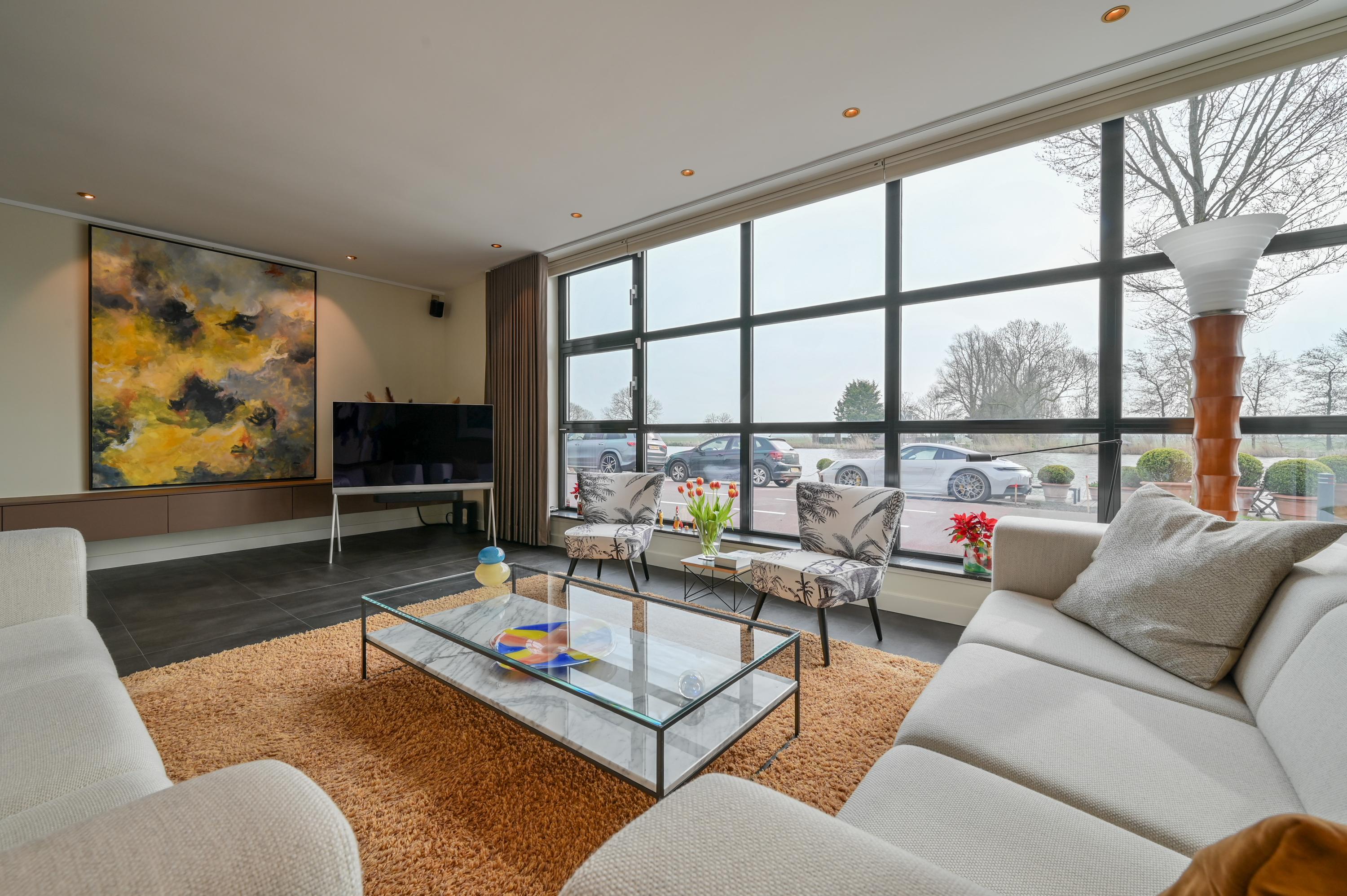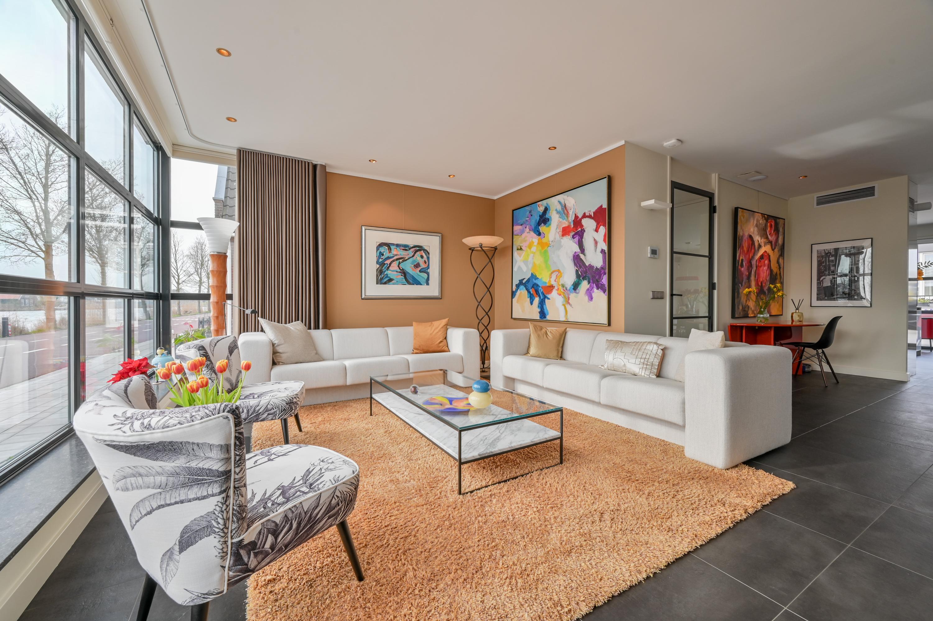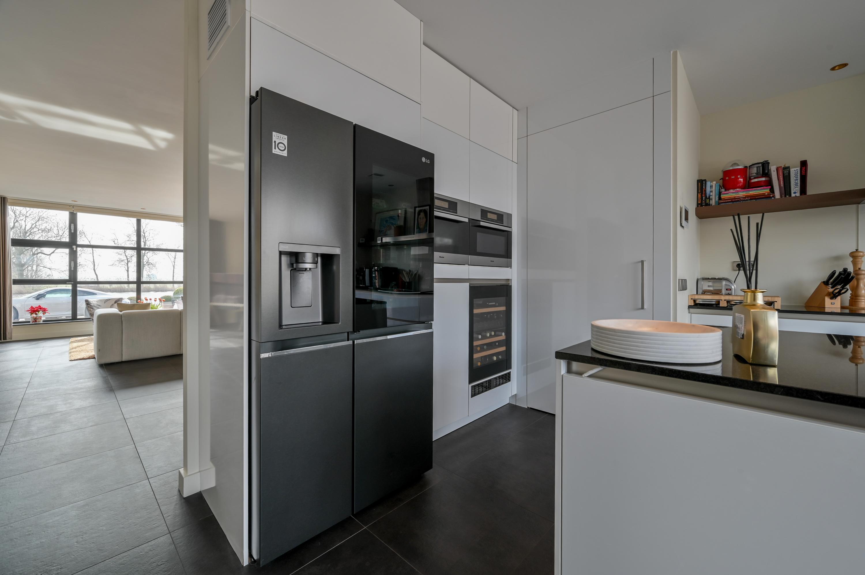Via the driveway, you reach the front door and the spacious entrance hall, which features a wardrobe, toilet, and staircase to the upper floor. The living room is located at the front of the house and offers breathtaking views over the Amstel. Large windows allow an abundance of natural light to flood in, while the motorized curtains can be operated via an app. Luxaflex Silhouette blinds (motorized, with memory function) are also installed here. The stylish black tiled floor with underfloor heating, built-in dimmable Modular spotlights, and large custom-designed cabinets complete the space.