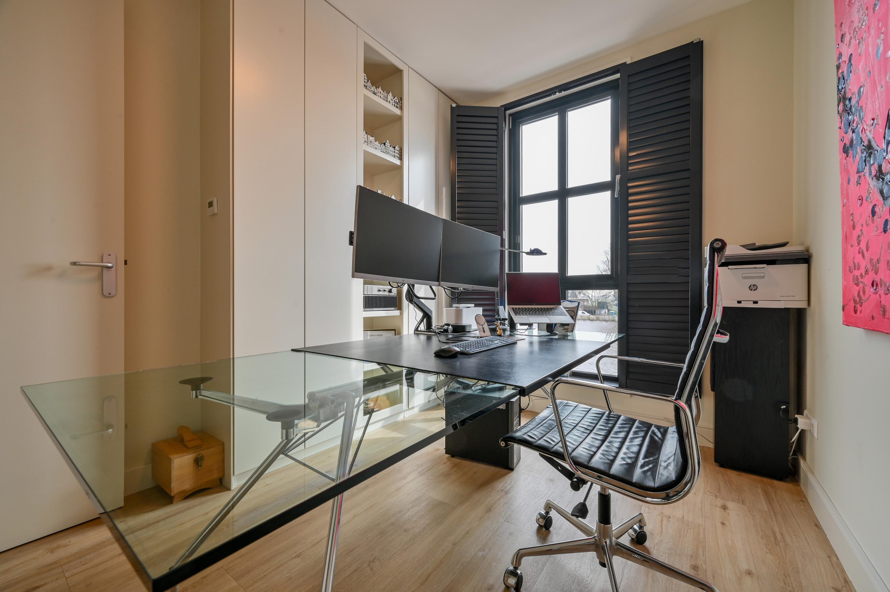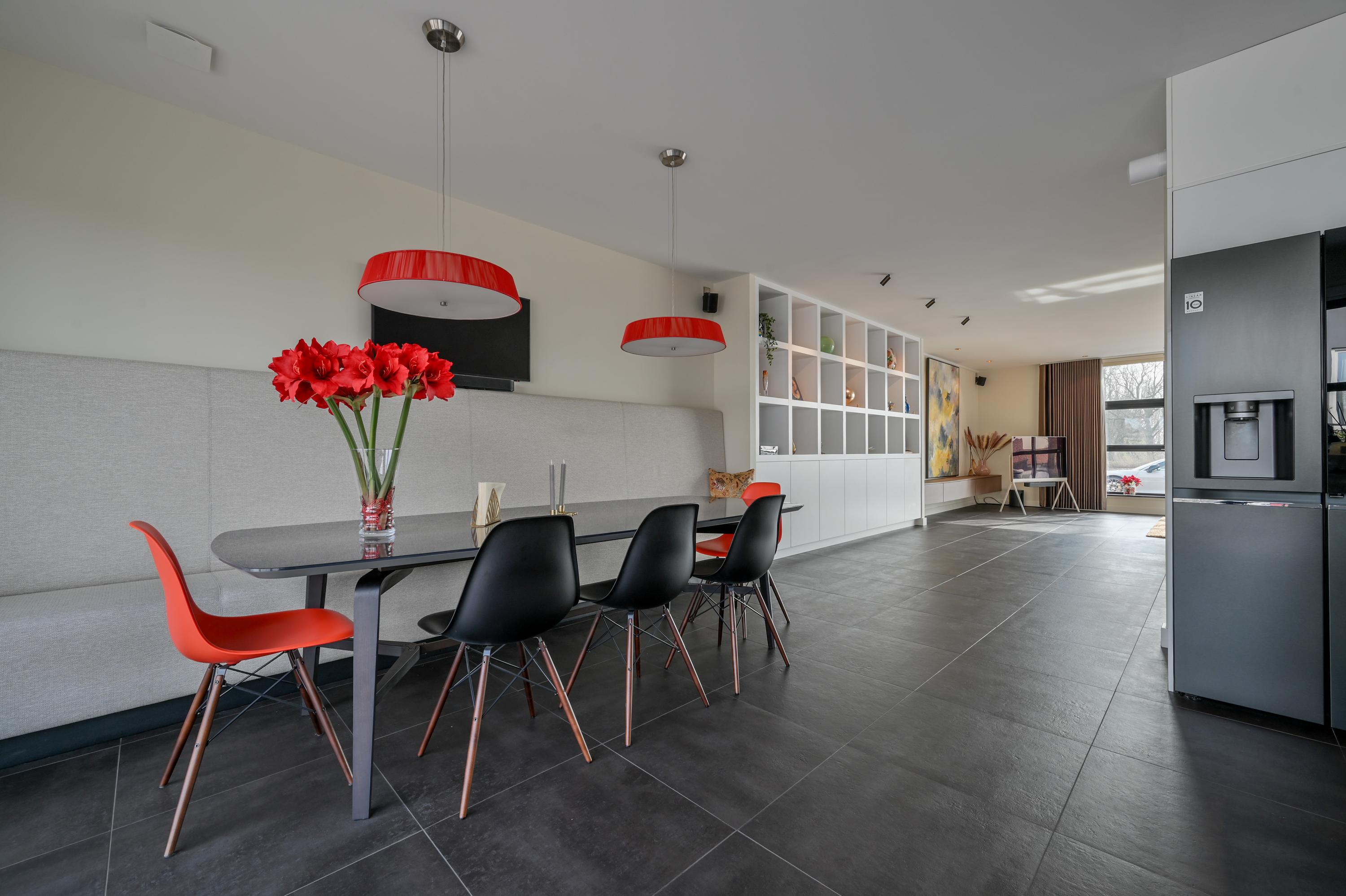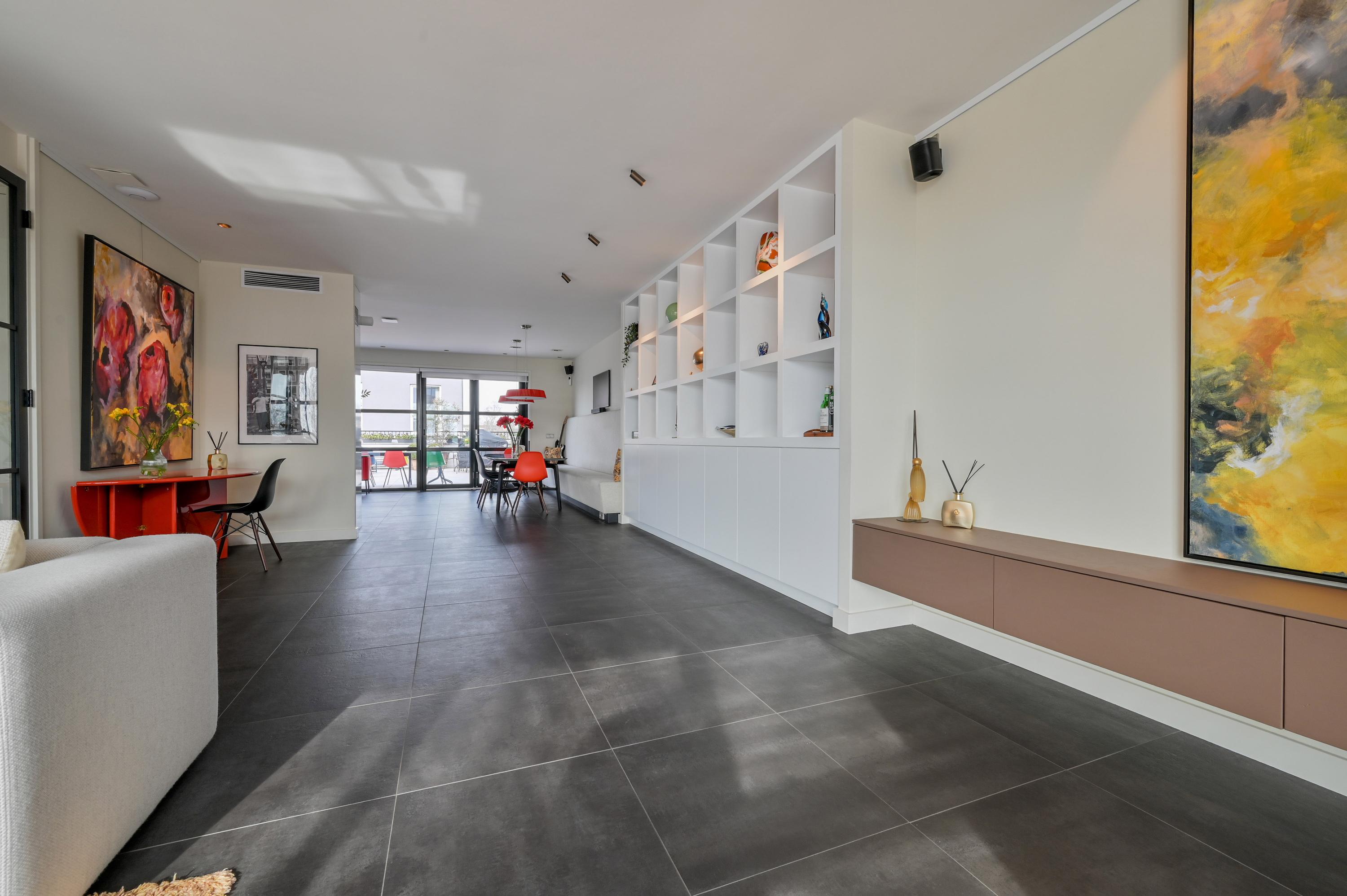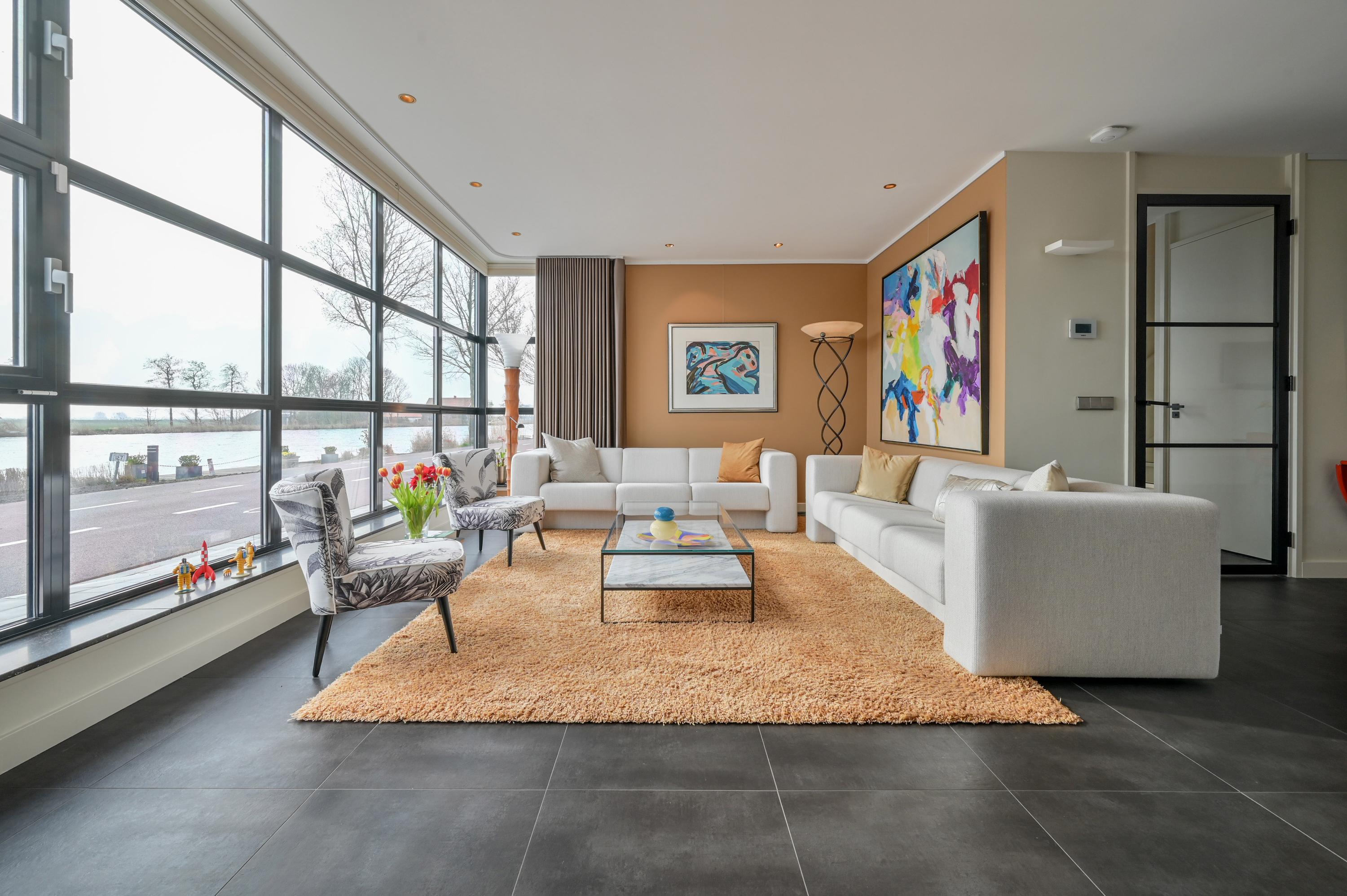 Via the driveway, you reach the front door and the spacious entrance hall, which features a wardrobe, toilet, and staircase to the upper floor. The living room is located at the front of the house and offers breathtaking views over the Amstel. Large windows allow an abundance of natural light to flood in, while the motorized curtains can be operated via an app. Luxaflex Silhouette blinds (motorized, with memory function) are also installed here. The stylish black tiled floor with underfloor heating, built-in dimmable Modular spotlights, and large custom-designed cabinets complete the space.