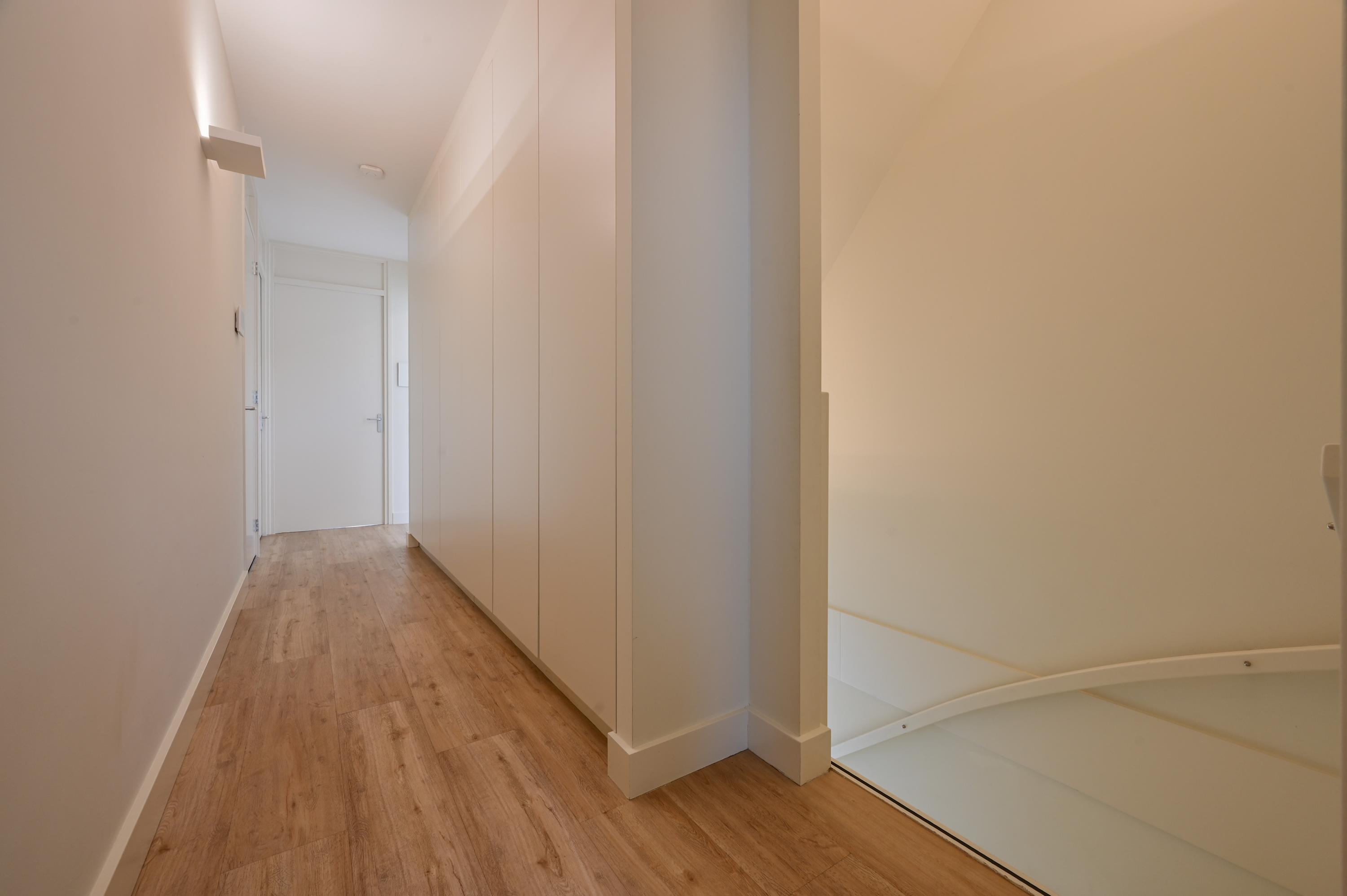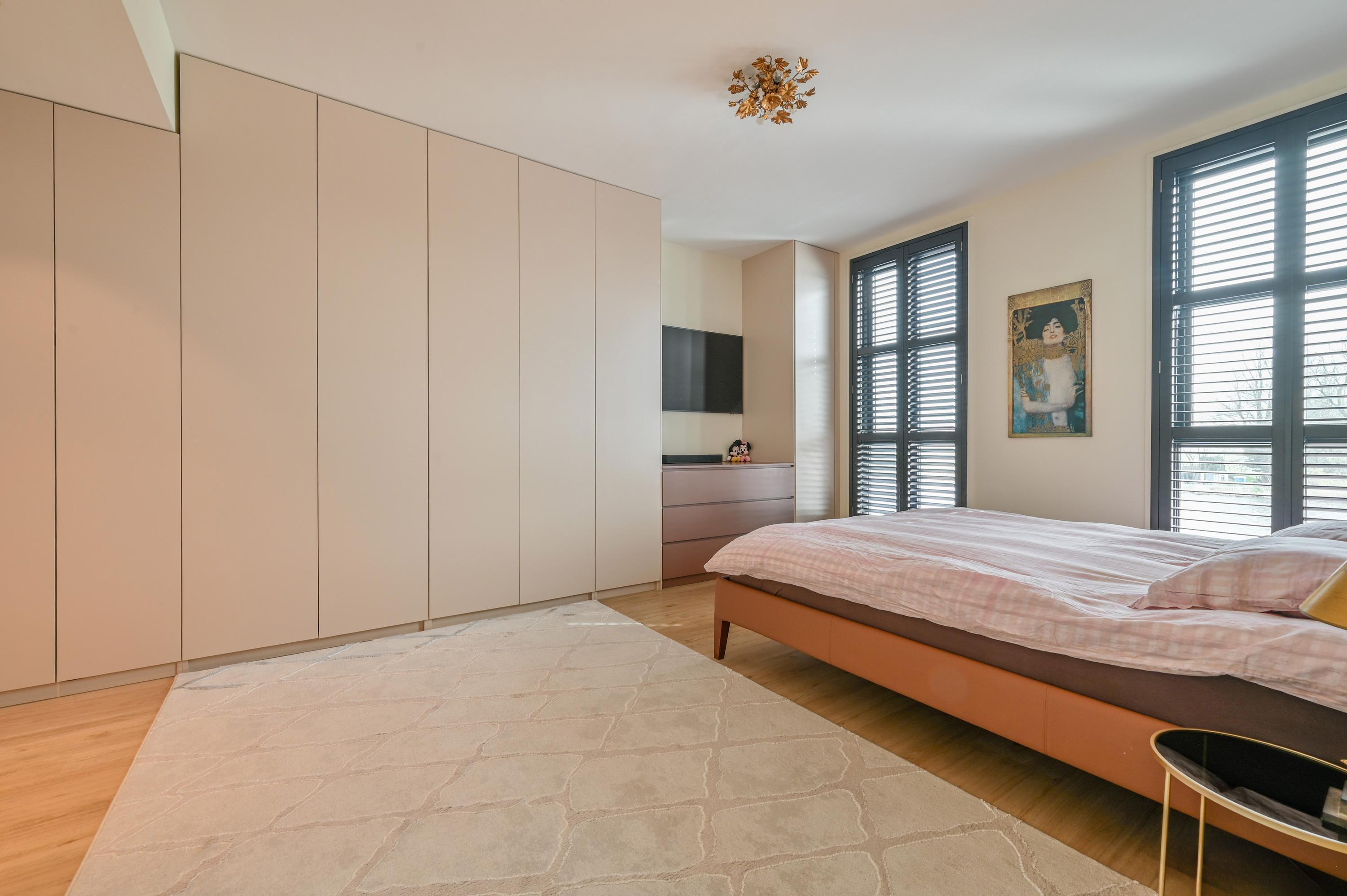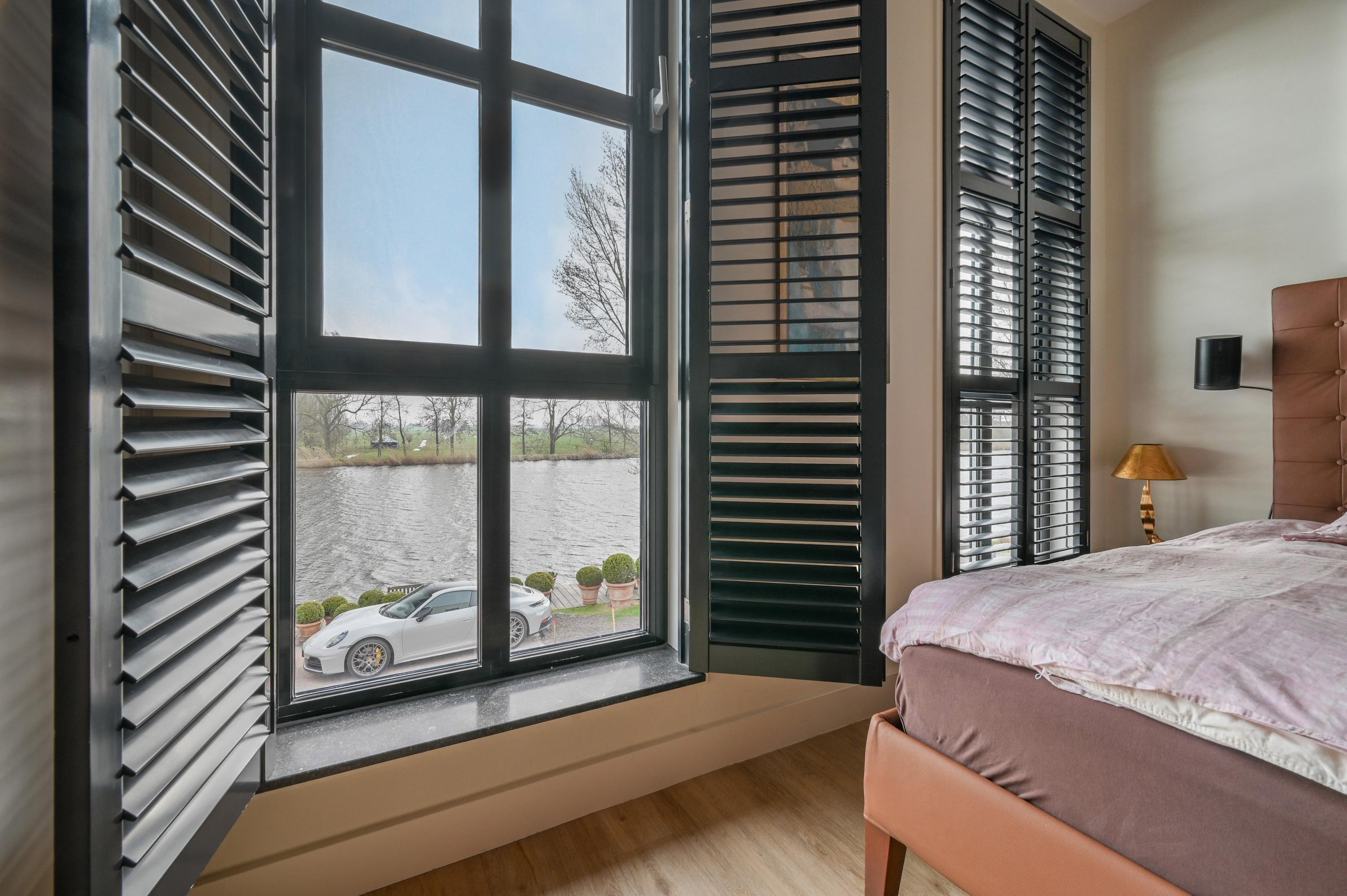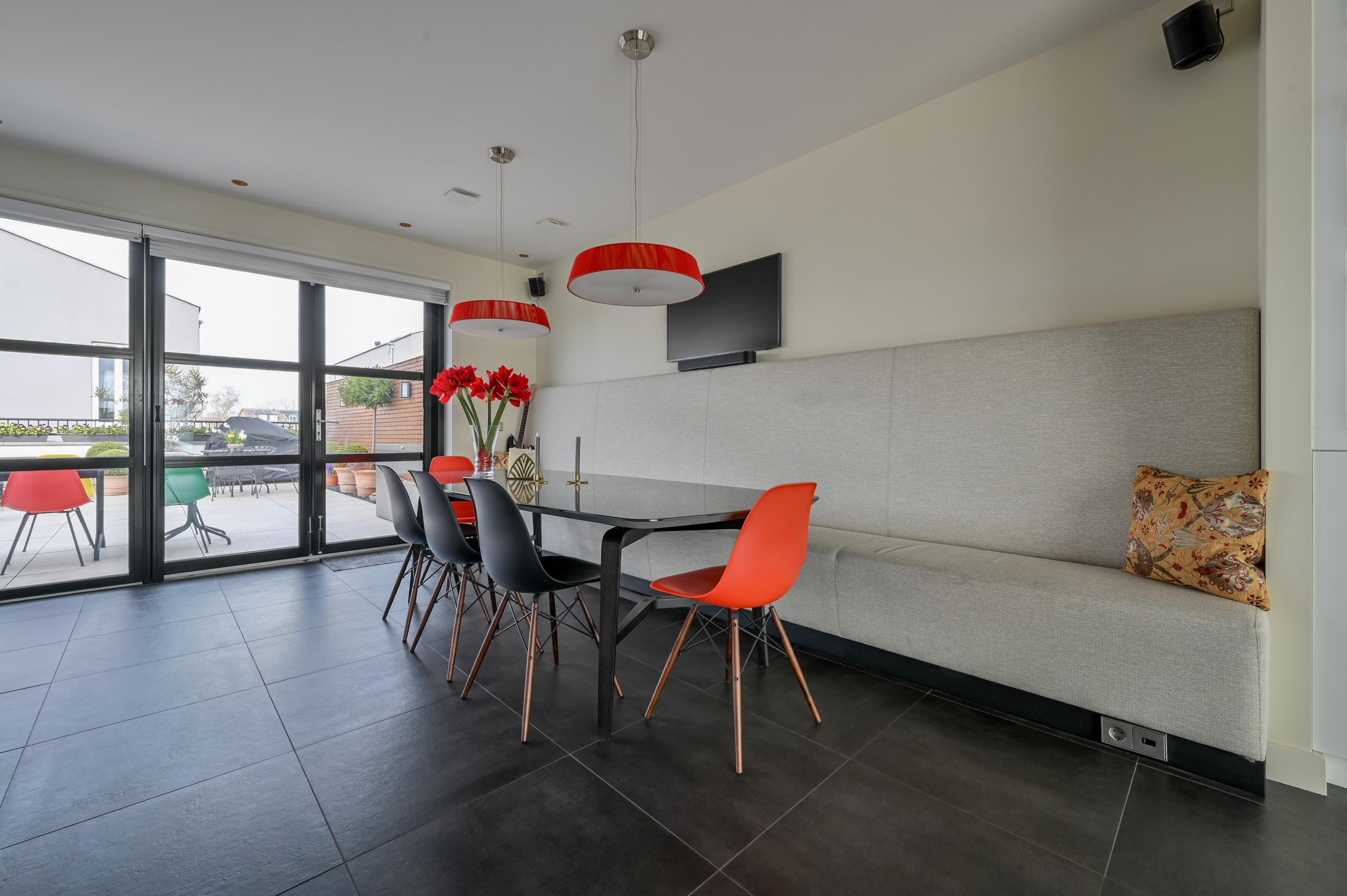 Via the driveway, you reach the front door and the spacious entrance hall, which features a wardrobe, toilet, and staircase to the upper floor. The living room is located at the front of the house and offers breathtaking views over the Amstel. Large windows allow an abundance of natural light to flood in, while the motorized curtains can be operated via an app. Luxaflex Silhouette blinds (motorized, with memory function) are also installed here. The stylish black tiled floor with underfloor heating, built-in dimmable Modular spotlights, and large custom-designed cabinets complete the space.