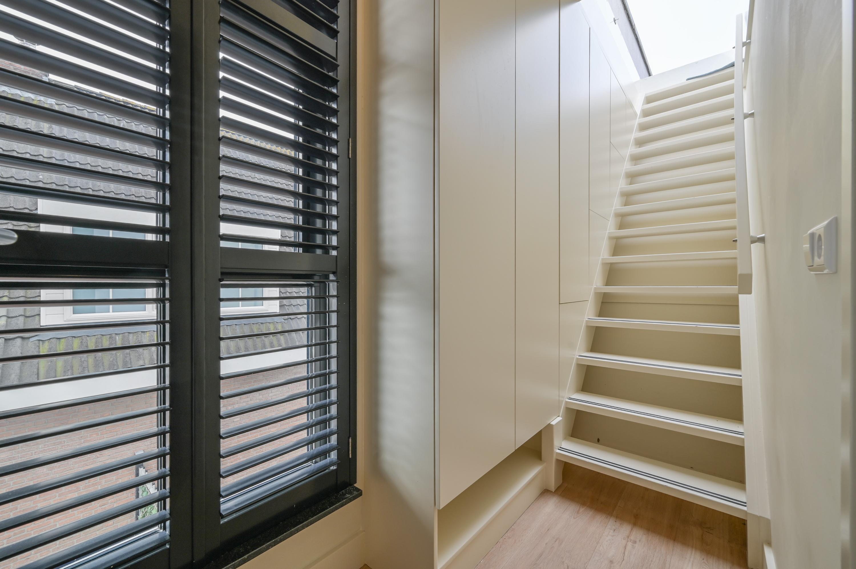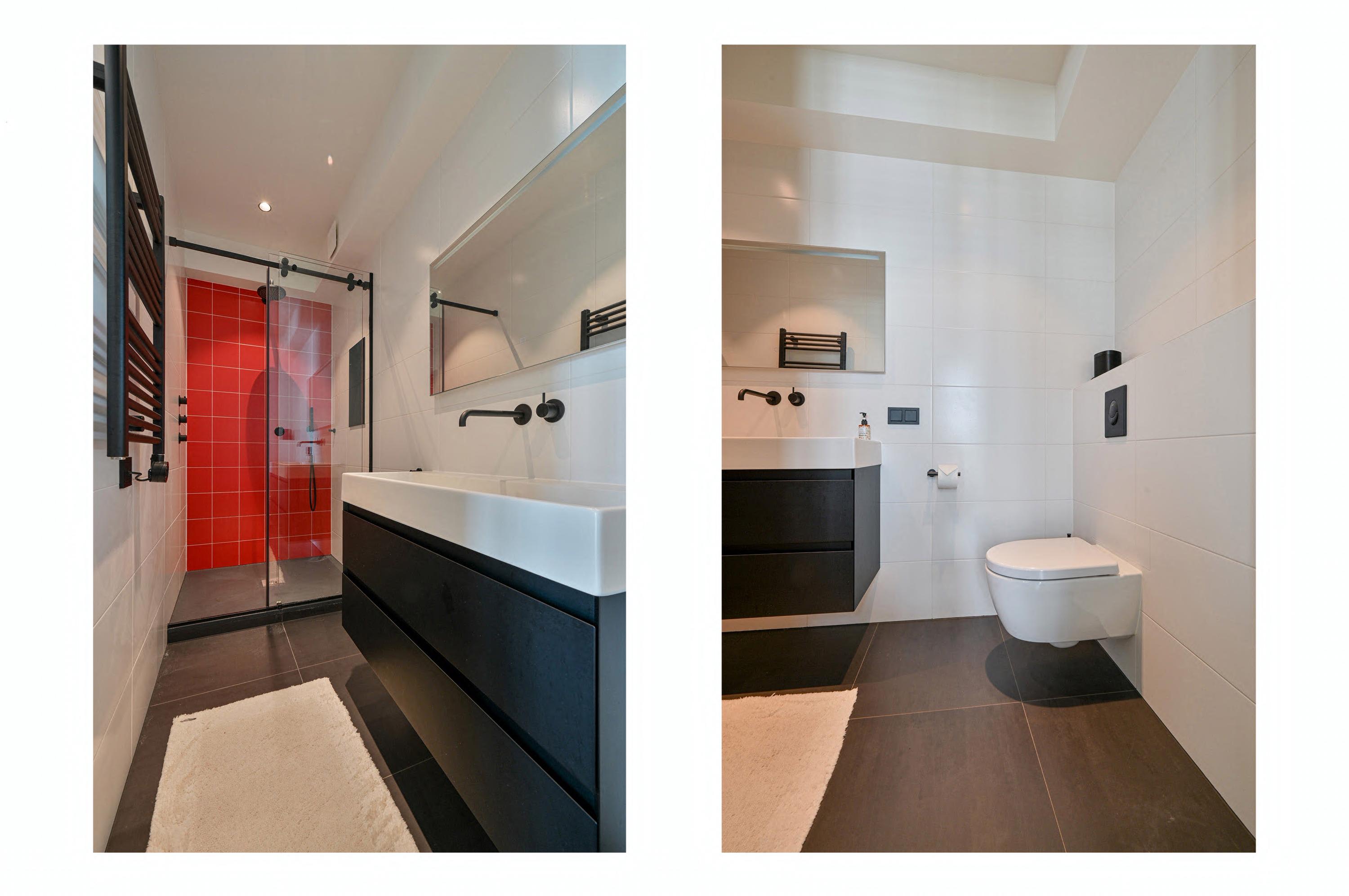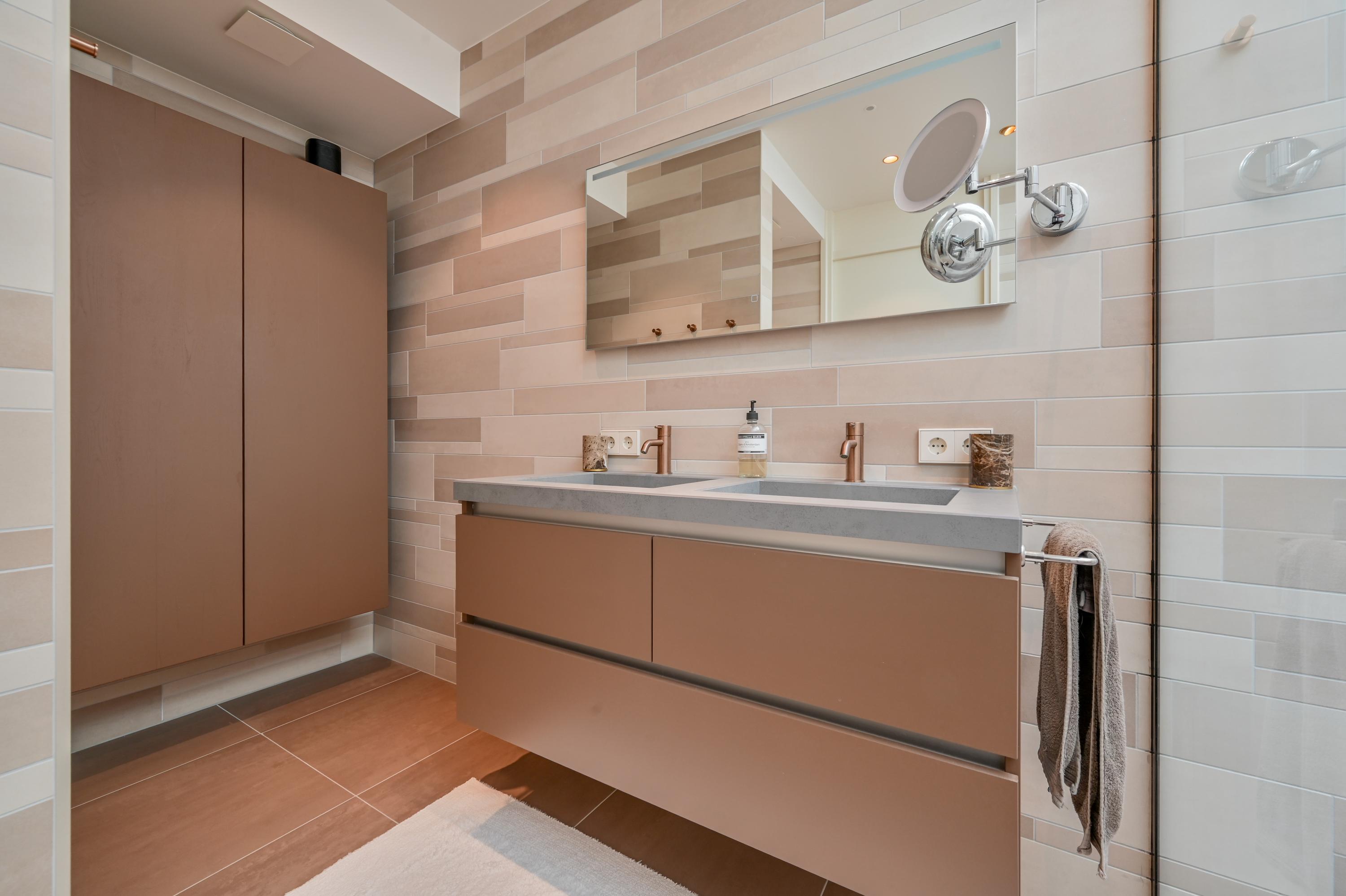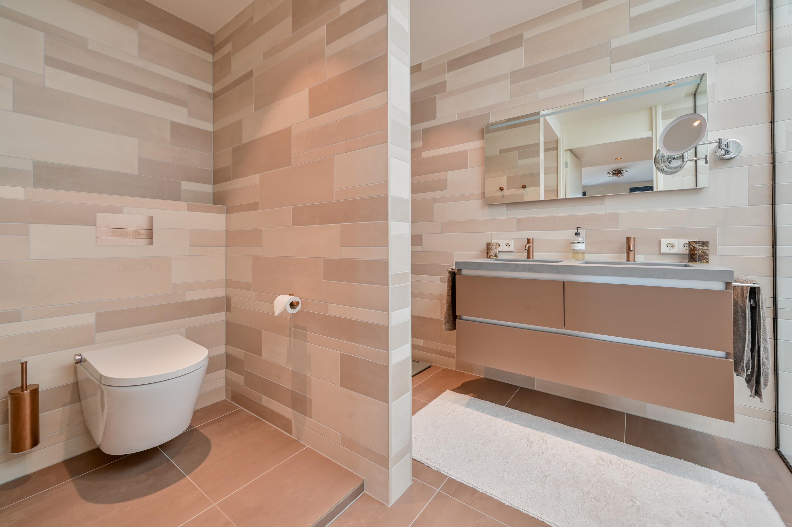 Via the driveway, you reach the front door and the spacious entrance hall, which features a wardrobe, toilet, and staircase to the upper floor. The living room is located at the front of the house and offers breathtaking views over the Amstel. Large windows allow an abundance of natural light to flood in, while the motorized curtains can be operated via an app. Luxaflex Silhouette blinds (motorized, with memory function) are also installed here. The stylish black tiled floor with underfloor heating, built-in dimmable Modular spotlights, and large custom-designed cabinets complete the space.