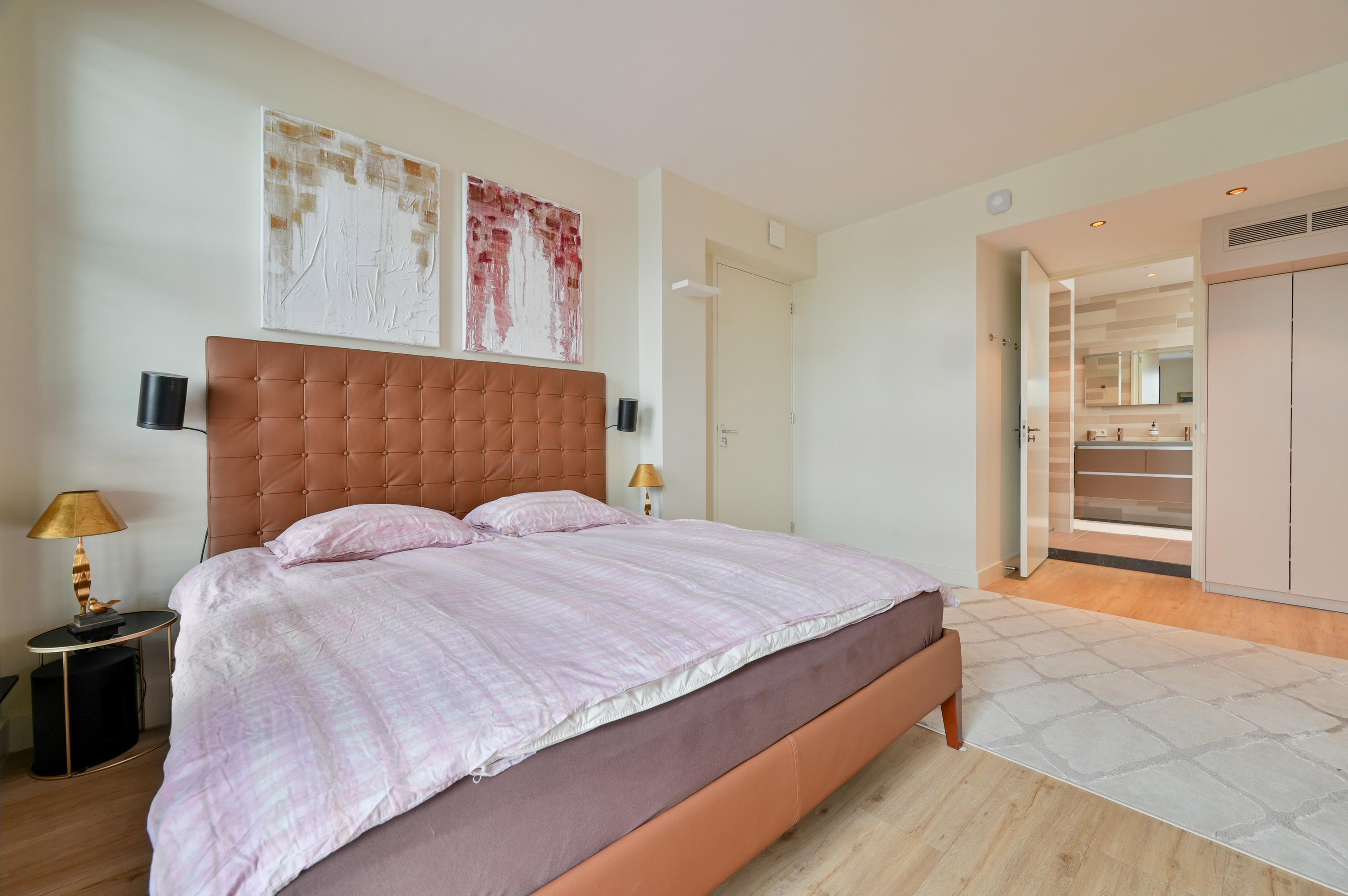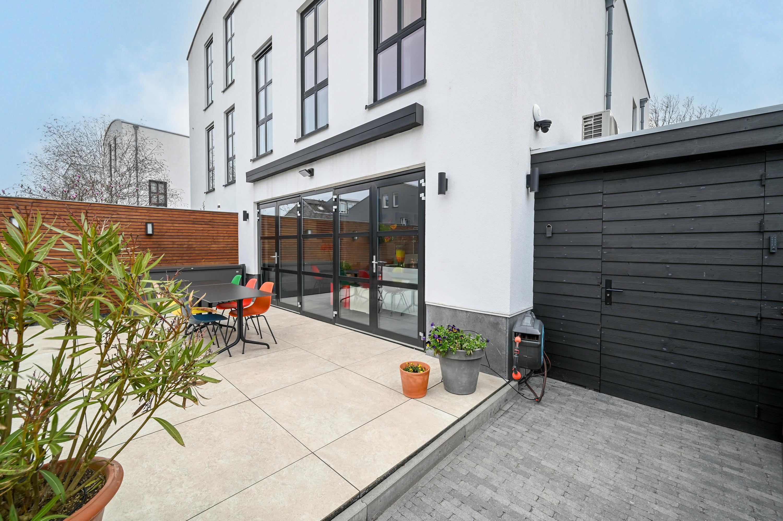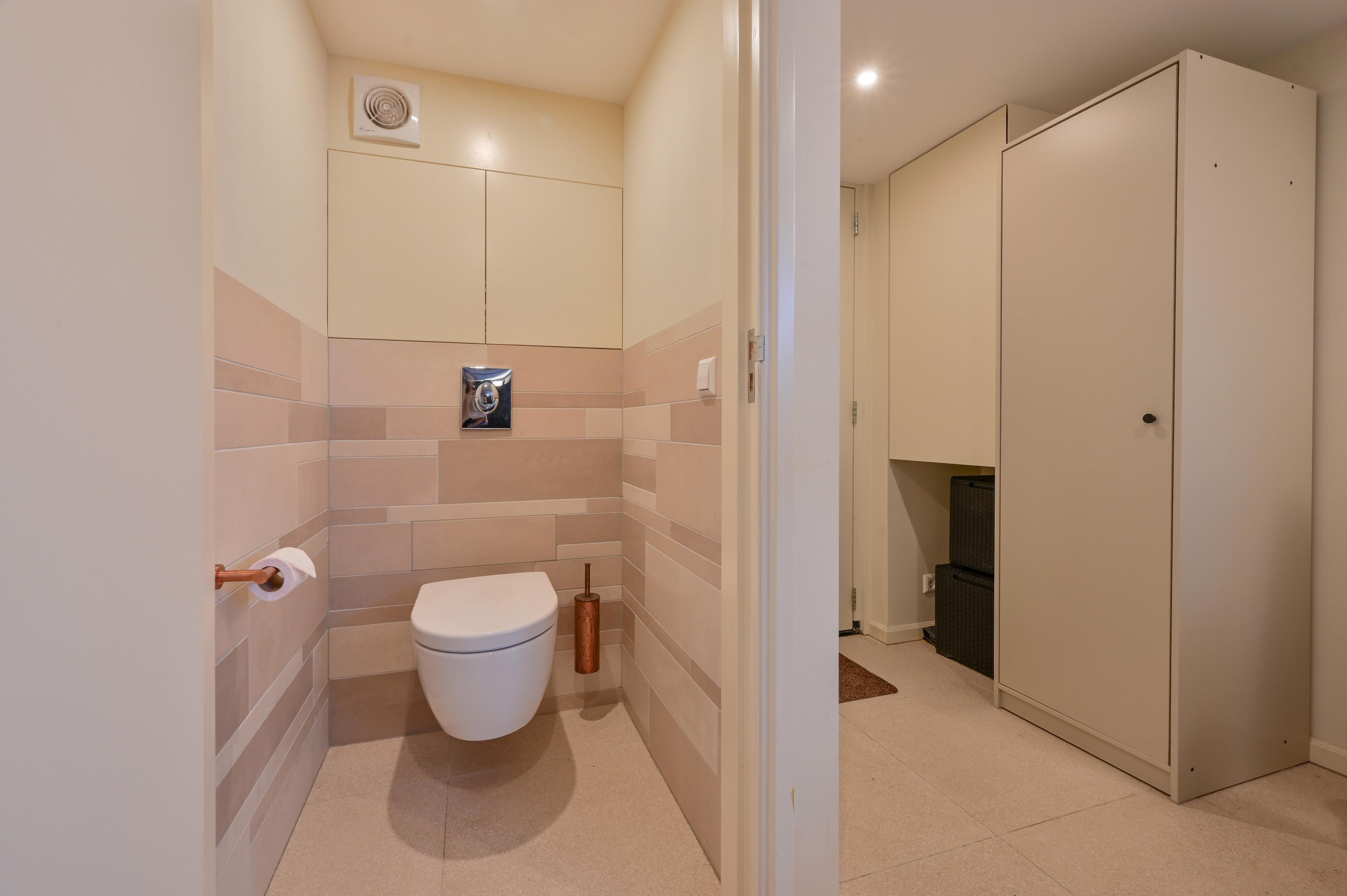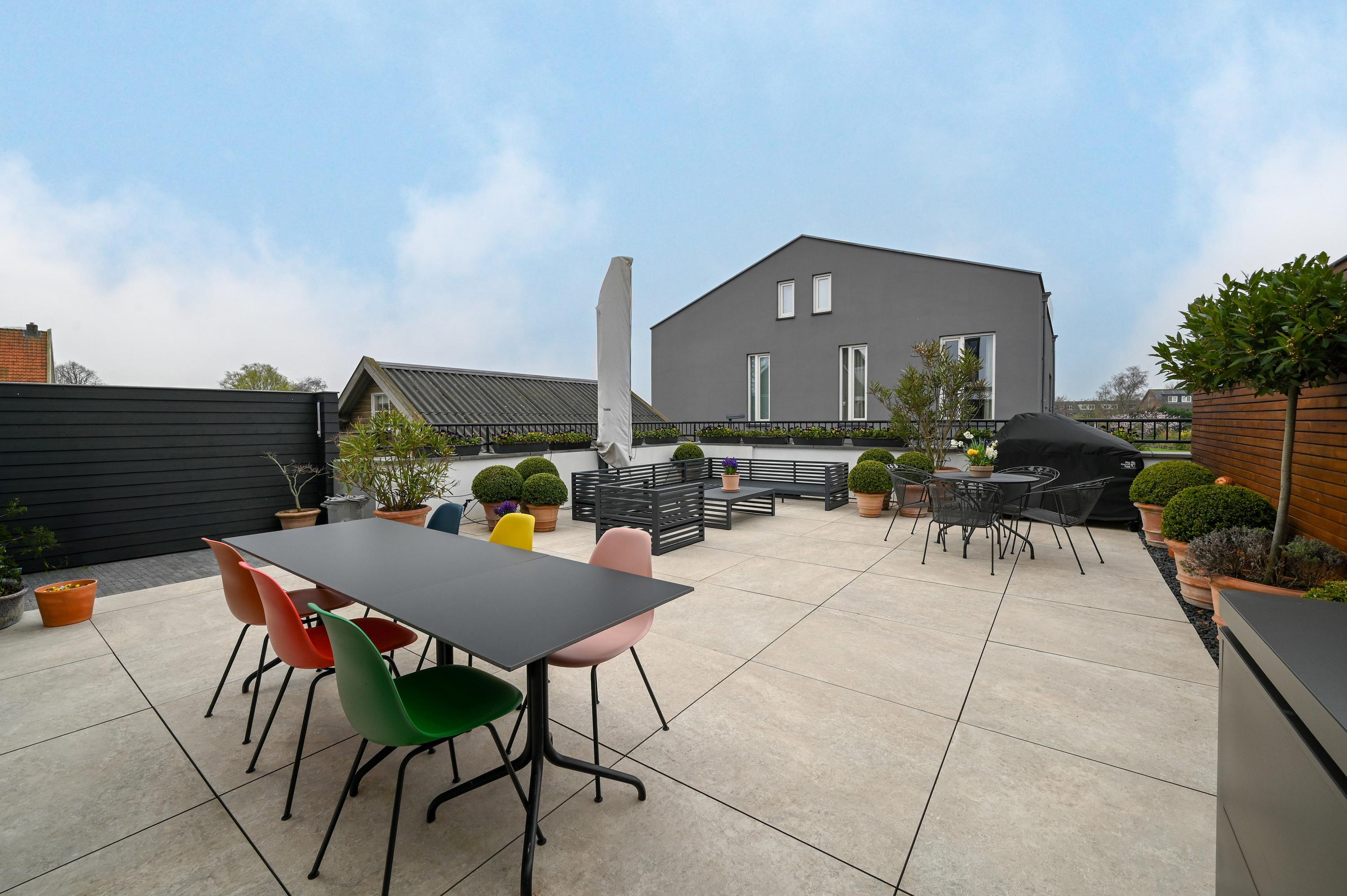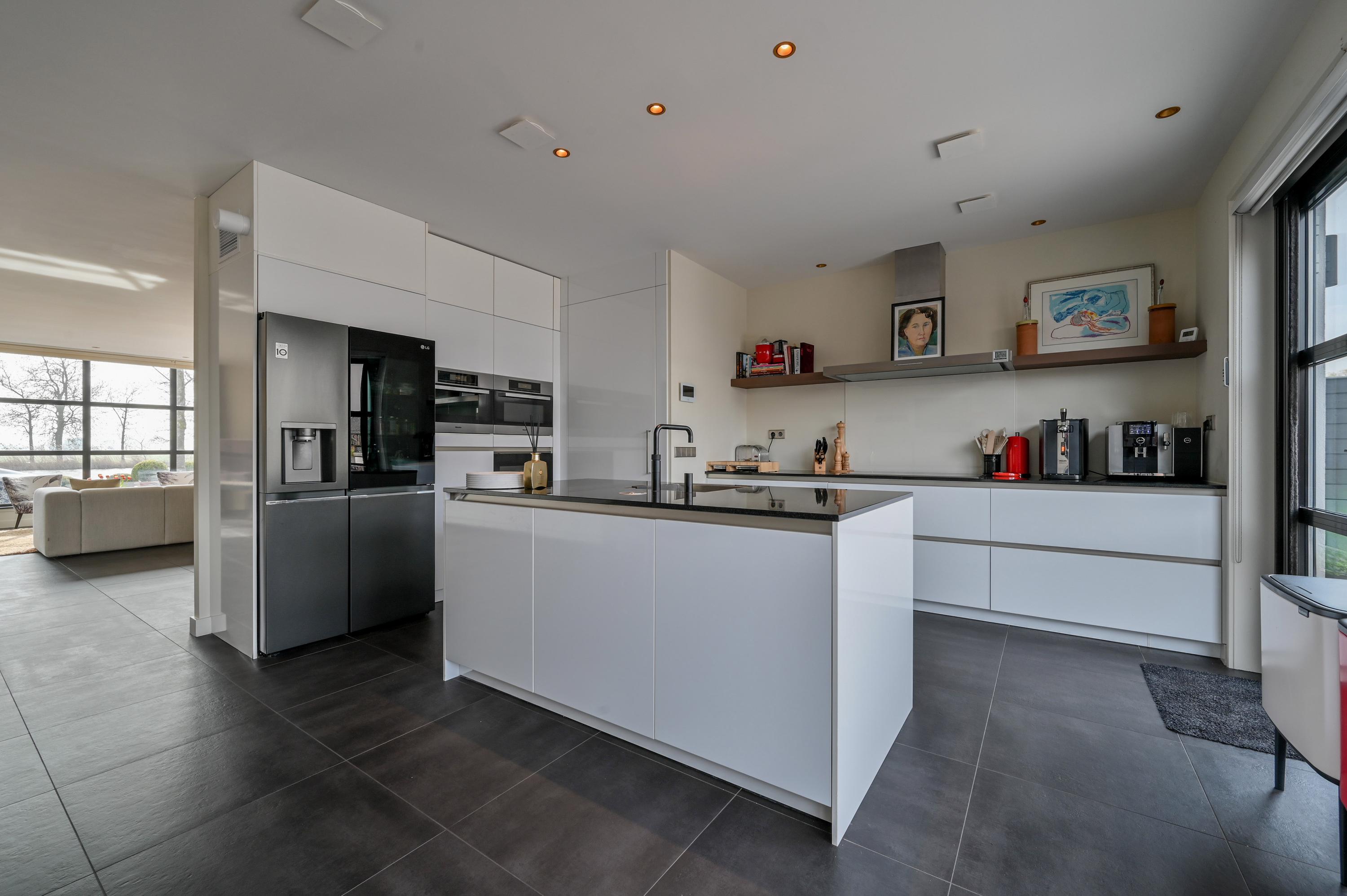At the rear of the home, you will find the generous and luxurious open-plan kitchen, designed for both cooking and living. The kitchen features a central island with sink, a Quooker, dishwasher, combi ovens, induction hob with extractor, a large LG refrigerator with freezer and ice maker, a Liebherr wine climate cabinet, and extensive storage space. A built-in bench at the large dining table creates a cozy seating area, while double French doors provide access to the spacious terrace garden, where light, space, and tranquility come together.