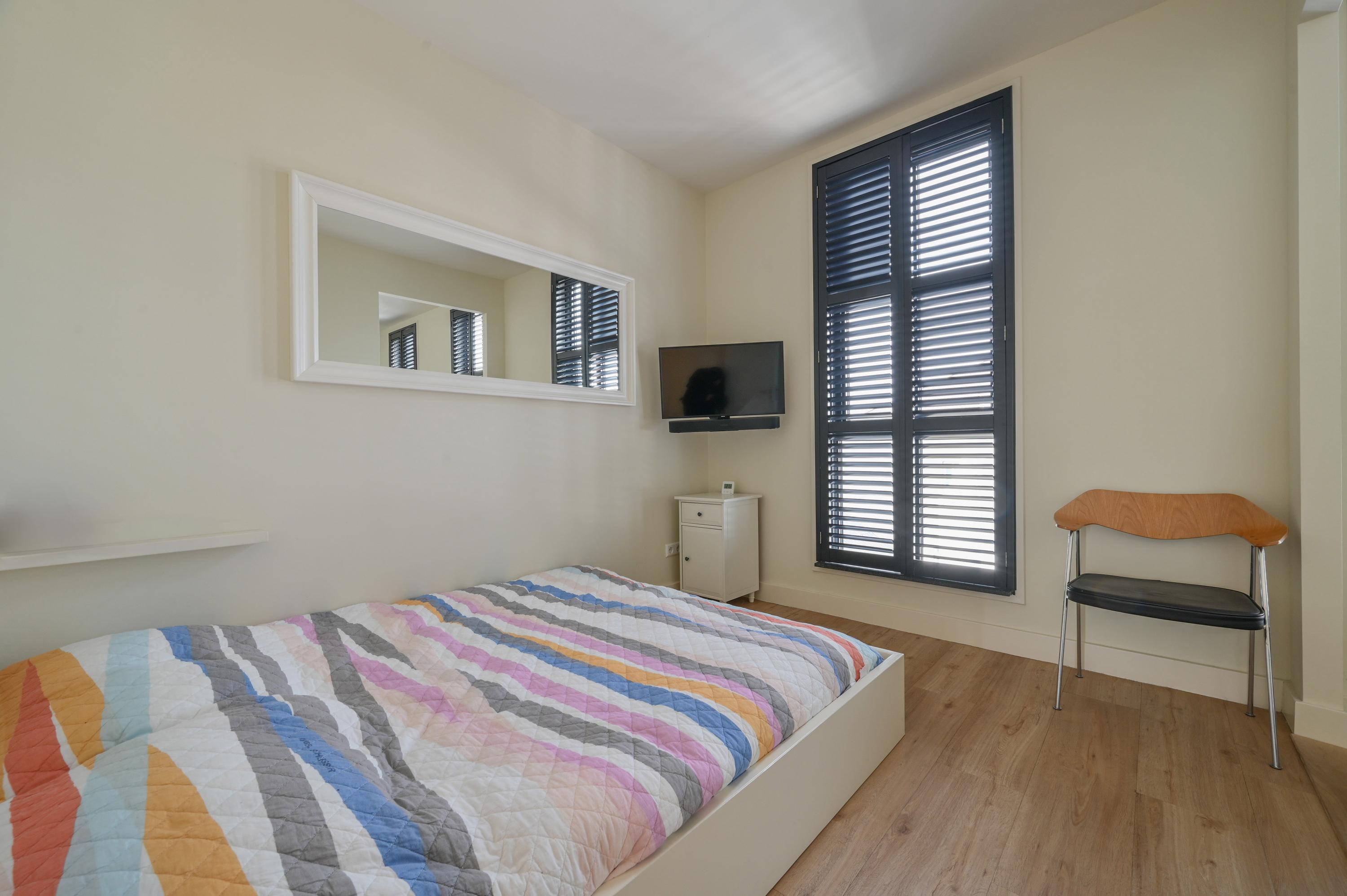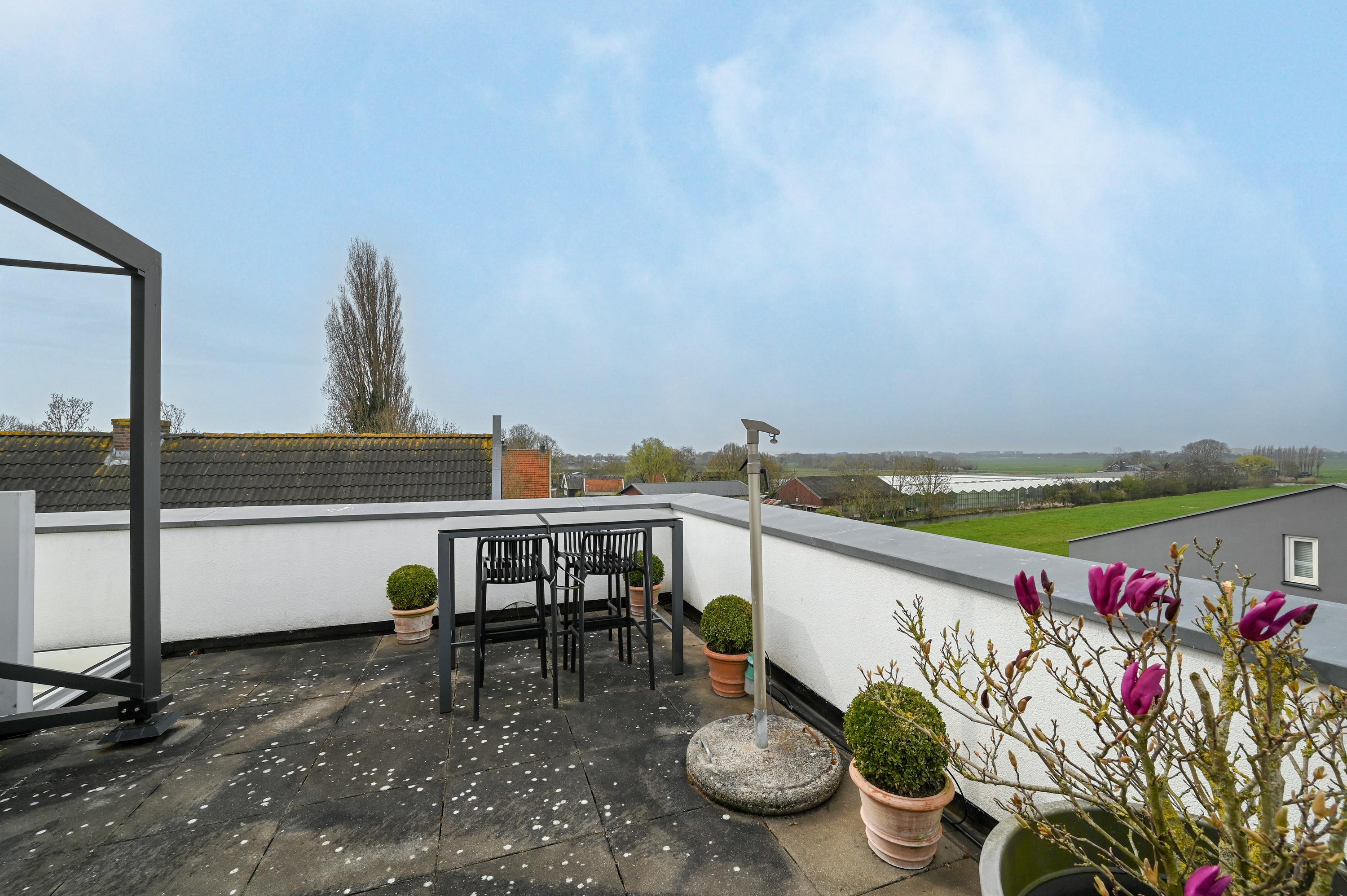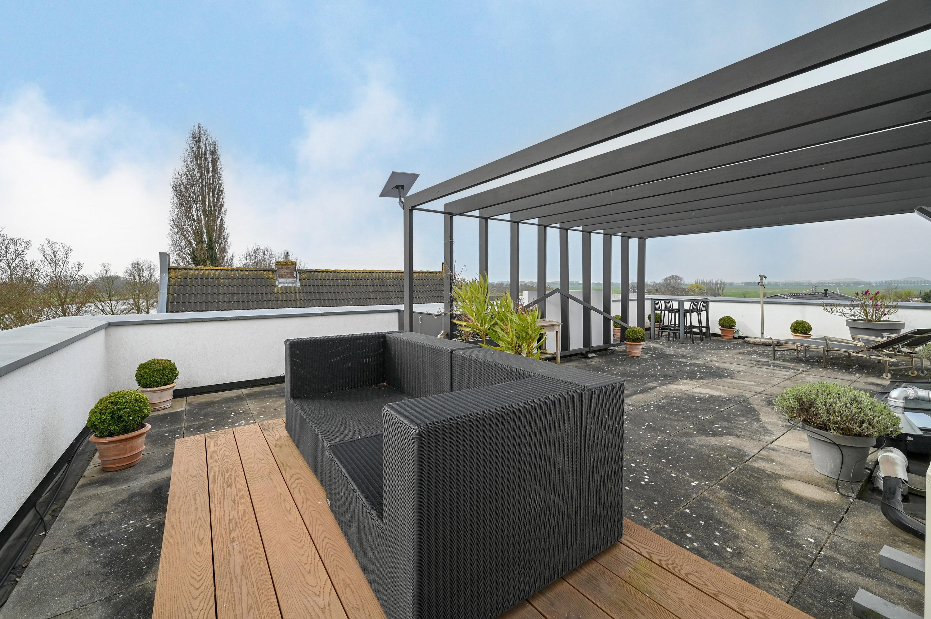 The second floor features a spacious roof terrace offering stunning views over the surrounding nature and the Amstel. The terrace is equipped with a large pergola, electricity, atmospheric lighting, a water connection, and a practical storage cabinet, making it the perfect place to relax, entertain, or enjoy drinks with guests.