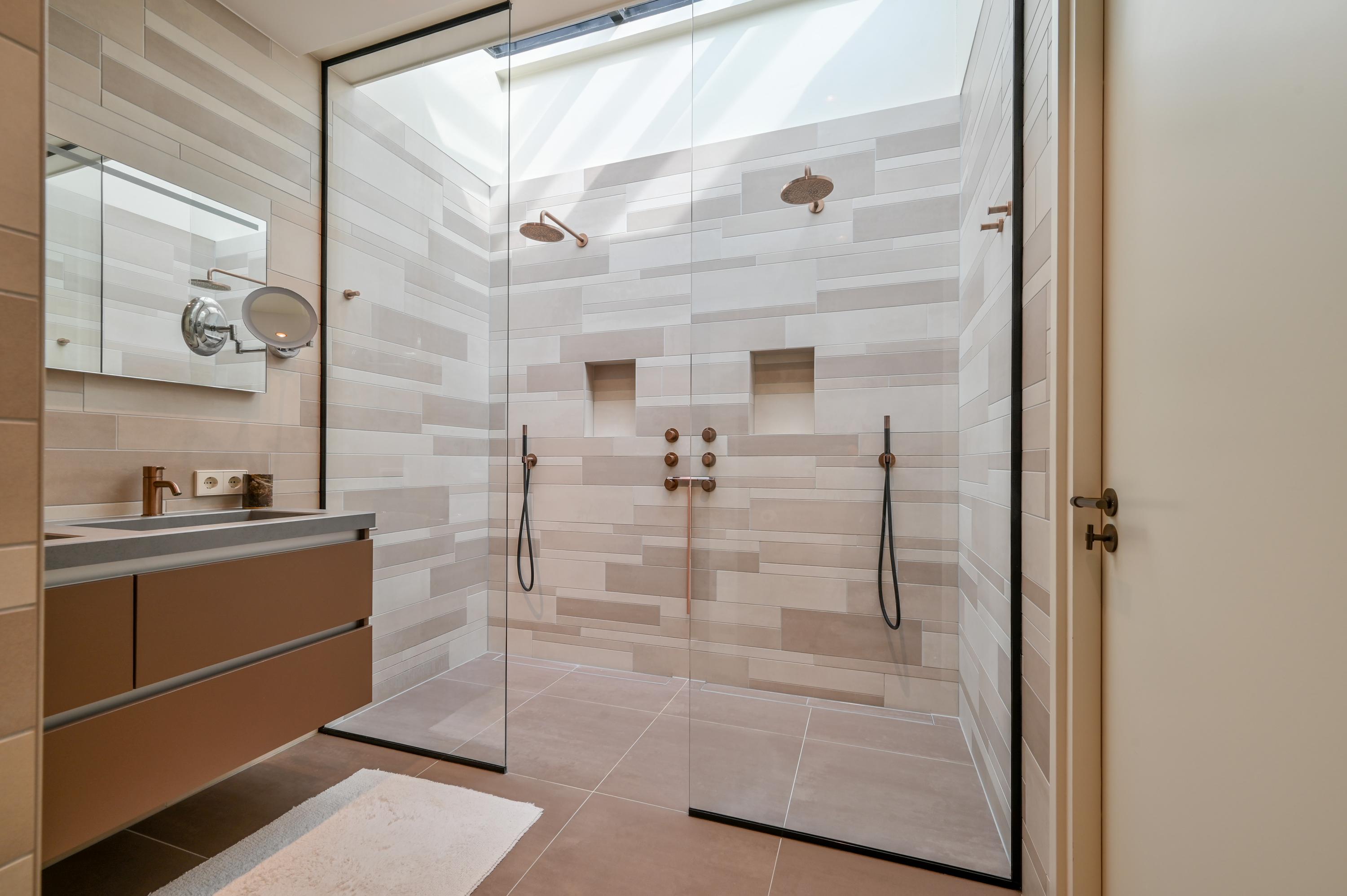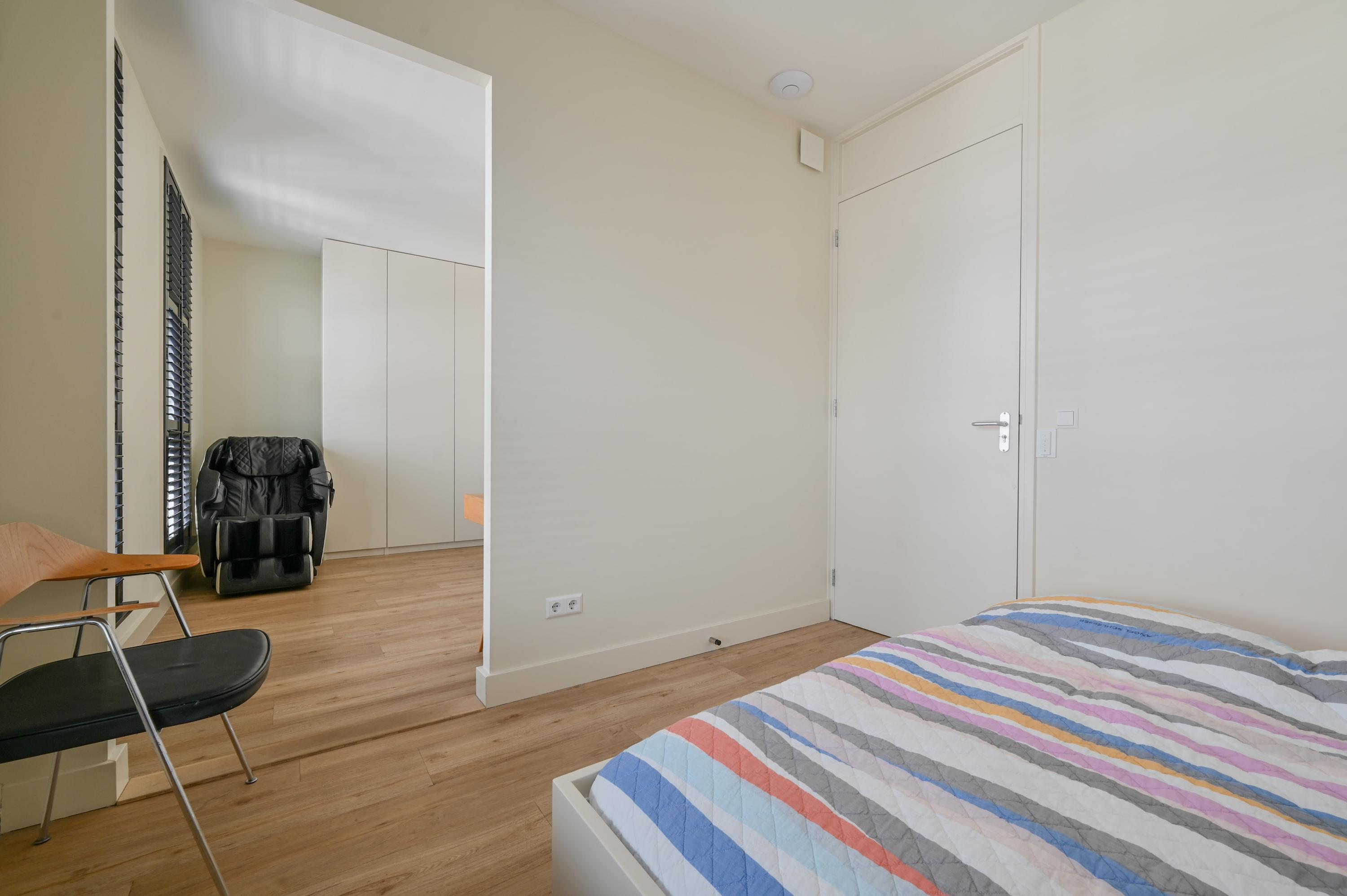 The staircase in the hall leads to the first floor, where four generously sized bedrooms are located. The two bedrooms at the rear are connected by an open passage and share a private bathroom with a toilet, large washbasin, modern shower, and towel radiator. As throughout the home, air conditioning is installed here for year-round comfort.