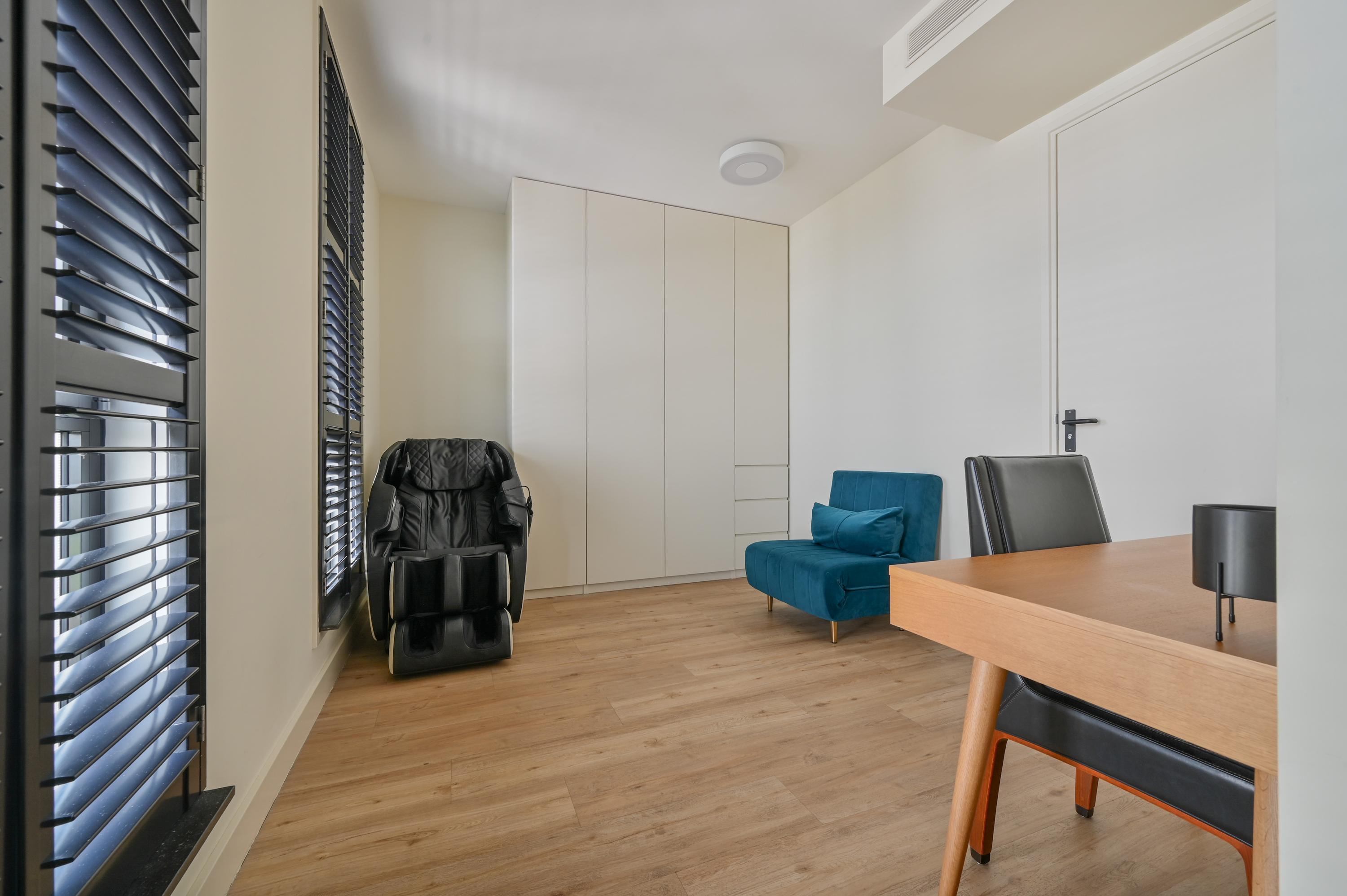 At the front are two additional rooms: one currently used as a stylish home office and the other as a spacious master bedroom. The master bedroom features a custom-built wardrobe and a luxurious en-suite bathroom. This bathroom exudes elegance, with light designer tiles, a walk-in shower with double rain and hand showers, a skylight that floods the space with natural light, a double vanity with Hotbath taps and drawers, a sleek wall unit, and an automatic toilet with remote control.