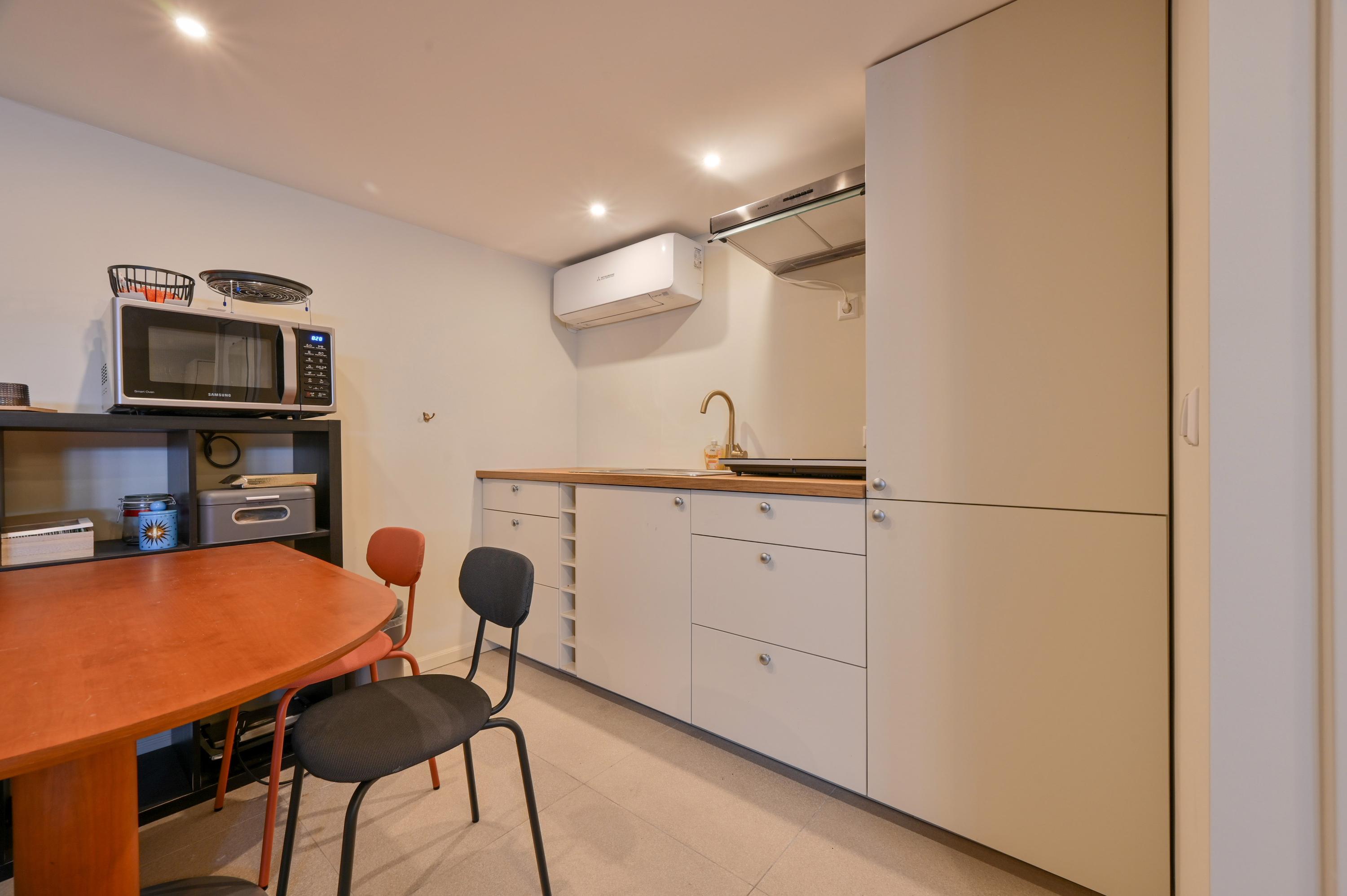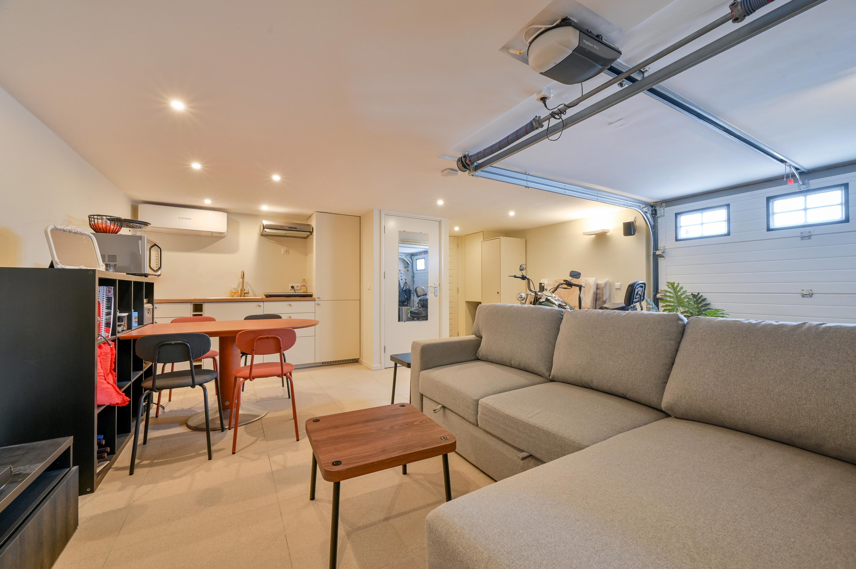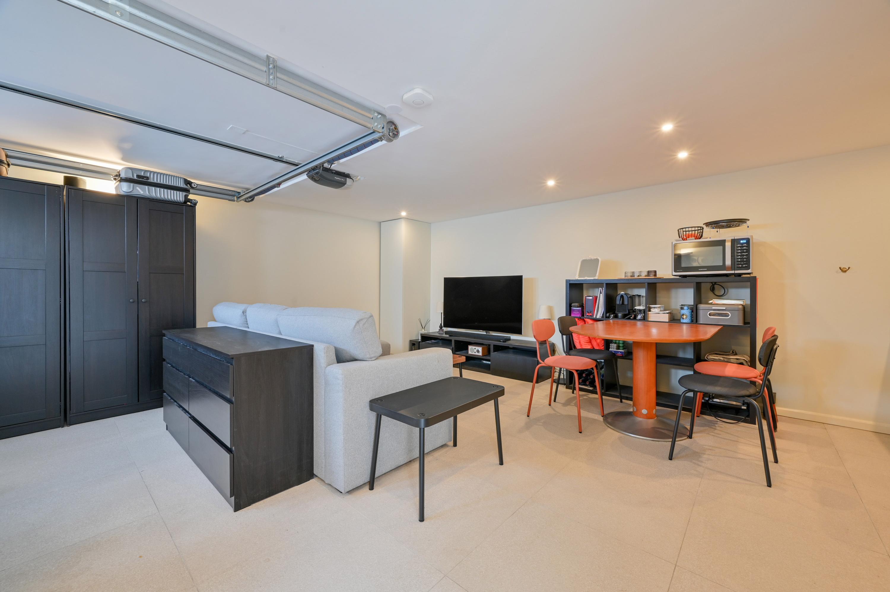 Beneath the terrace, there is a garage accessible via a fixed staircase, currently used as a studio complete with a kitchenette, toilet, electric underfloor heating, and air conditioning. The garage is also accessible via an electric door at the rear of the property.