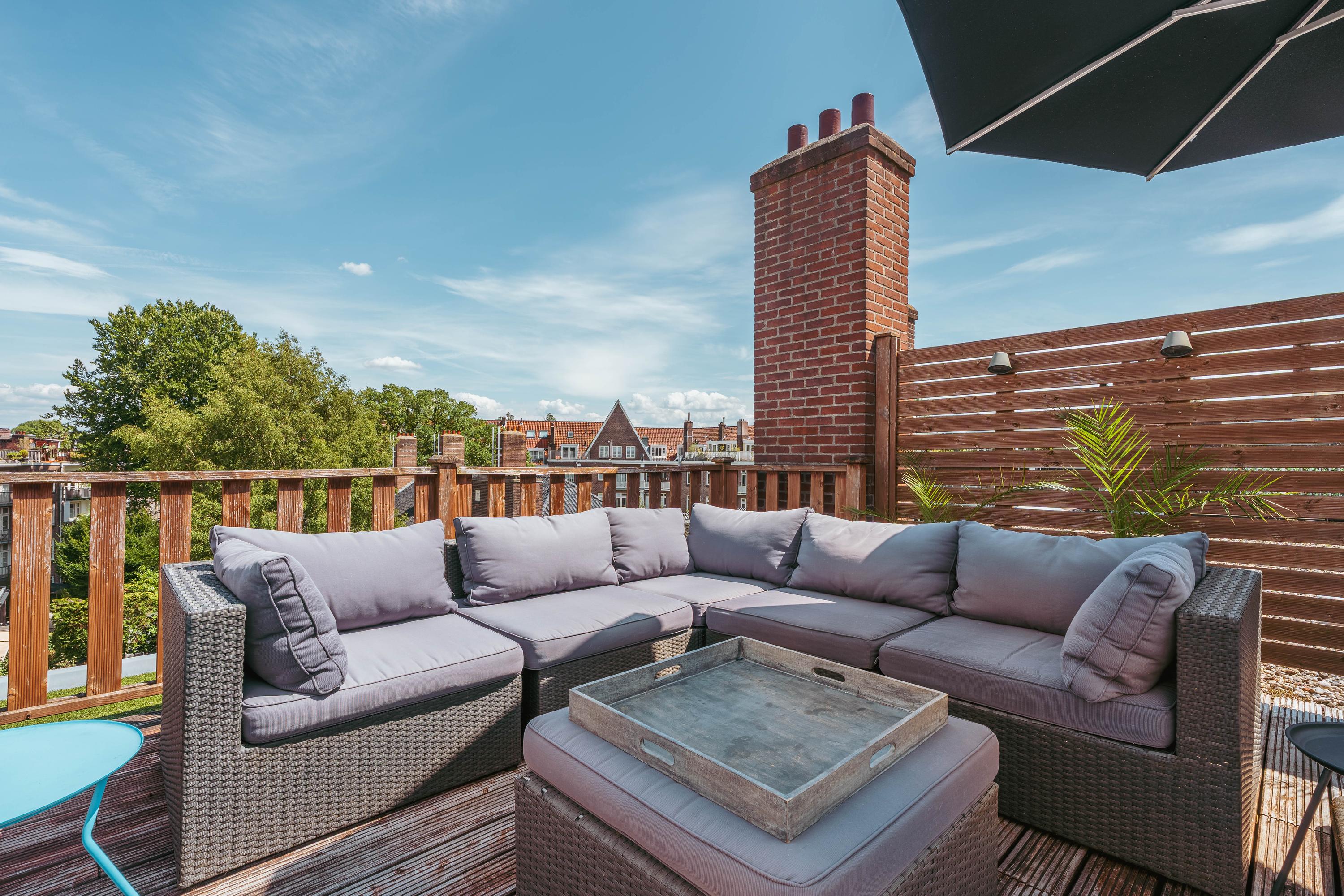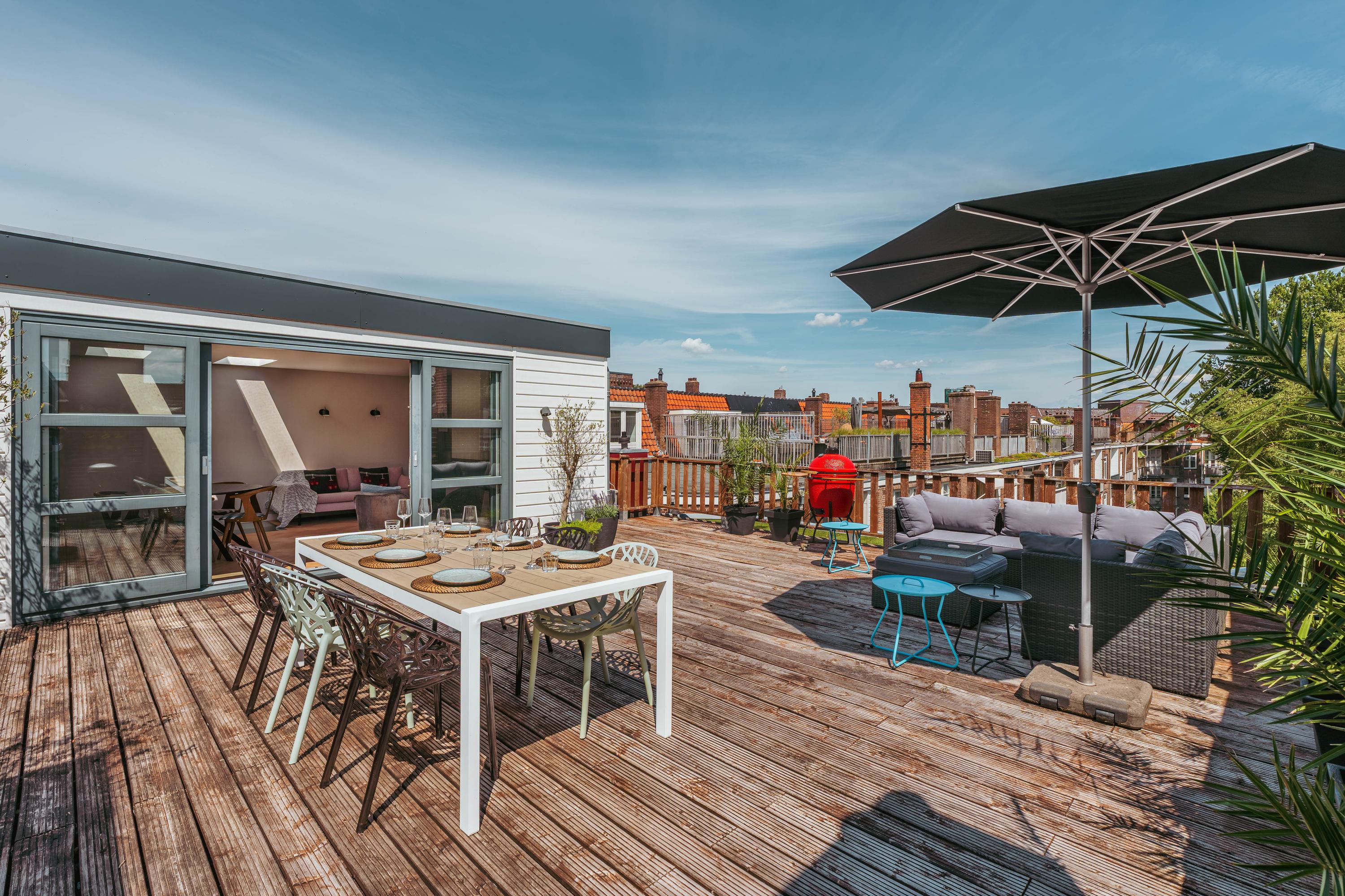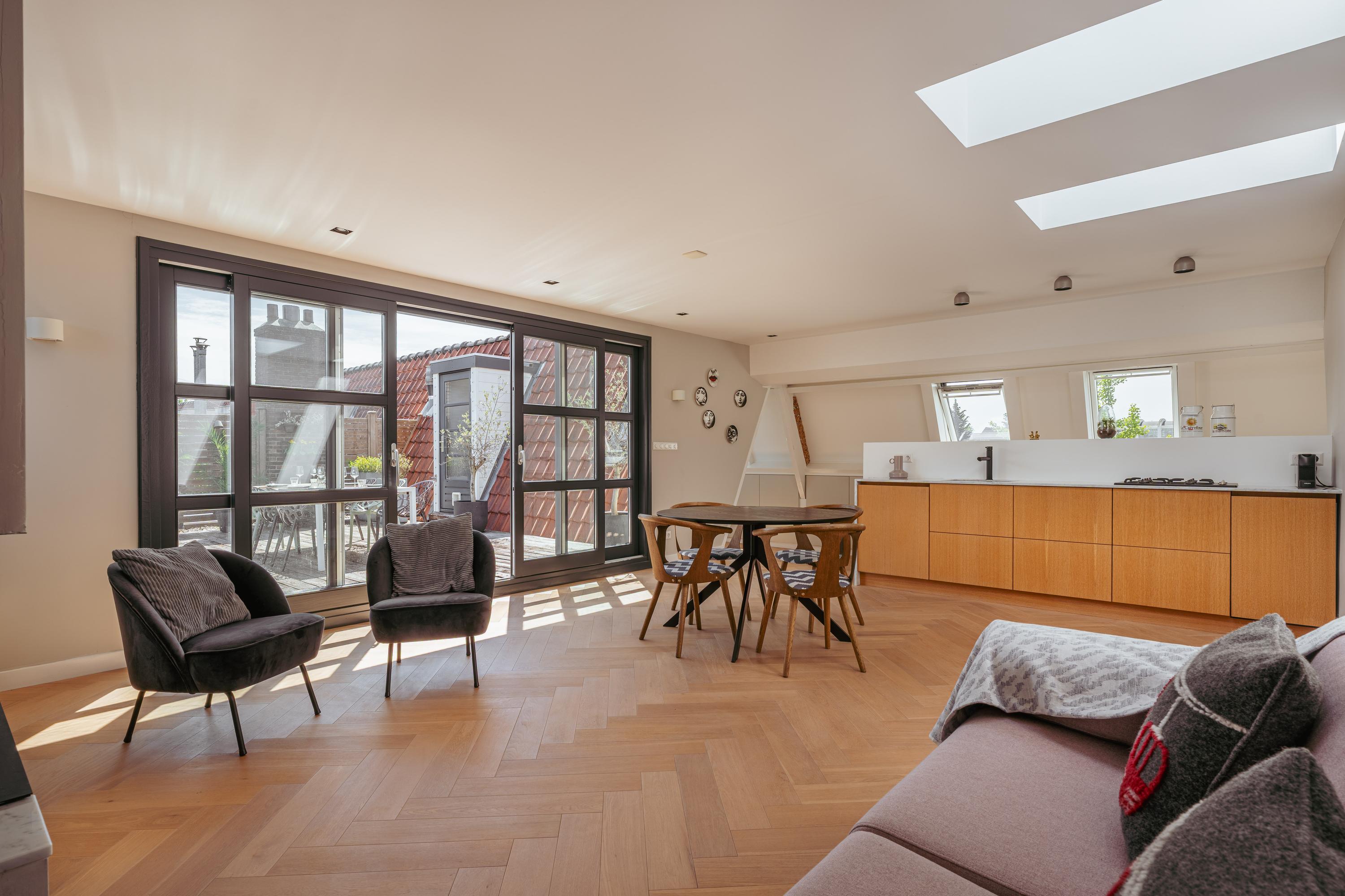 Very spacious and exceptionally bright upper house (approx. 334 m²) with 60 m² roof terrace, three balconies, luxury kitchen-diner and atmospheric living room at a prime location in Amsterdam Zuid!