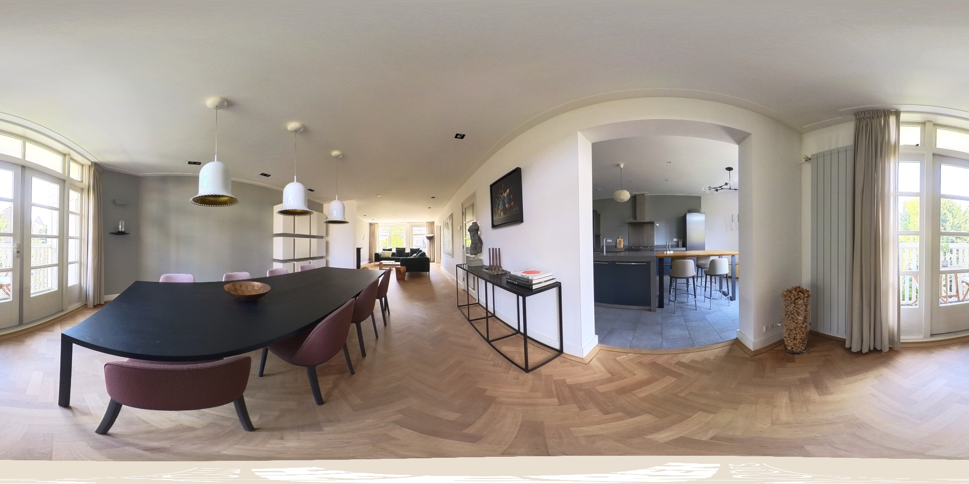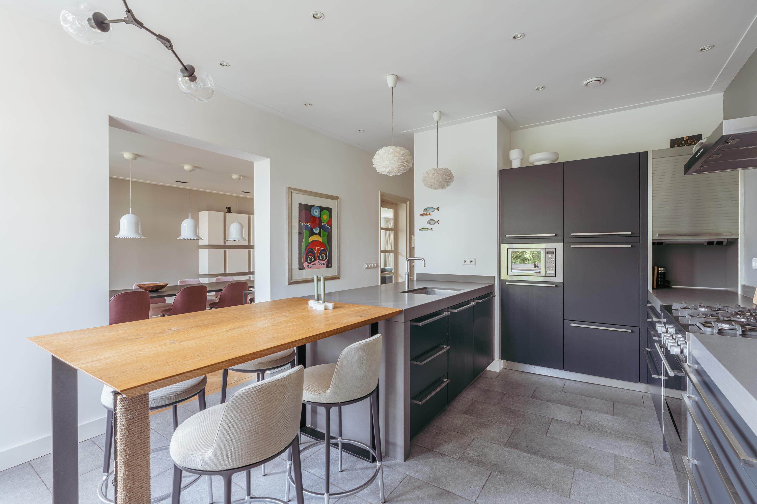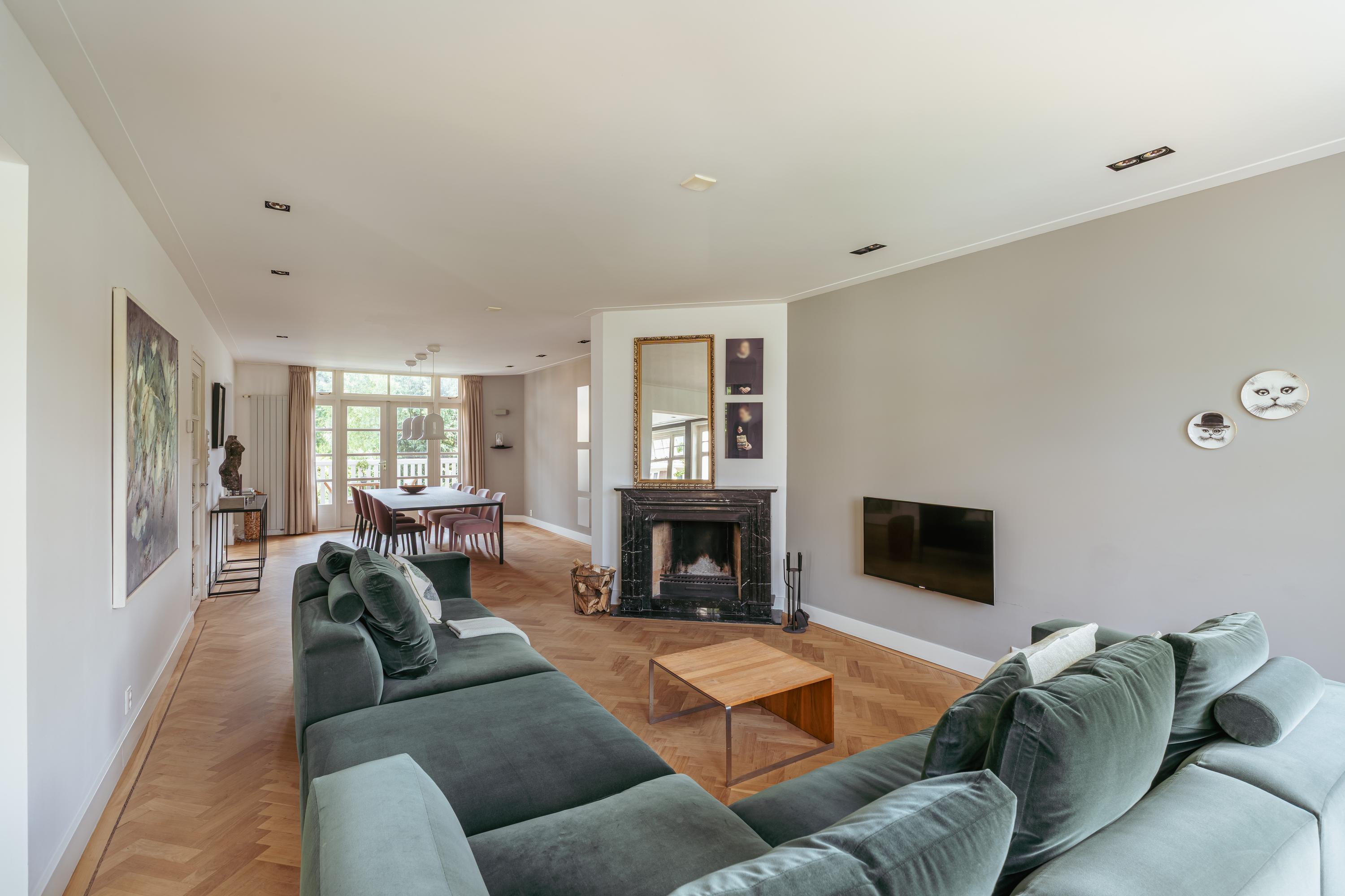 The particularly spacious living room with adjoining side room features an atmospheric fireplace with an impressive natural stone mantelpiece. French doors provide access to the rear balcony. The living room, entrance hall and central hall are fitted with a beautiful cherry wood herringbone parquet floor, adding warmth and character. The kitchen-diner is equipped with a U-shaped kitchen with breakfast bar and various built-in appliances, including a 5-burner gas hob with oven (Miele), dishwasher (Miele), fridge-freezer (Liebherr), microwave (Siemens) and a Quooker. The floor here is finished with natural stone tiles. The rear balcony can be accessed from both the living room and kitchen.