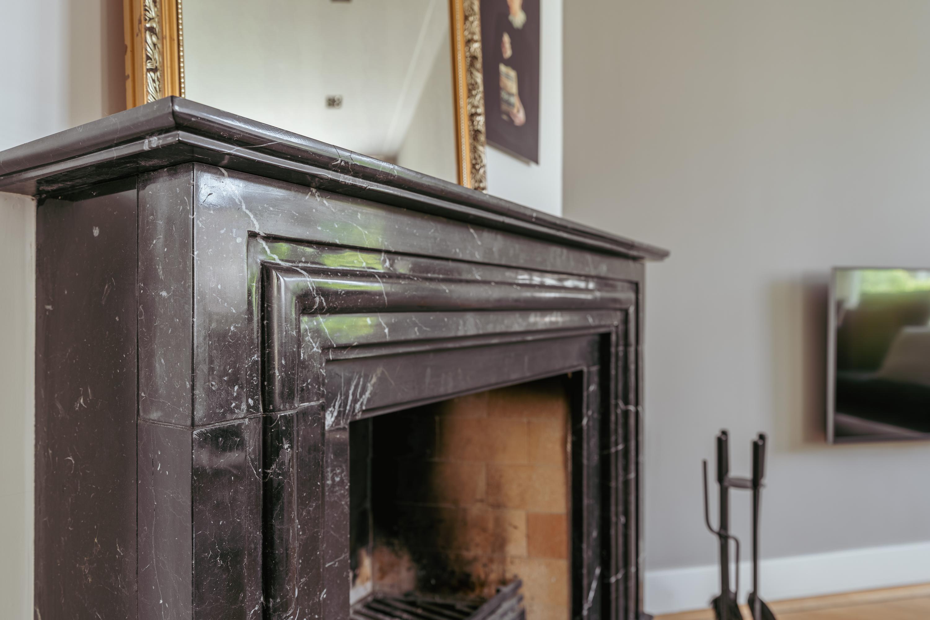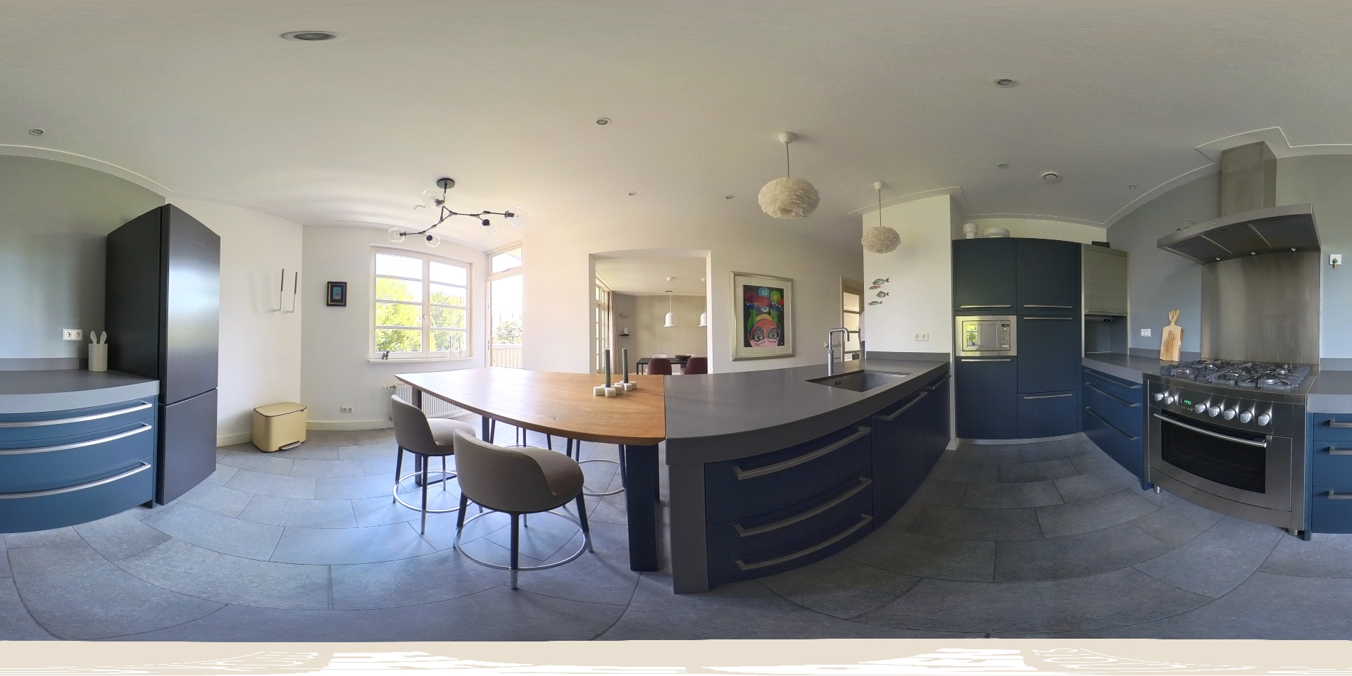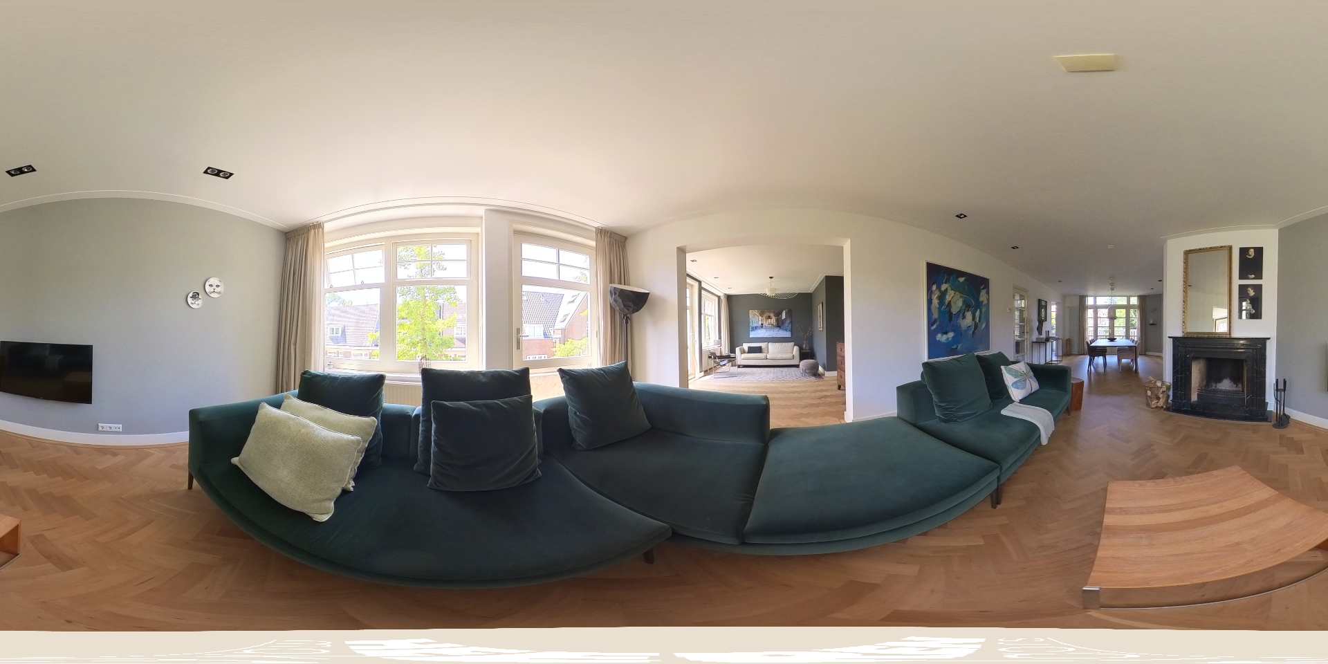 The particularly spacious living room with adjoining side room features an atmospheric fireplace with an impressive natural stone mantelpiece. French doors provide access to the rear balcony. The living room, entrance hall and central hall are fitted with a beautiful cherry wood herringbone parquet floor, adding warmth and character. The kitchen-diner is equipped with a U-shaped kitchen with breakfast bar and various built-in appliances, including a 5-burner gas hob with oven (Miele), dishwasher (Miele), fridge-freezer (Liebherr), microwave (Siemens) and a Quooker. The floor here is finished with natural stone tiles. The rear balcony can be accessed from both the living room and kitchen.
