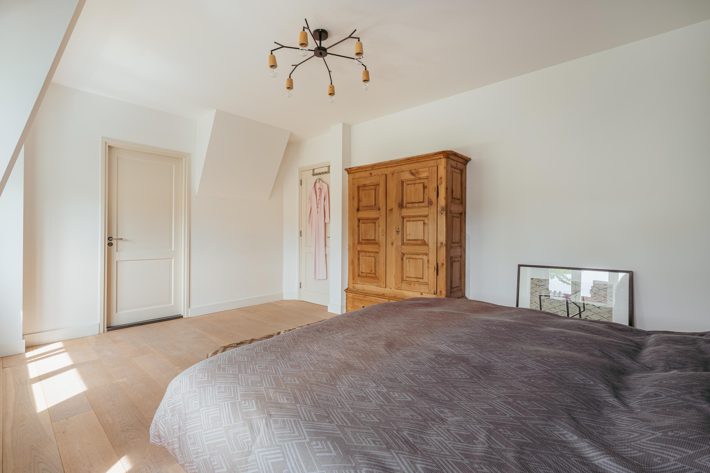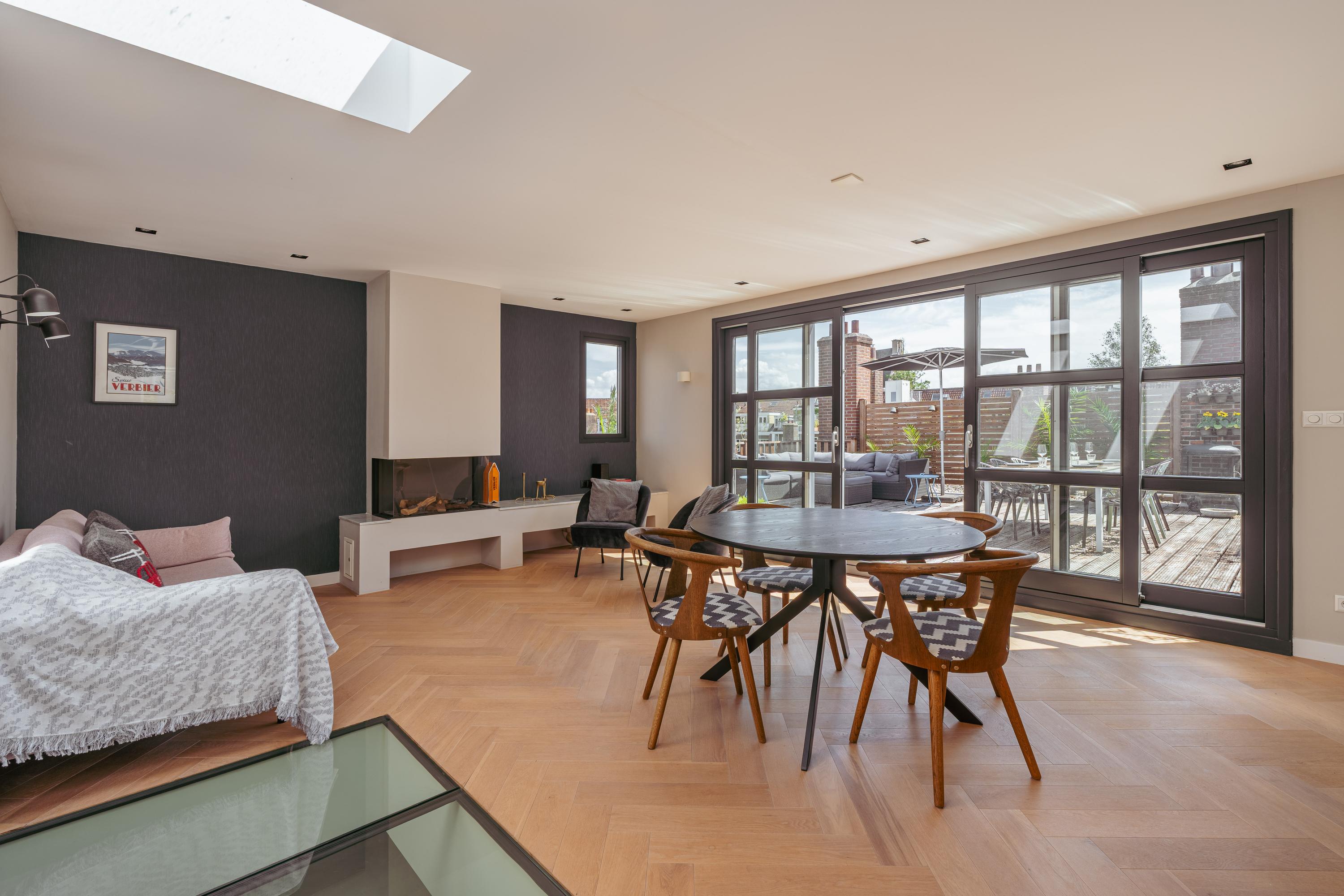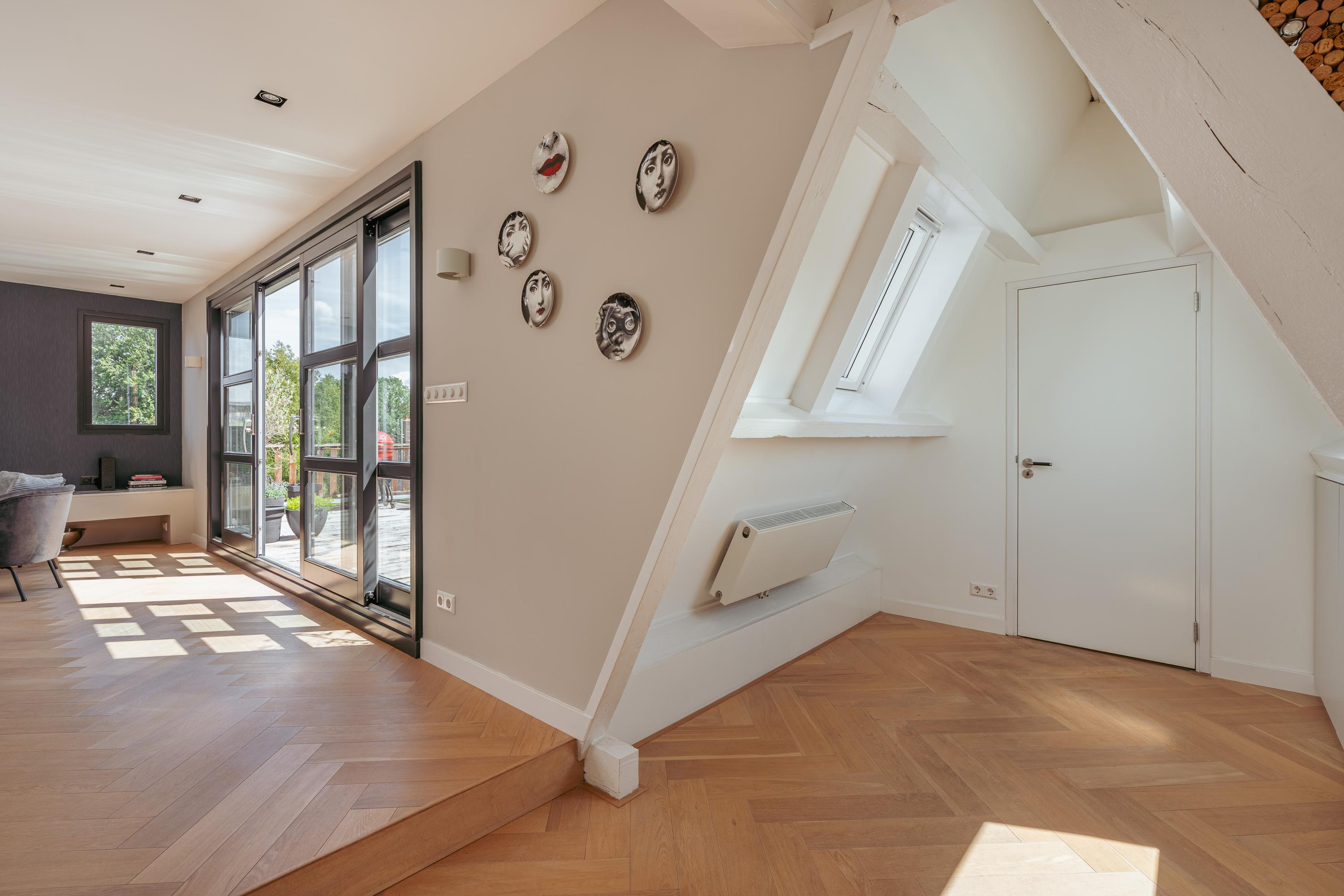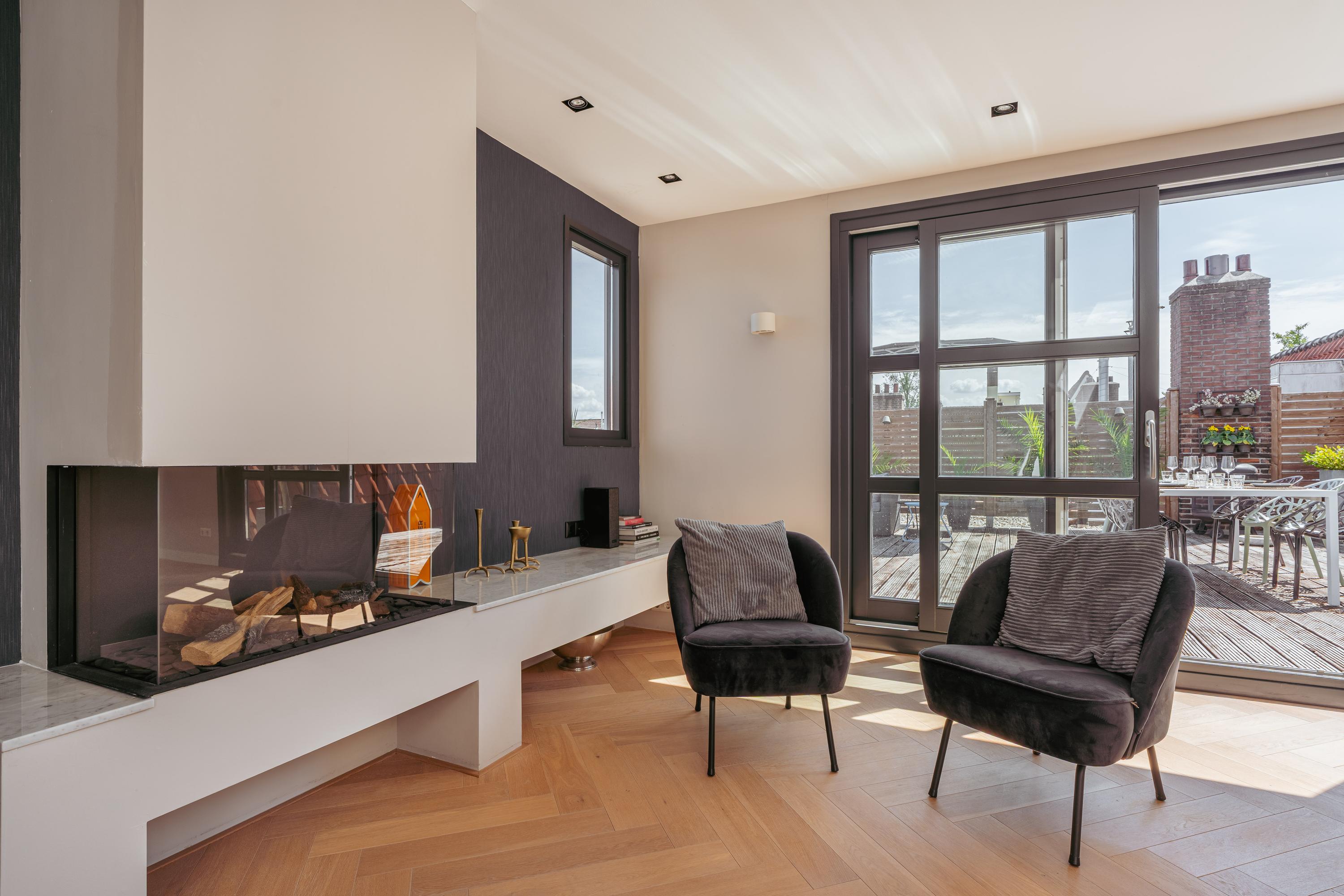 A fixed staircase leads to the attic floor, currently used as an additional living room with kitchen, making it ideal in combination with the large roof terrace. This floor also features a cozy gas fireplace and multiple skylights that flood the space with natural light. In addition, there is a practical storage room with plenty of space.