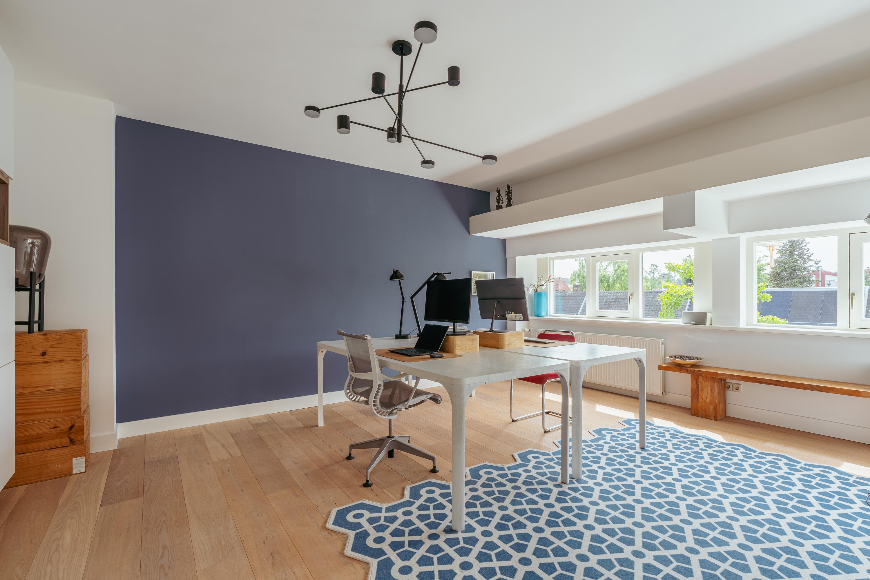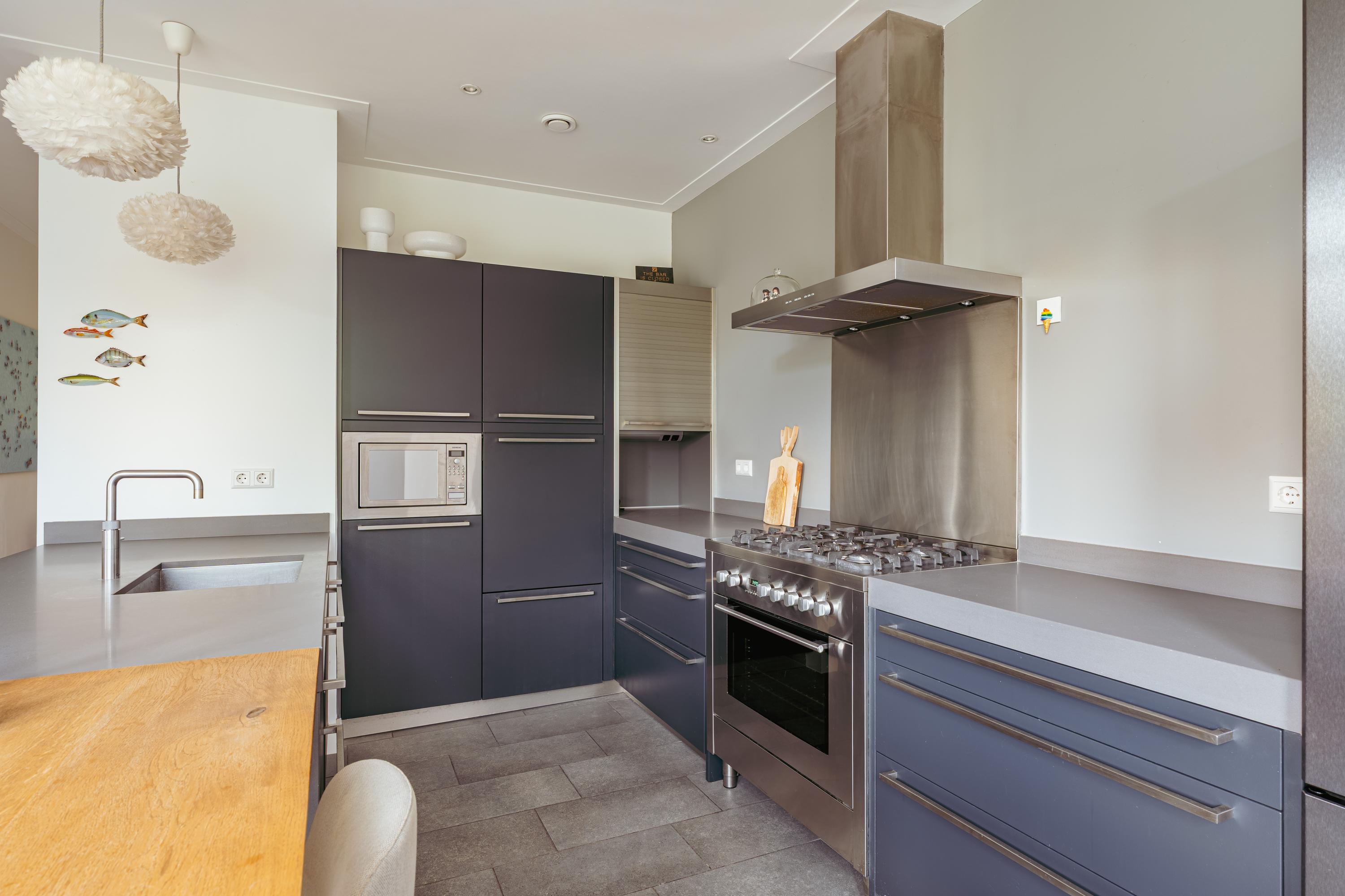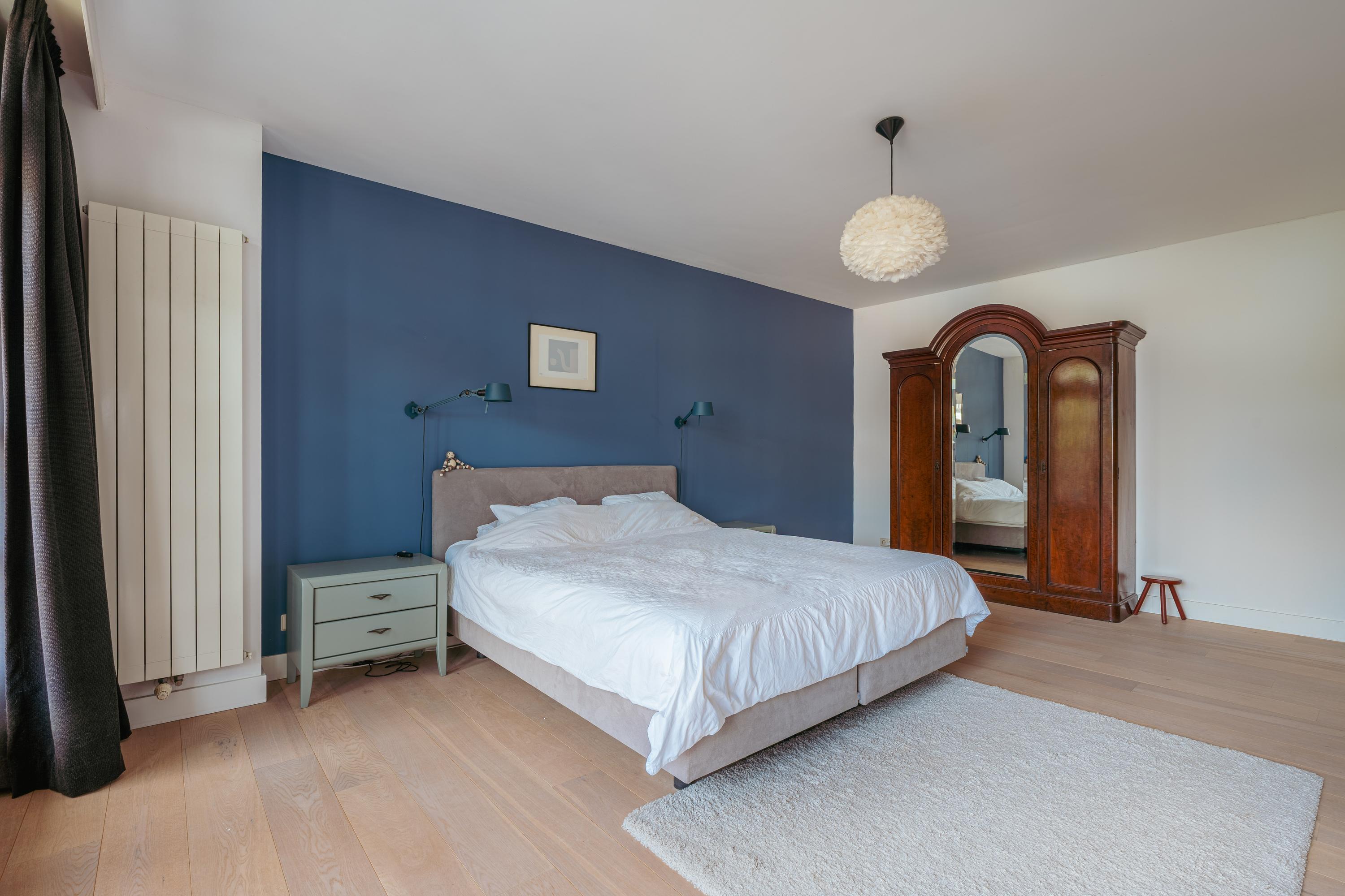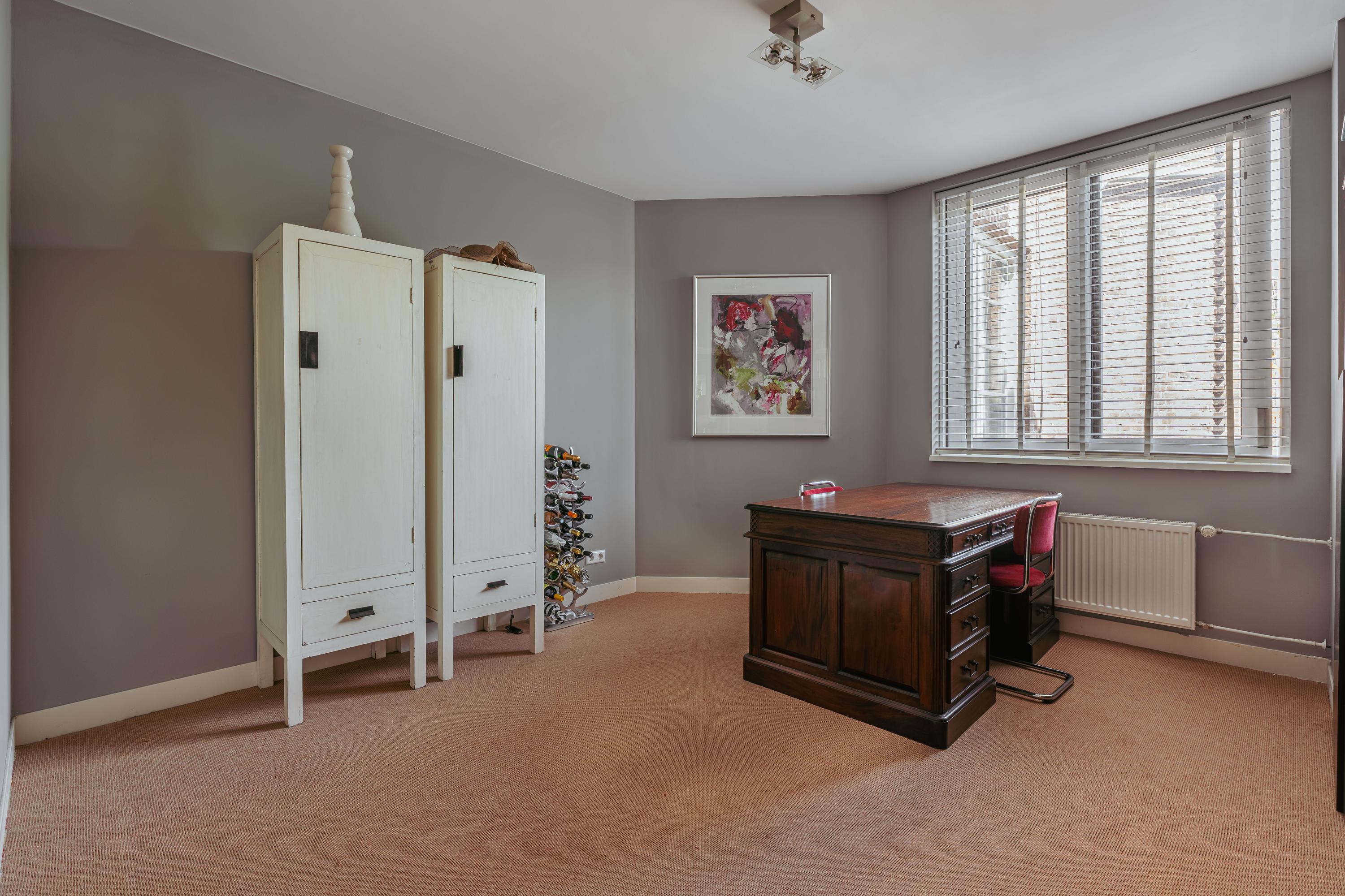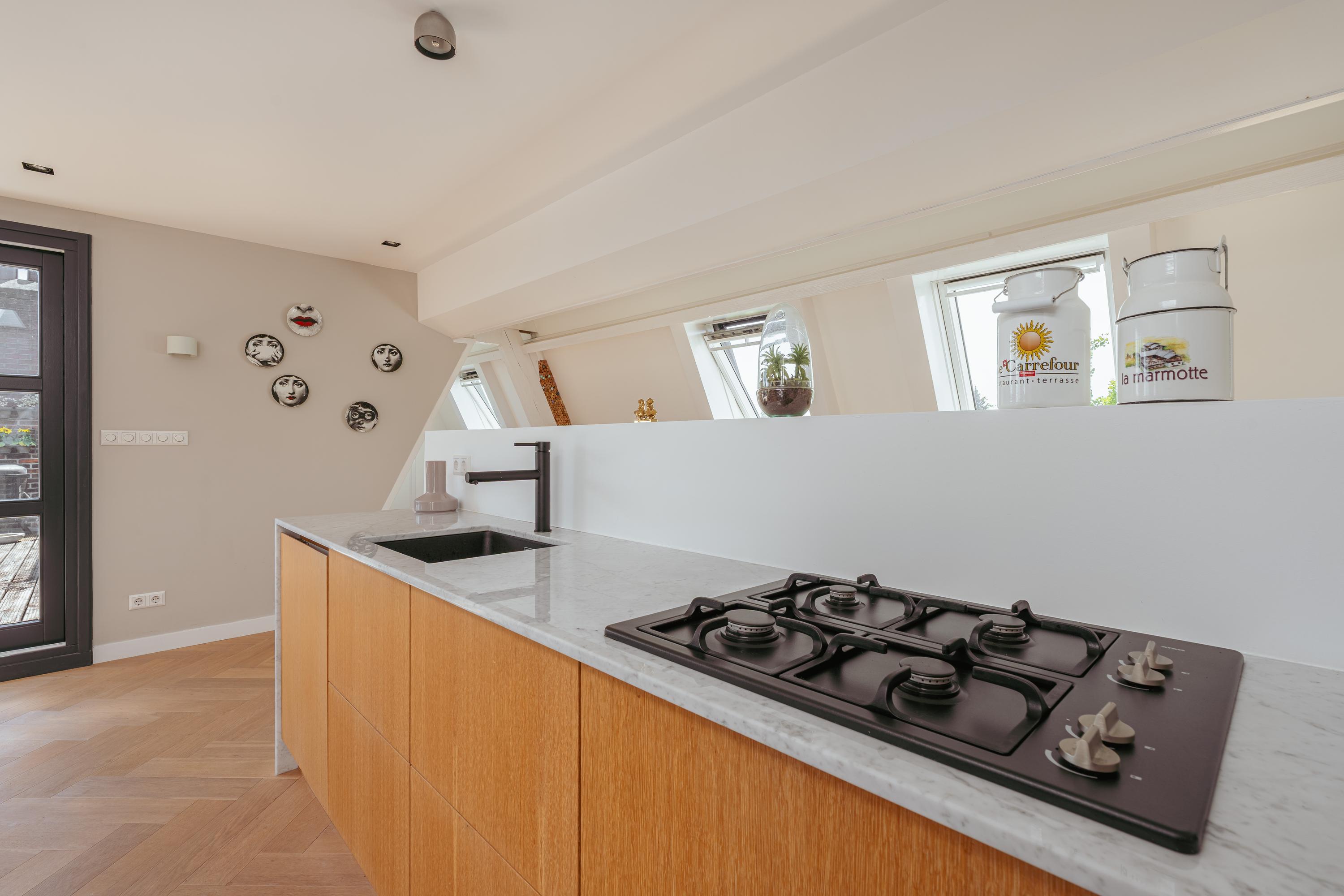 A fixed staircase leads to the attic floor, currently used as an additional living room with kitchen, making it ideal in combination with the large roof terrace. This floor also features a cozy gas fireplace and multiple skylights that flood the space with natural light. In addition, there is a practical storage room with plenty of space.