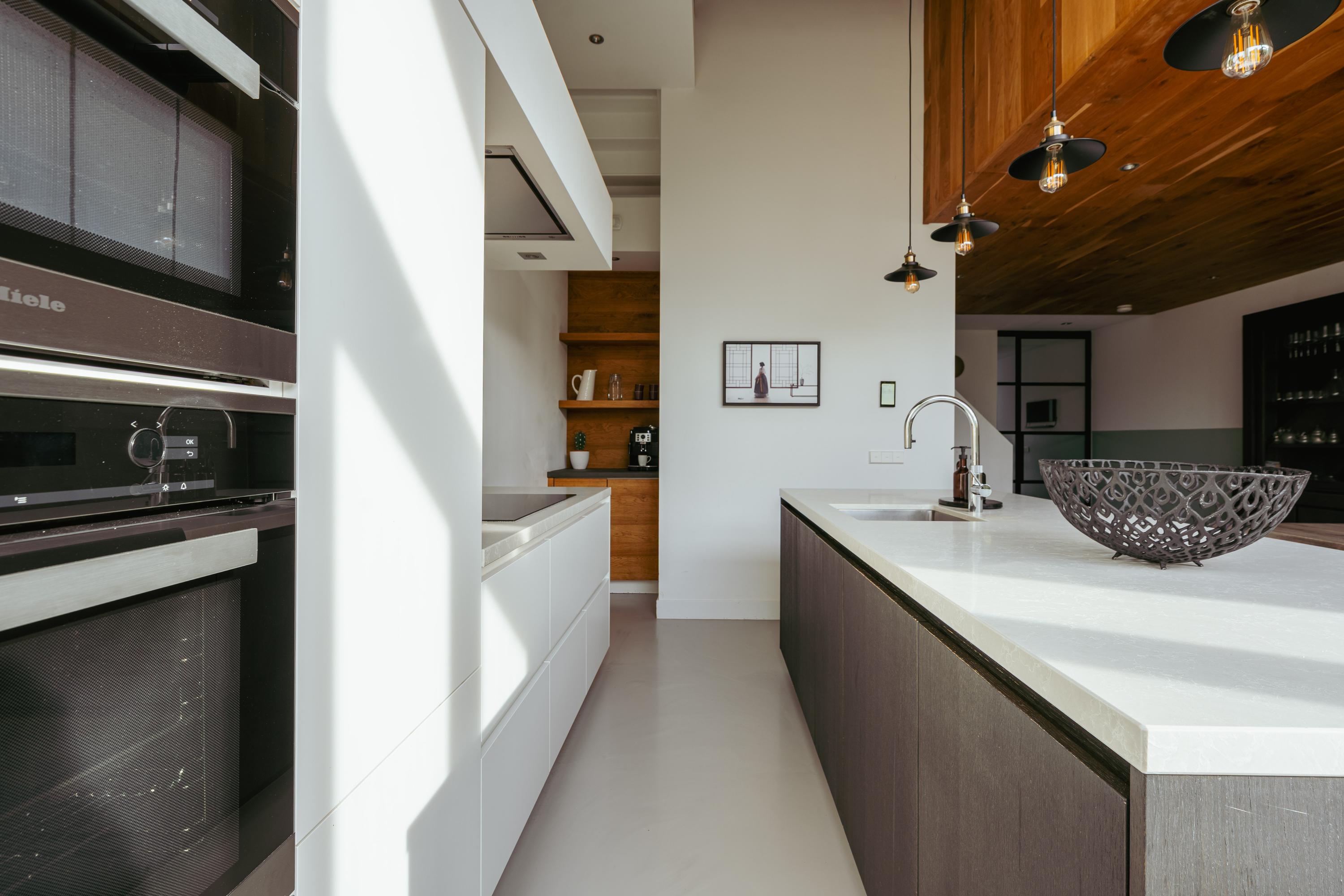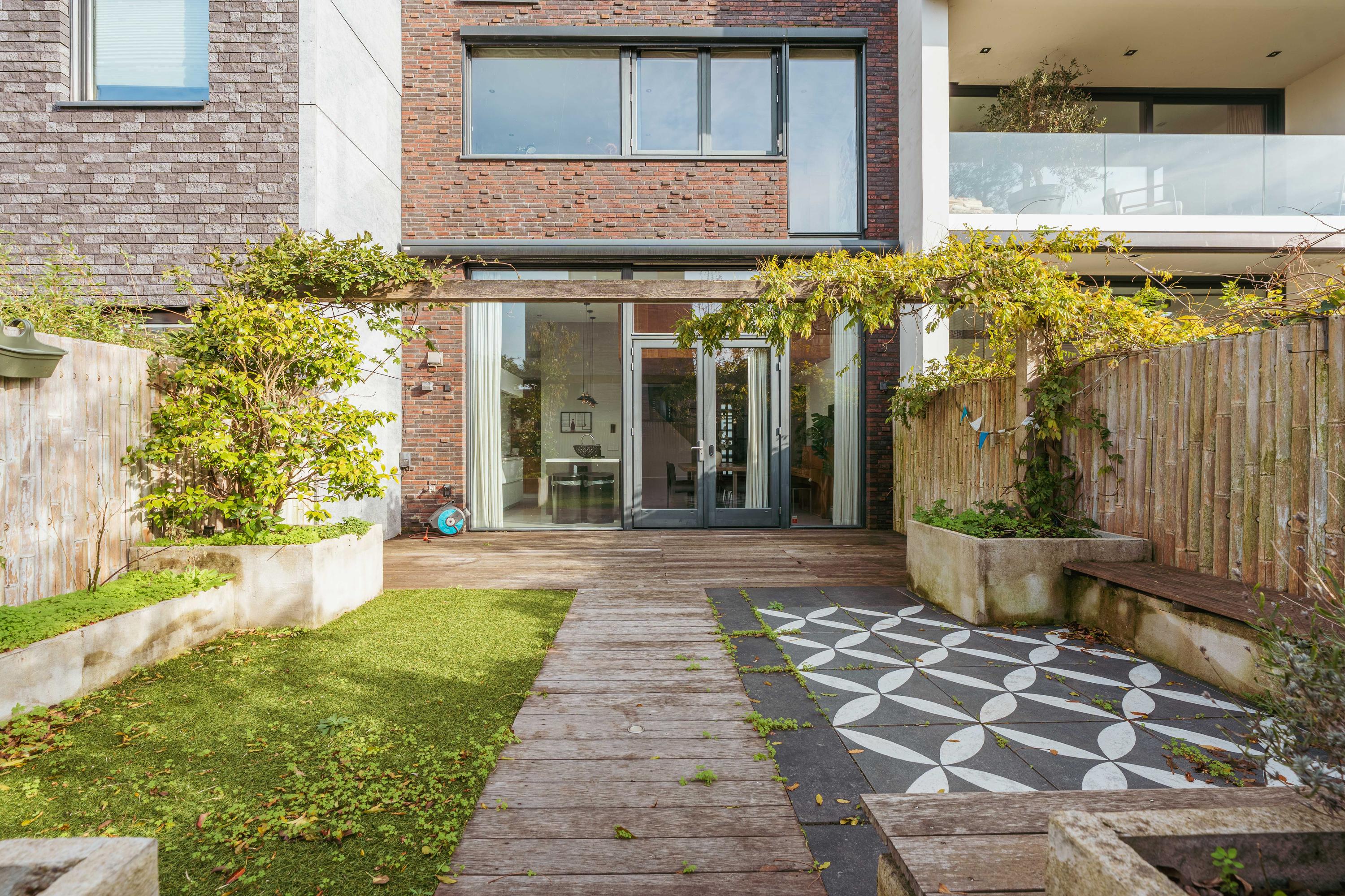 The custom-designed kitchen features a large cooking island with a composite worktop and premium built-in appliances, including a Quooker, induction cooktop, dishwasher, microwave, oven, and plate warmer. French doors open onto the beautifully landscaped, low-maintenance garden of approximately 54 m², with wooden decking, stone paving, and lush greenery. A private gate provides direct access to the back area with two private parking spaces equipped with an electric charging station.