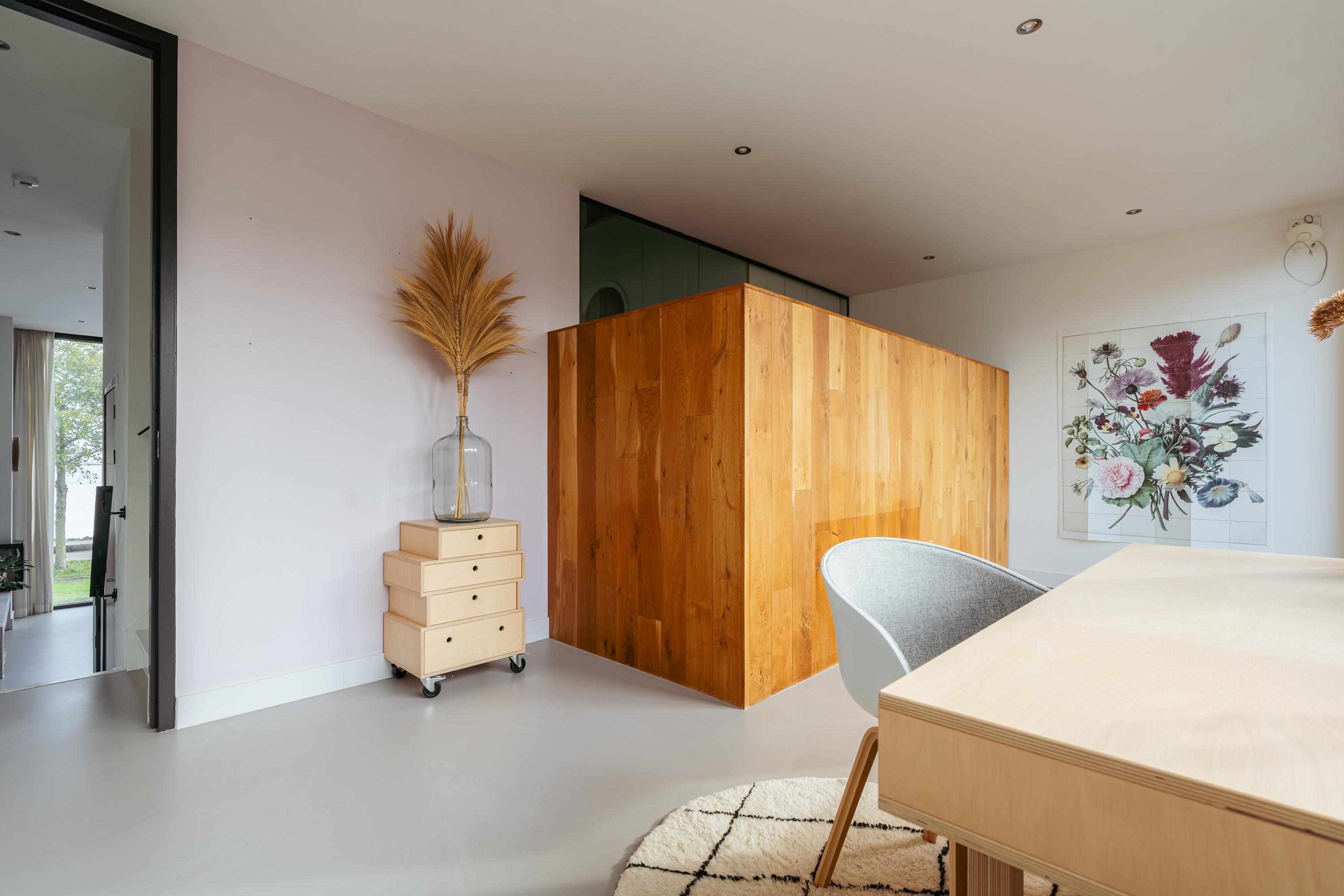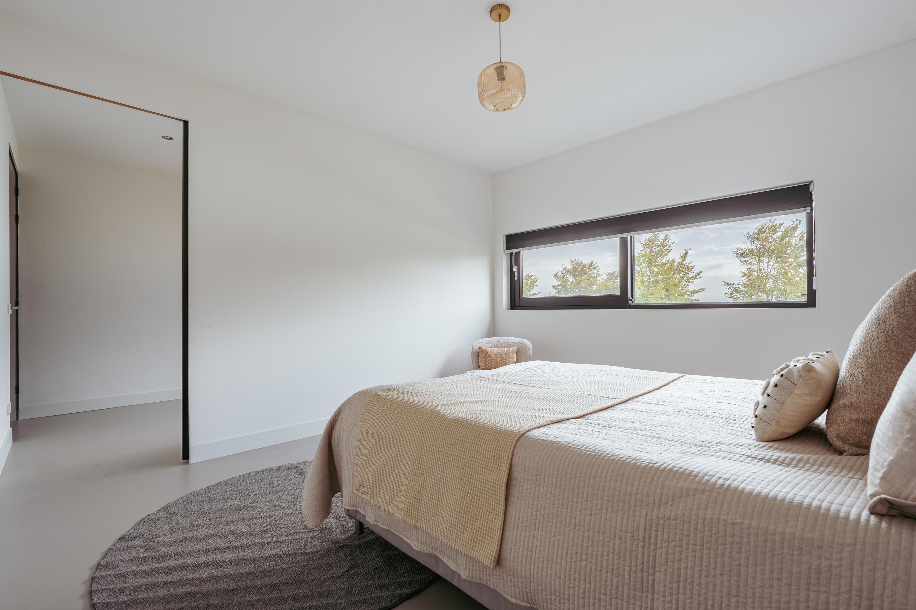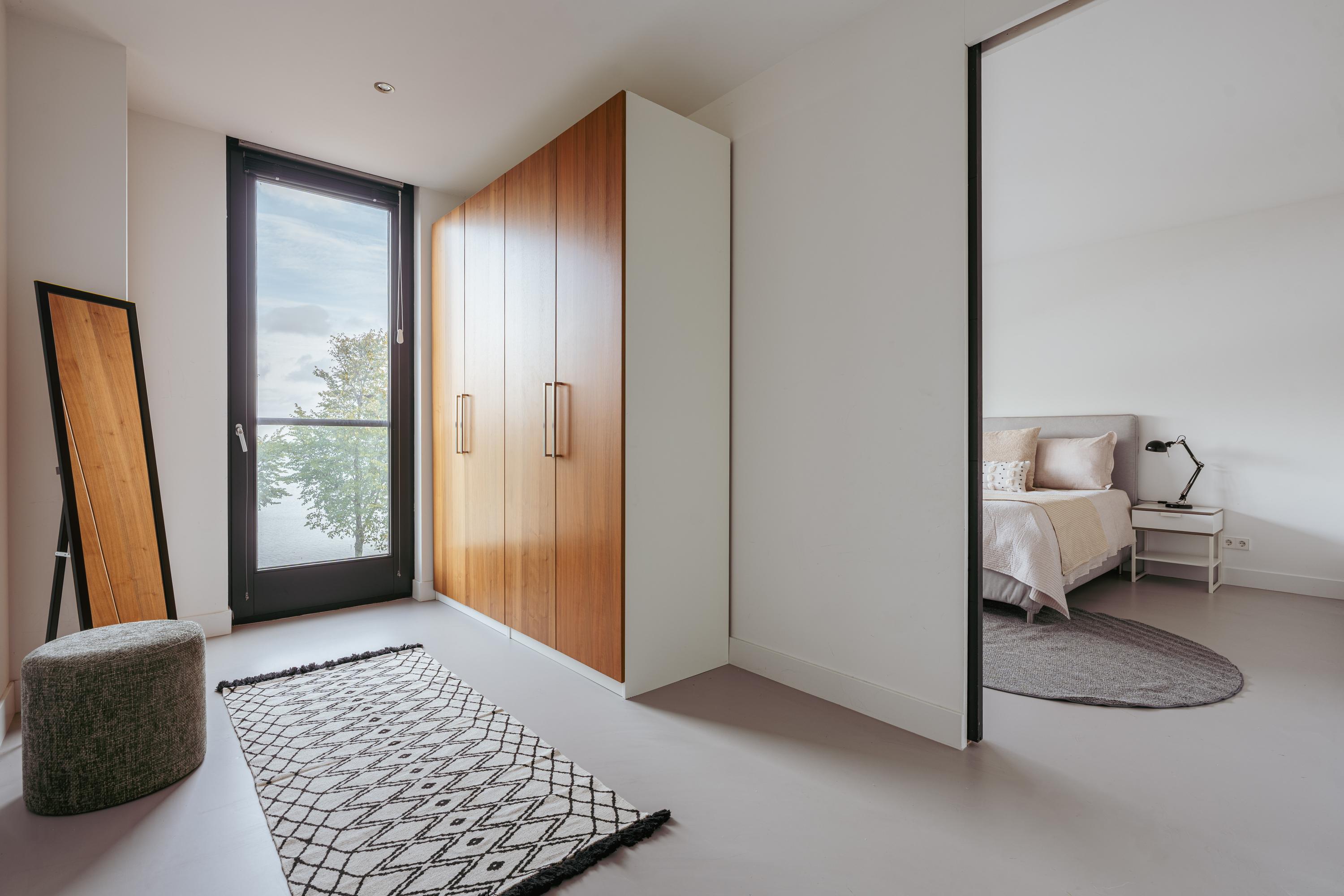 At the front of the house lies a very spacious bedroom, currently arranged as a stylish master suite. The full-width window offers spectacular panoramic views over the IJmeer, while the glass partition wall and soft, neutral color palette create a modern and airy atmosphere.