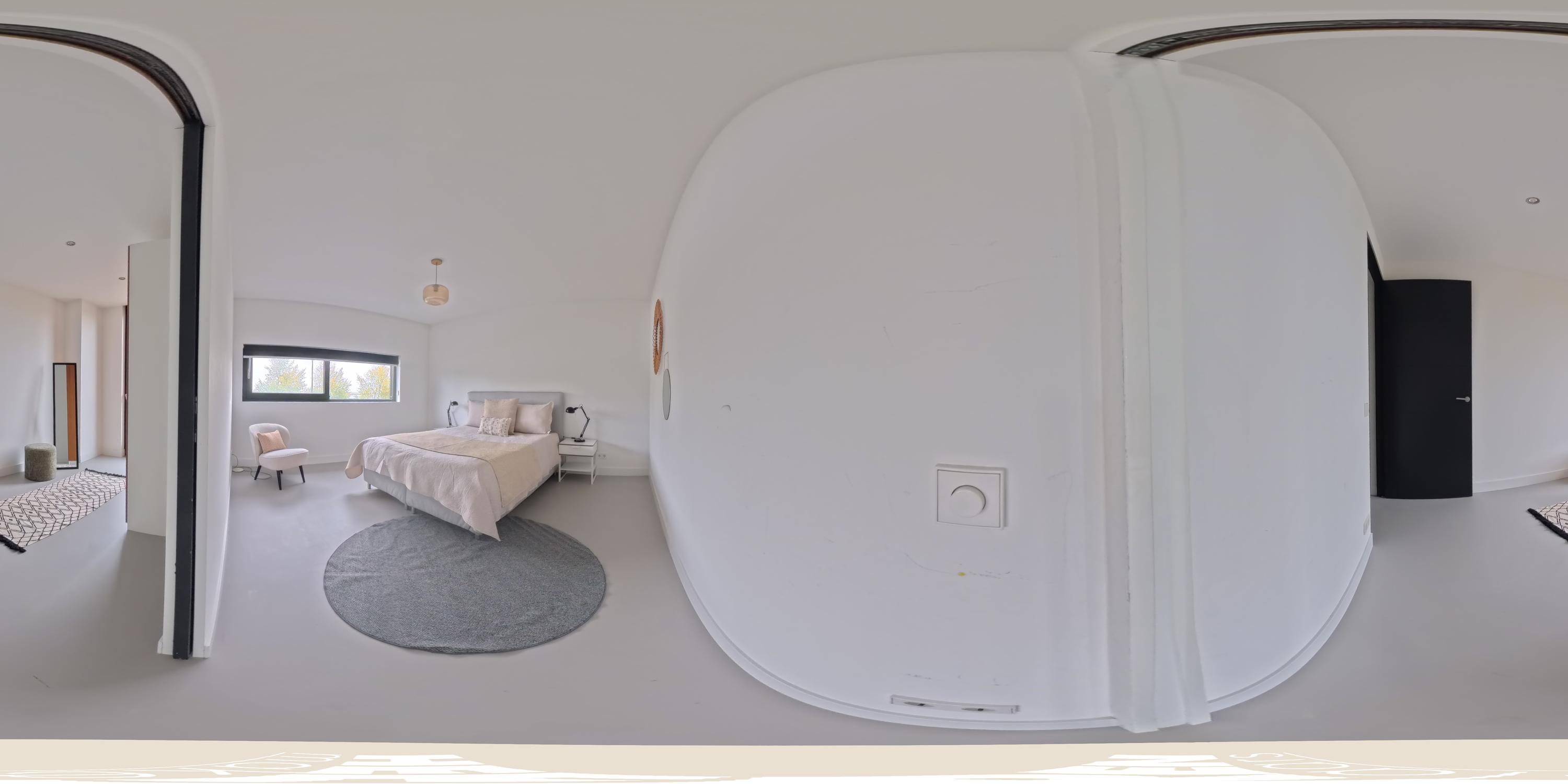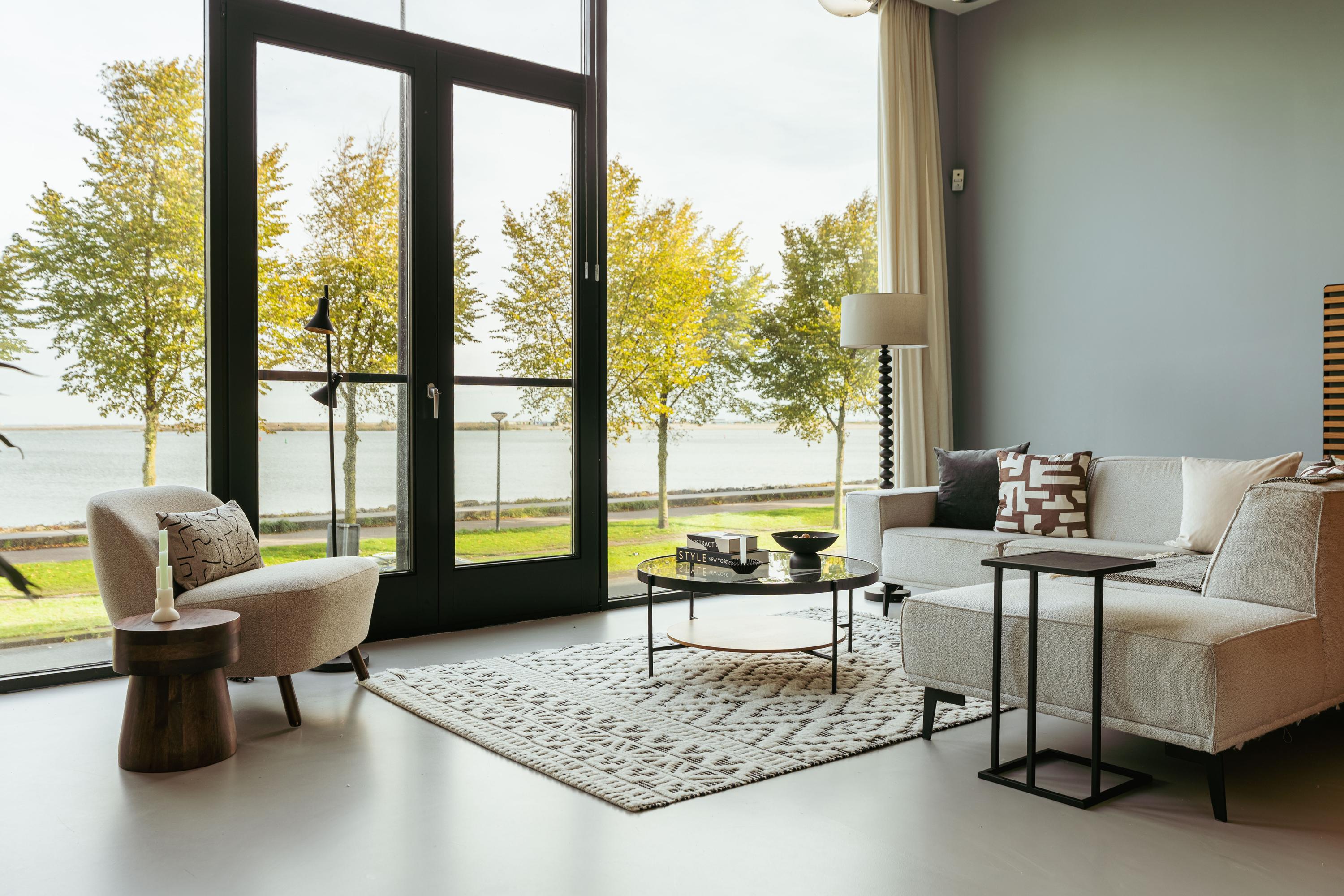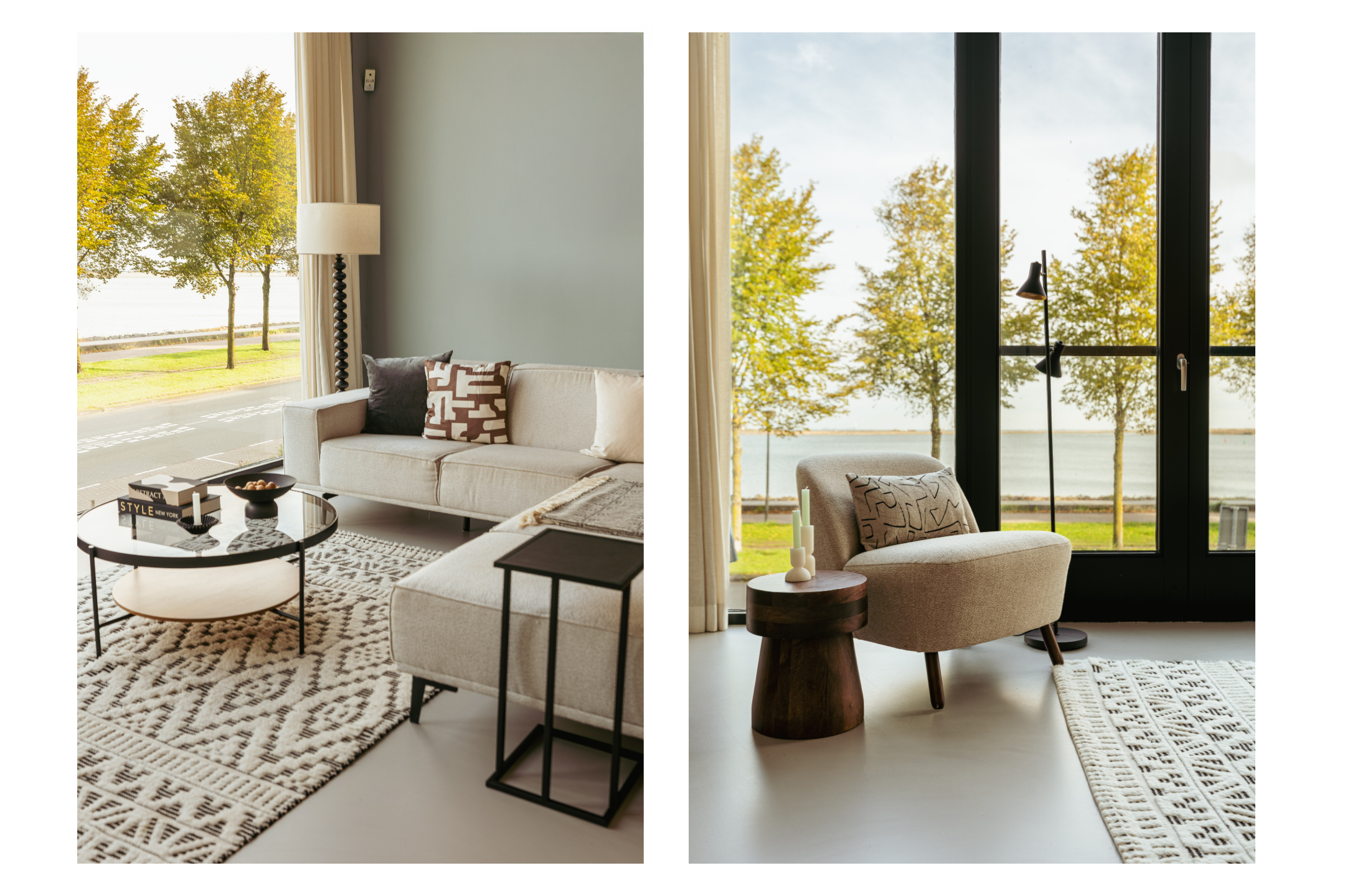 At the front of the house lies a very spacious bedroom, currently arranged as a stylish master suite. The full-width window offers spectacular panoramic views over the IJmeer, while the glass partition wall and soft, neutral color palette create a modern and airy atmosphere.