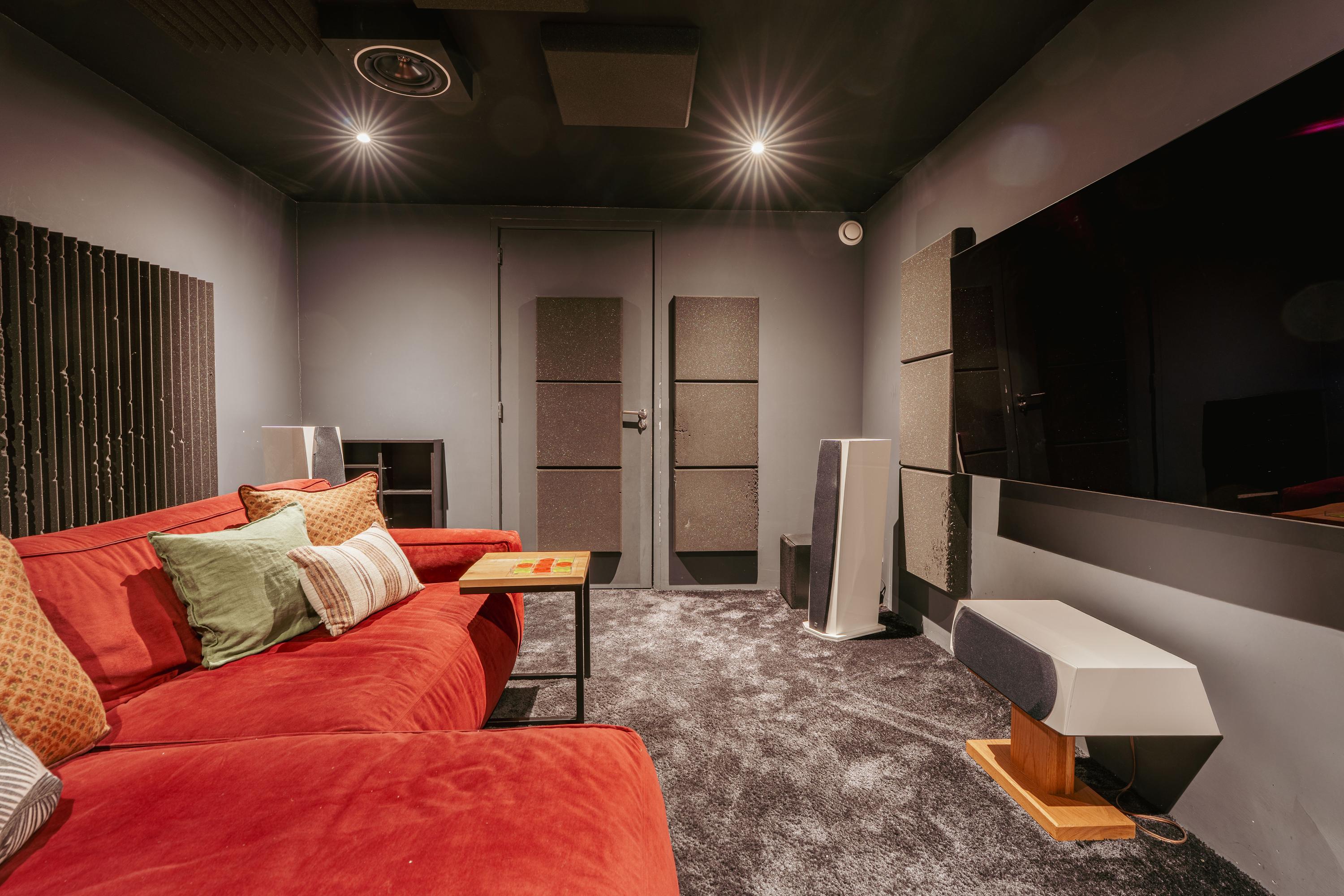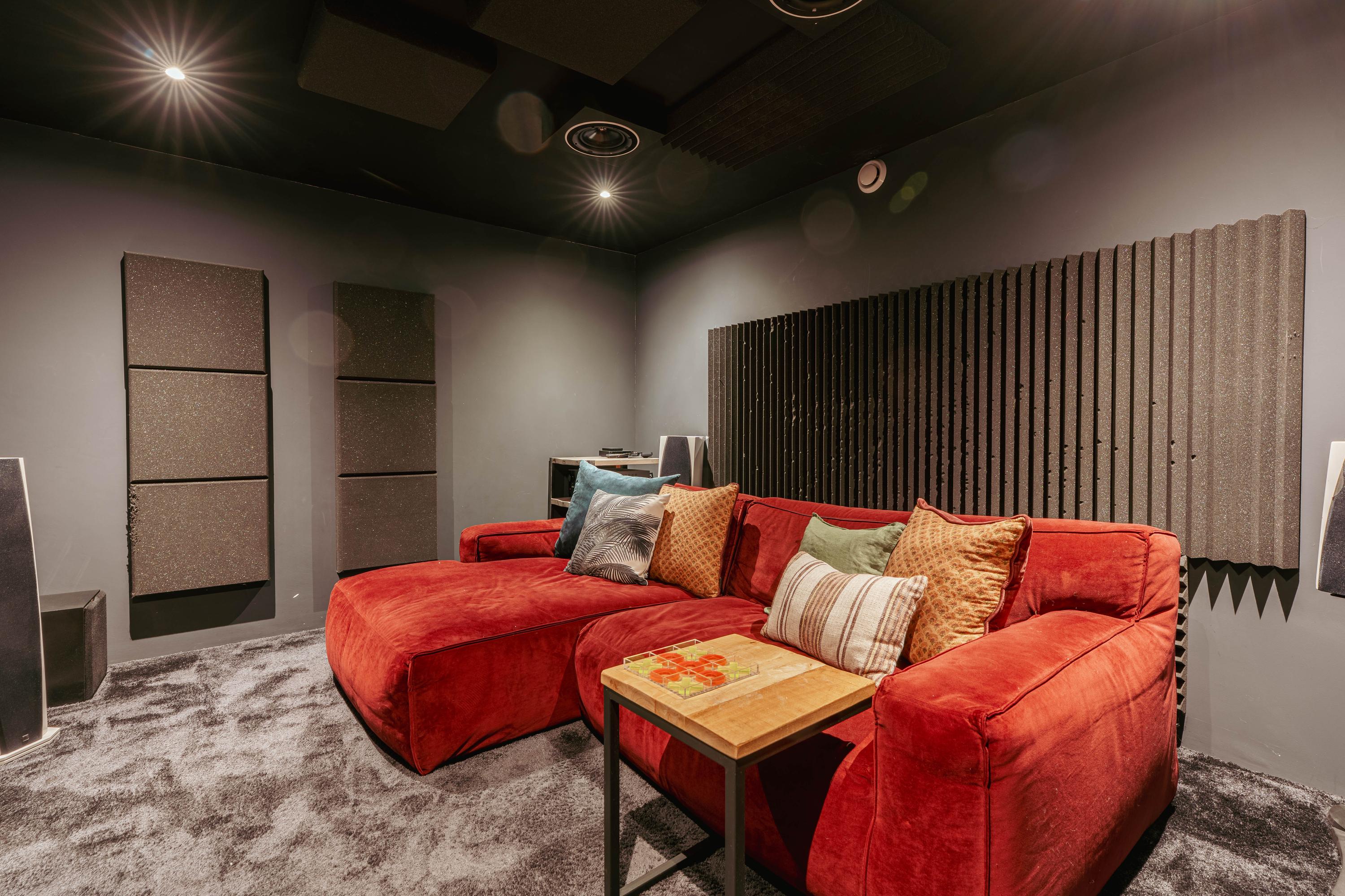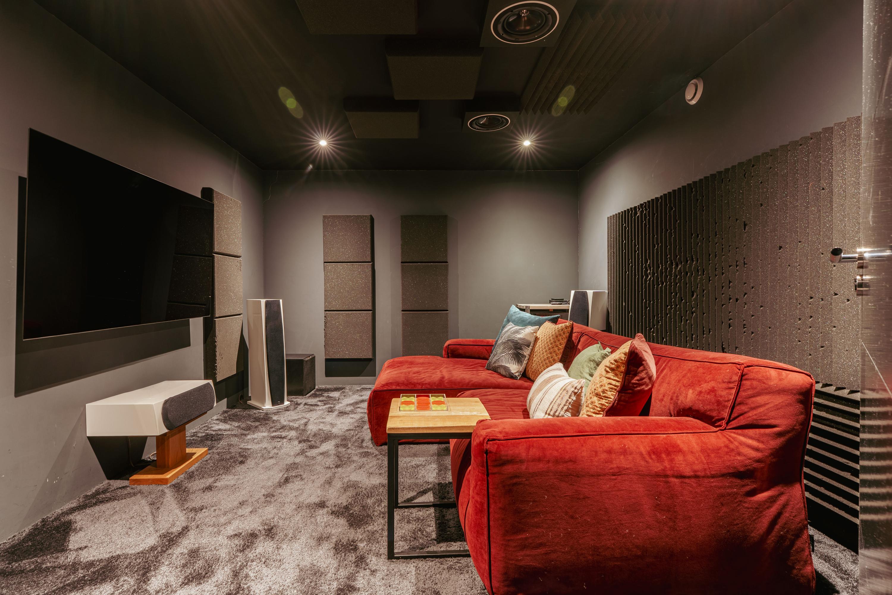 Adjoining the living room is a fully soundproofed home cinema, finished with acoustic wall panels — the perfect retreat for movie nights or enjoying music in peace. At the rear, another spacious room overlooks the green courtyard and can serve as a home office, playroom, or guest room.