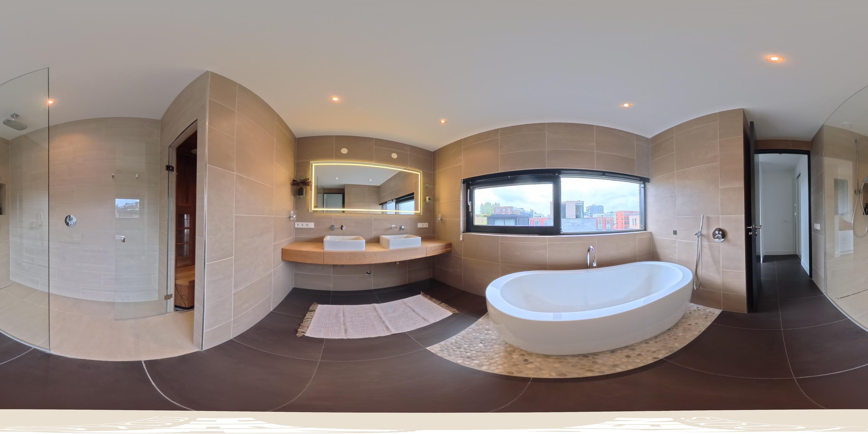 The luxurious bathroom exudes tranquility and sophistication, finished in warm earth tones and high-quality materials. It features a freestanding bathtub, walk-in rain shower, double washbasin, and a sauna — a wonderful private retreat to relax after a busy day.