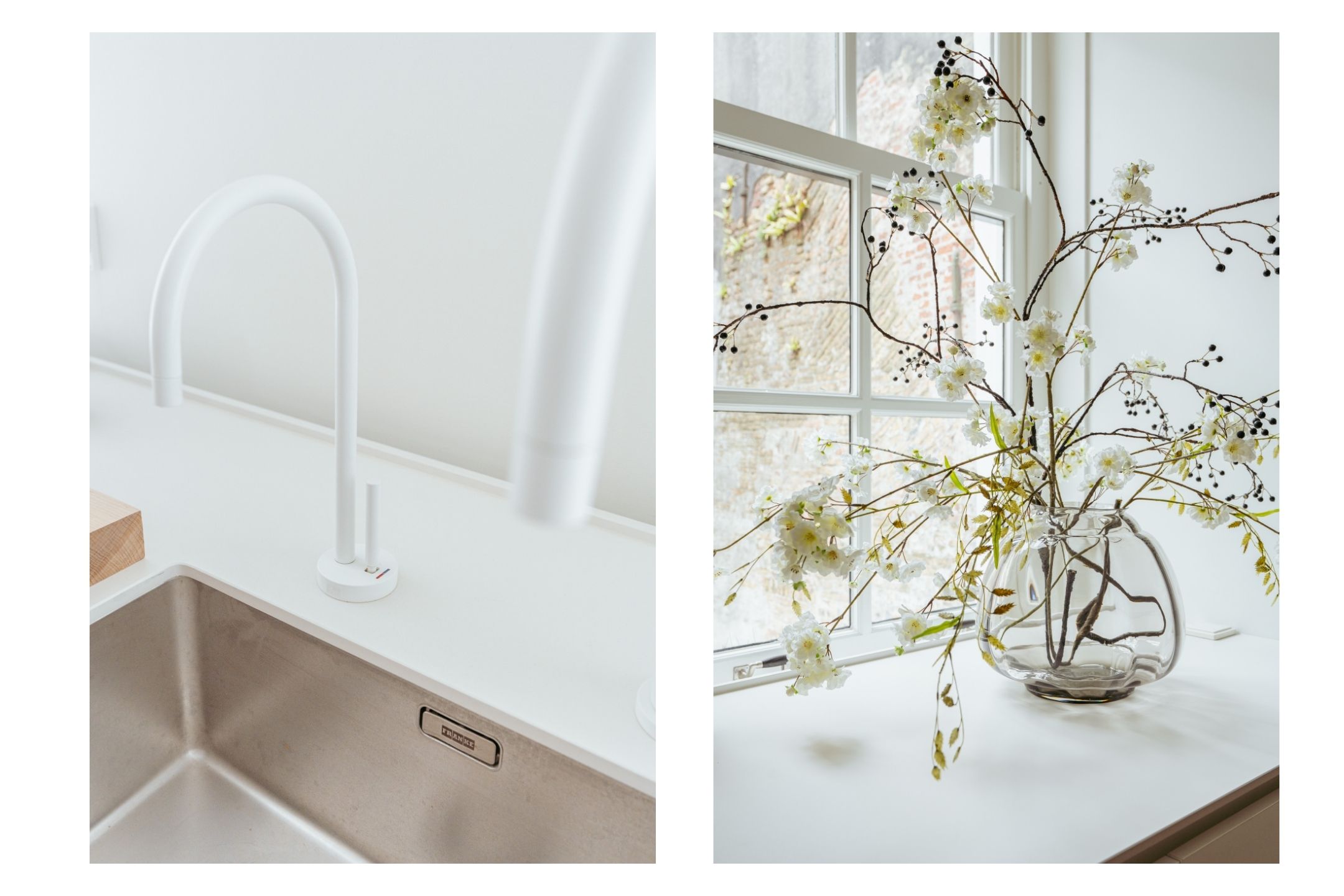 This floor is entirely dedicated to living and entertaining. At the rear is the modern kitchen — the heart of the home. It includes high-end built-in appliances: fridge, freezer, combi oven and microwave, Quooker tap, and a sleek induction cooktop with integrated extractor fan. Ample storage keeps the space minimalist and tidy. The centrally placed island includes a bar area for informal dining. At the front is the living area, where large windows offer a sweeping view over the canal. The combination of natural light, warm wooden floors, and subtle finishes create a calm, inviting ambiance. French doors open to a hallway with a separate toilet, and a staircase leads to the third floor.