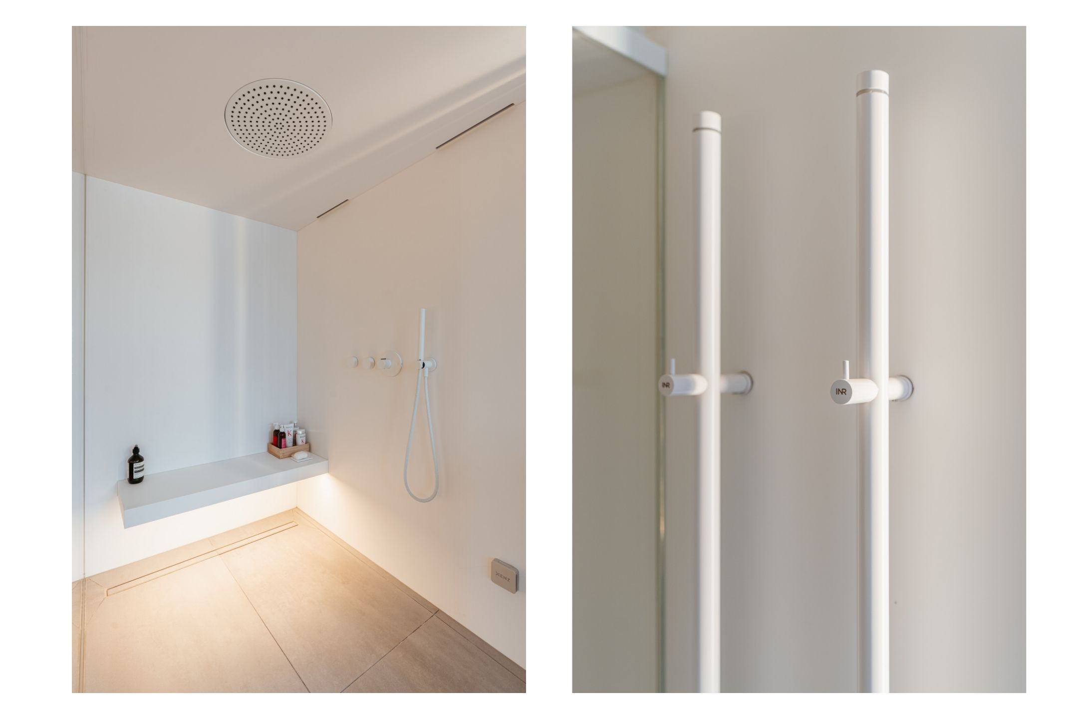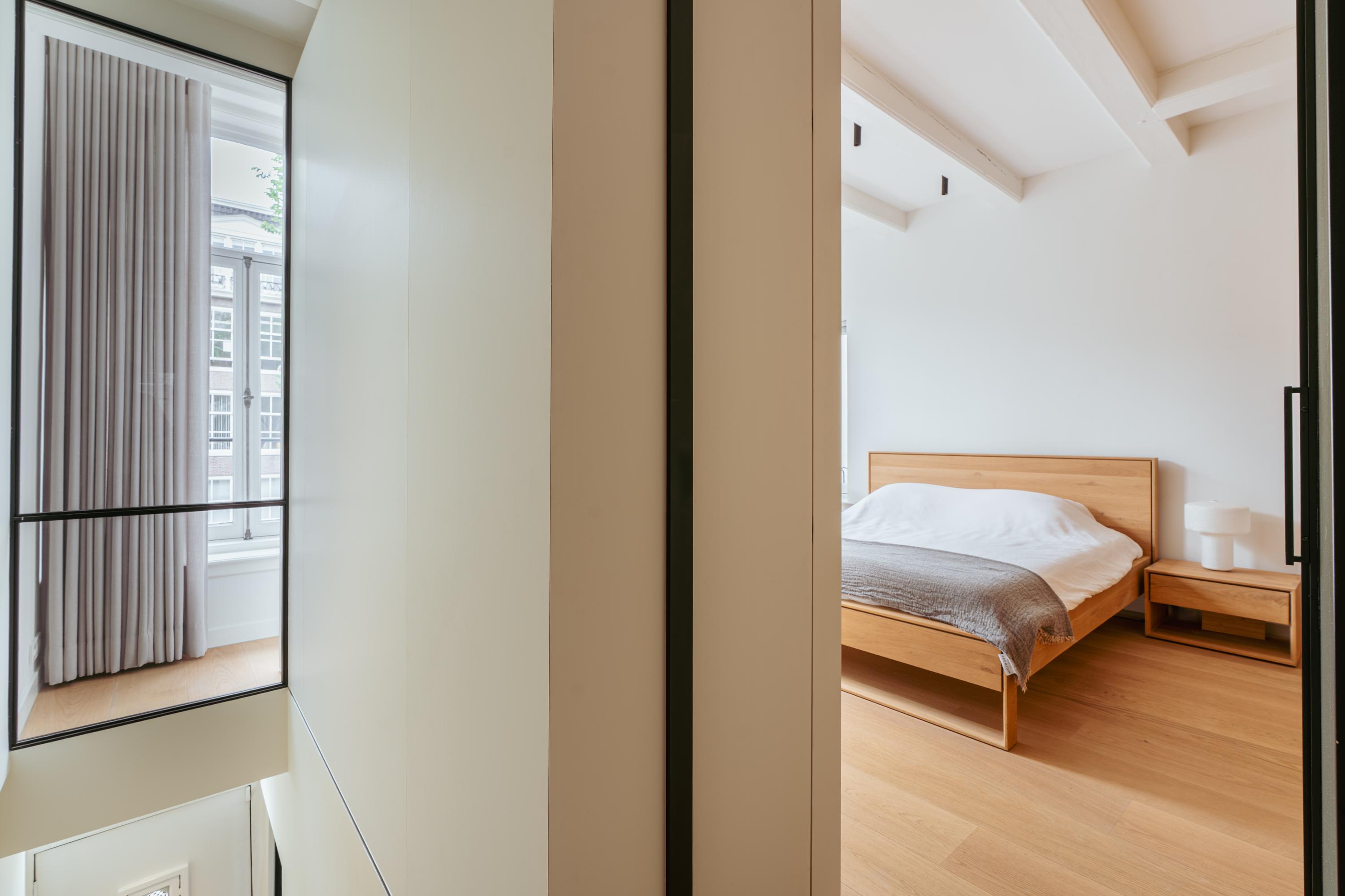A tidy landing with built-in storage leads to two bedrooms. This floor features a beautiful wooden floor and premium finishes. At the front is a spacious bedroom with a custom-made built-in wardrobe that seamlessly integrates into the design. Large windows flood the space with natural light and offer a stunning view of the canal and historic facades. The second bedroom at the rear also includes built-in wardrobes. Centrally located on this floor is the modern bathroom, complete with a walk-in shower, sleek vanity, and stylish toilet — all finished to a high and timeless standard. Elegant steel-framed doors close off the bedrooms, combining functionality and design in harmony with the home’s aesthetic.