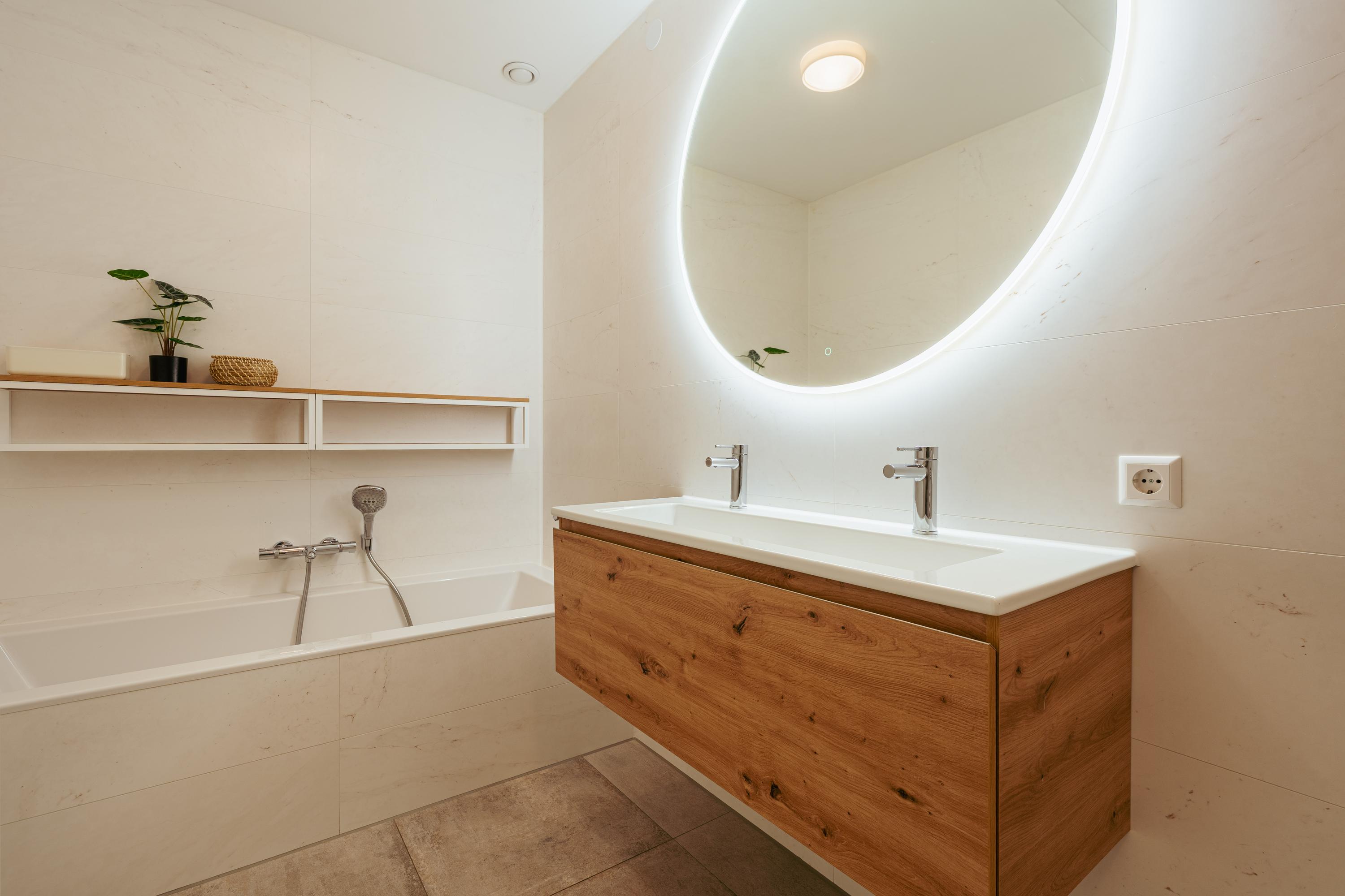 Centrally located is the bathroom, equipped with a double washbasin with cabinet, bathtub, and walk-in shower. At the rear of the home are two well-proportioned bedrooms. A second balcony with sliding doors is also situated at the rear. The entire apartment features a beautiful floor finish. In the basement level, you will find a storage unit of over 7m² and a parking space. The asking price for the parking space is €50,000 (buyer’s costs).