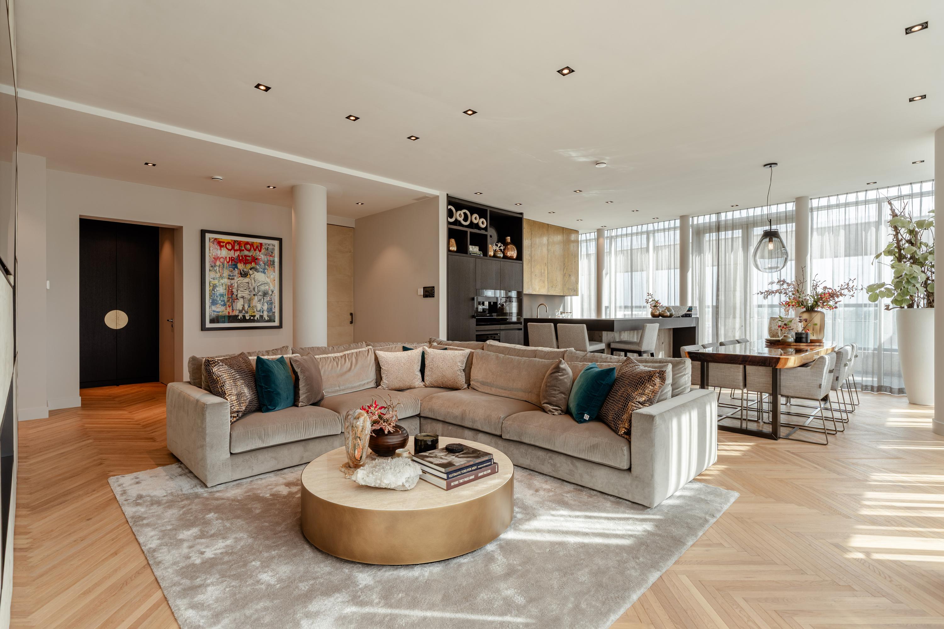 The open-plan kitchen with cooking island forms the heart of the home. Fully equipped with premium Miele appliances, including a wine cooler, steam oven, and coffee machine, it flows into the dining area and the large terrace, where you can enjoy a truly unique view over Dam Square.