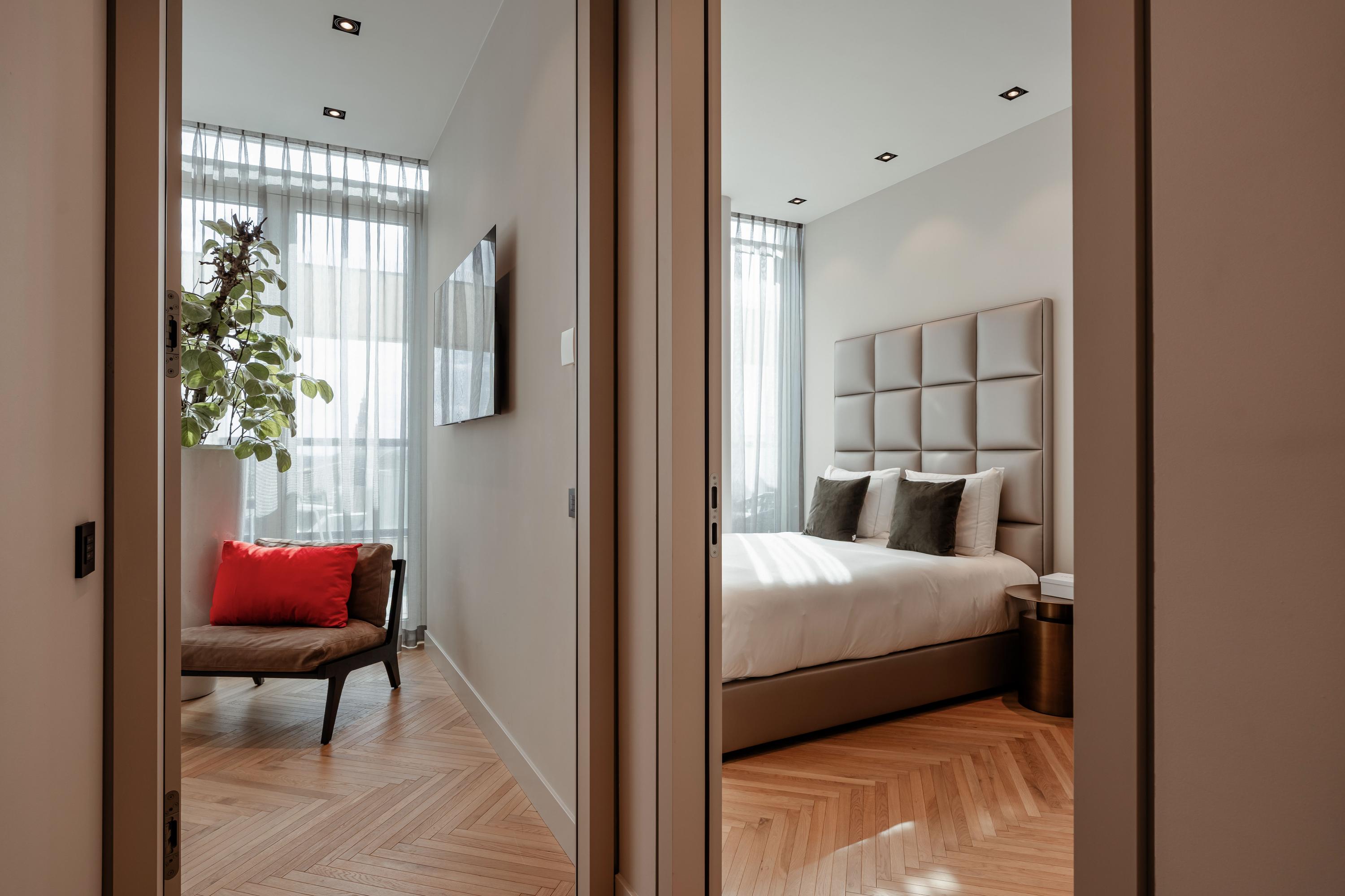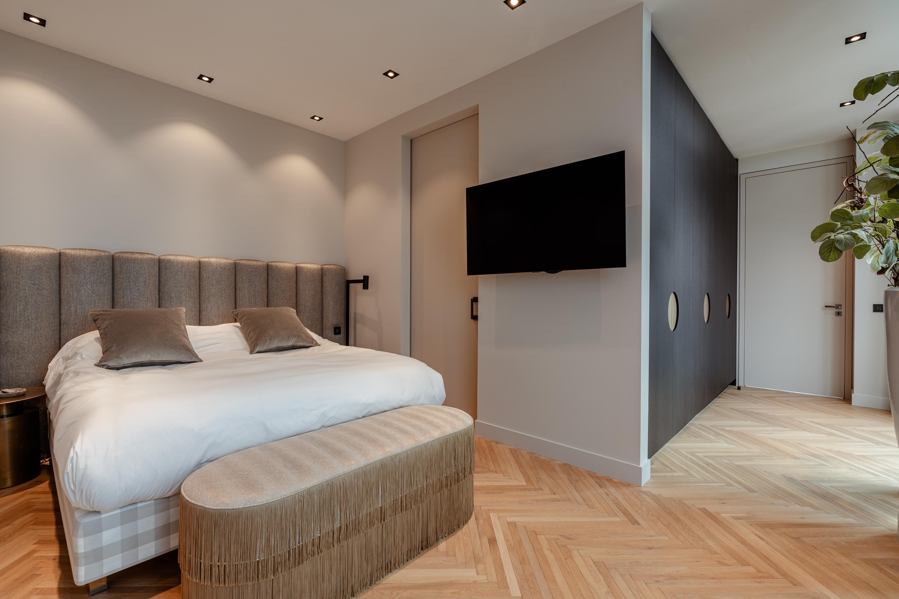 The apartment offers three bedrooms, each furnished with luxury Hästens beds. The master suite includes a private walk-in closet and a luxurious bathroom finished in marble and mosaic, featuring a bathtub, double washbasin, walk-in shower, and separate toilet. The second bathroom, designed in warm earthy tones, is also fully equipped and smartly laid out. Throughout the apartment lies a beautiful wooden floor, combined with underfloor and ceiling heating and cooling, recessed lighting, and electric sun blinds. A private storage room, as well as a technical and laundry room, are also included.