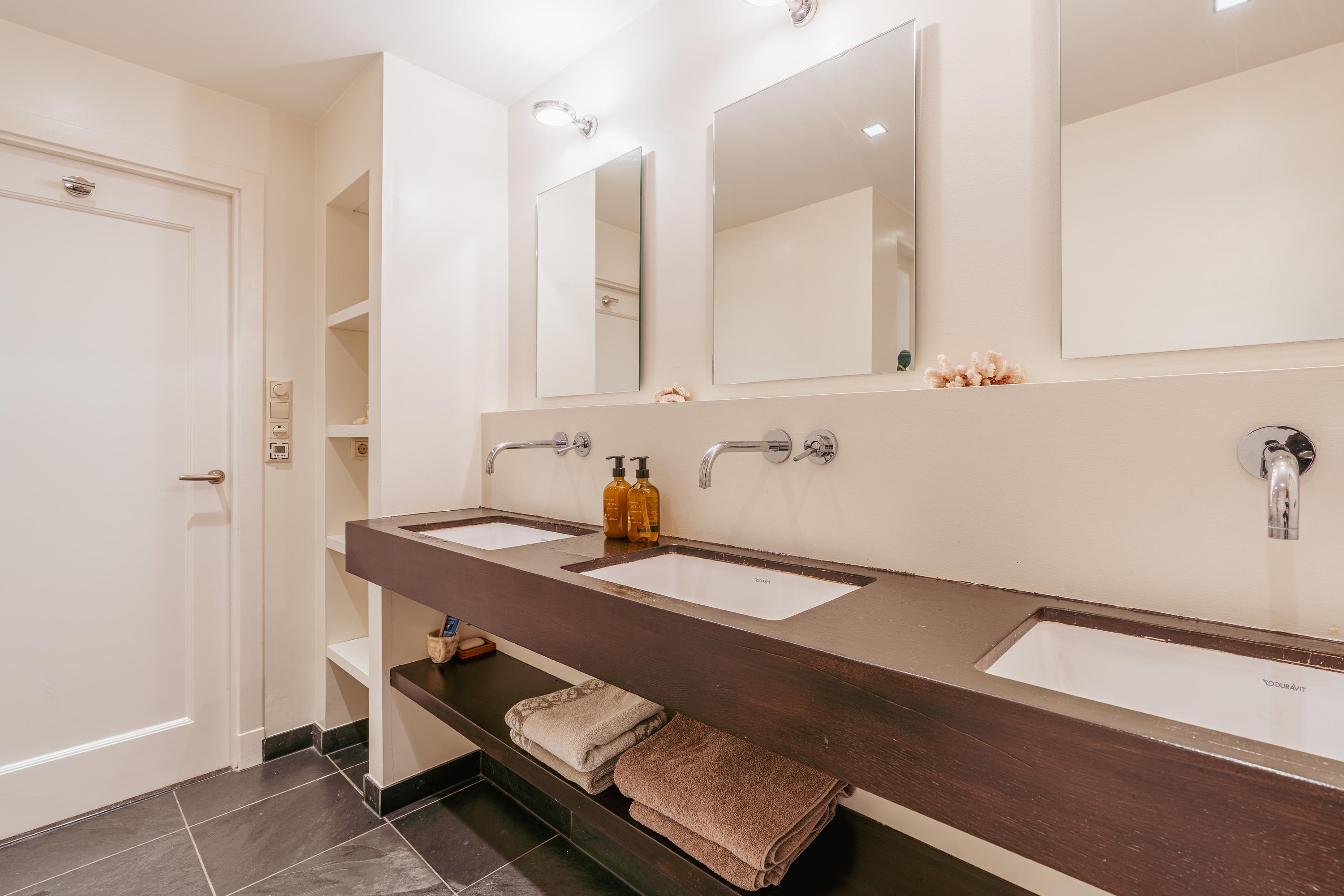 The upper levels host generous bedrooms, including a master suite with custom wardrobes and a secluded balcony. Multiple bathrooms ensure comfort and privacy. The top floor features ample natural light with impressive ceiling height, suitable for working or relaxing. High-quality finishes, dakraam for additional illumination, and insulation measures such as dakisolatie and double glazing contribute to its comfort.