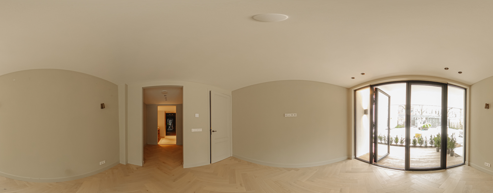 A luxury, 182-m² double ground-floor apartment with four bedrooms, two bathrooms, a balcony, terrace, internal storage space and a front and back entrance. The apartment features carefully selected, high-end materials that create a sense of warmth and comfort. Luxury herringbone floors, high ceilings, subtle tones in the kitchen and bathrooms and a well-thought-out lighting plan create a harmonious and inviting ambiance. The kitchen, with its clean lines and ample storage space, is a perfect combination of style and practical functionality. The building itself is a freehold property.