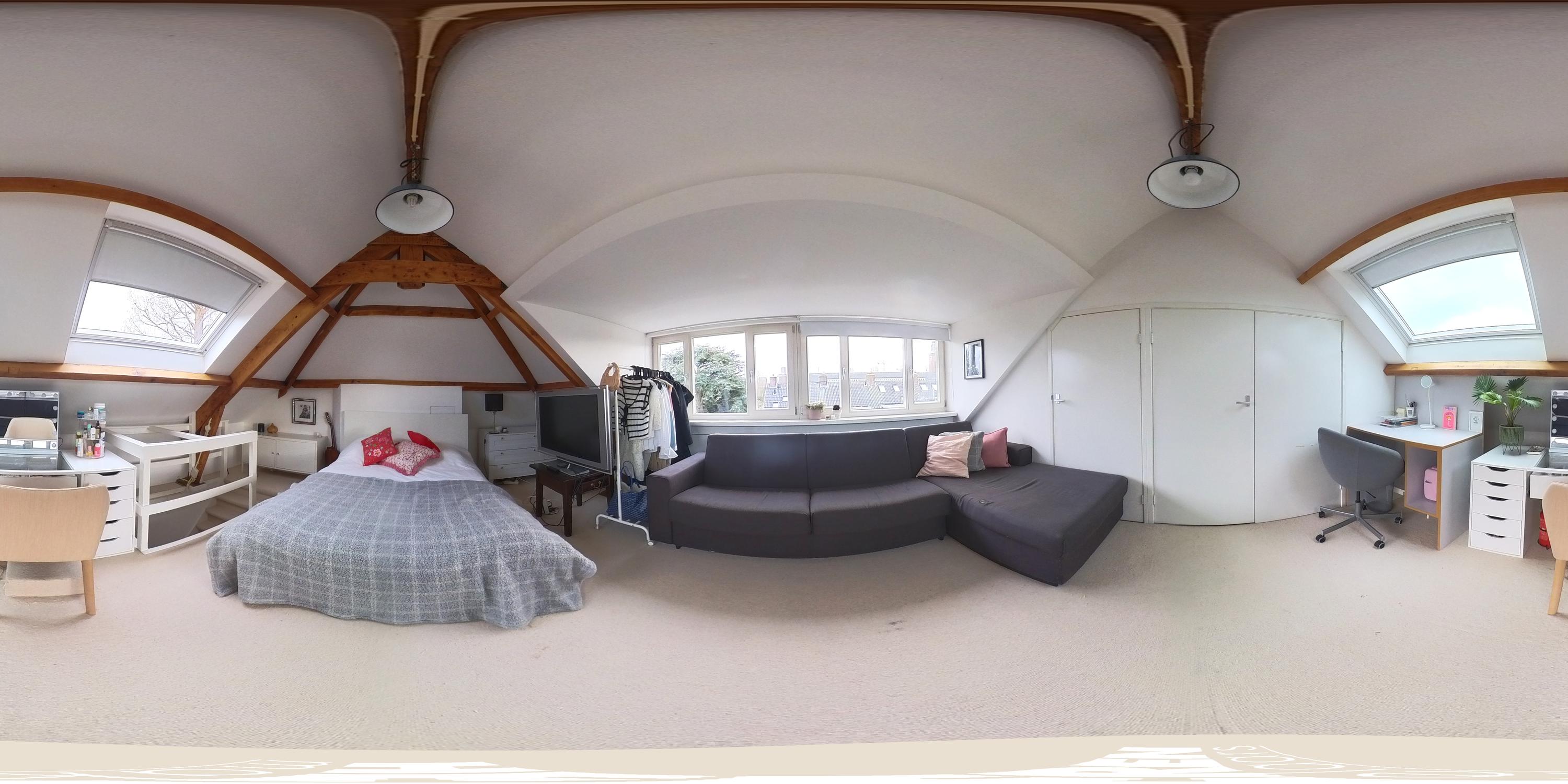 The room is currently arranged as a bedroom with a sitting area, but could easily serve as a master bedroom, studio or multifunctional space. Practical storage space is available in the knee walls.