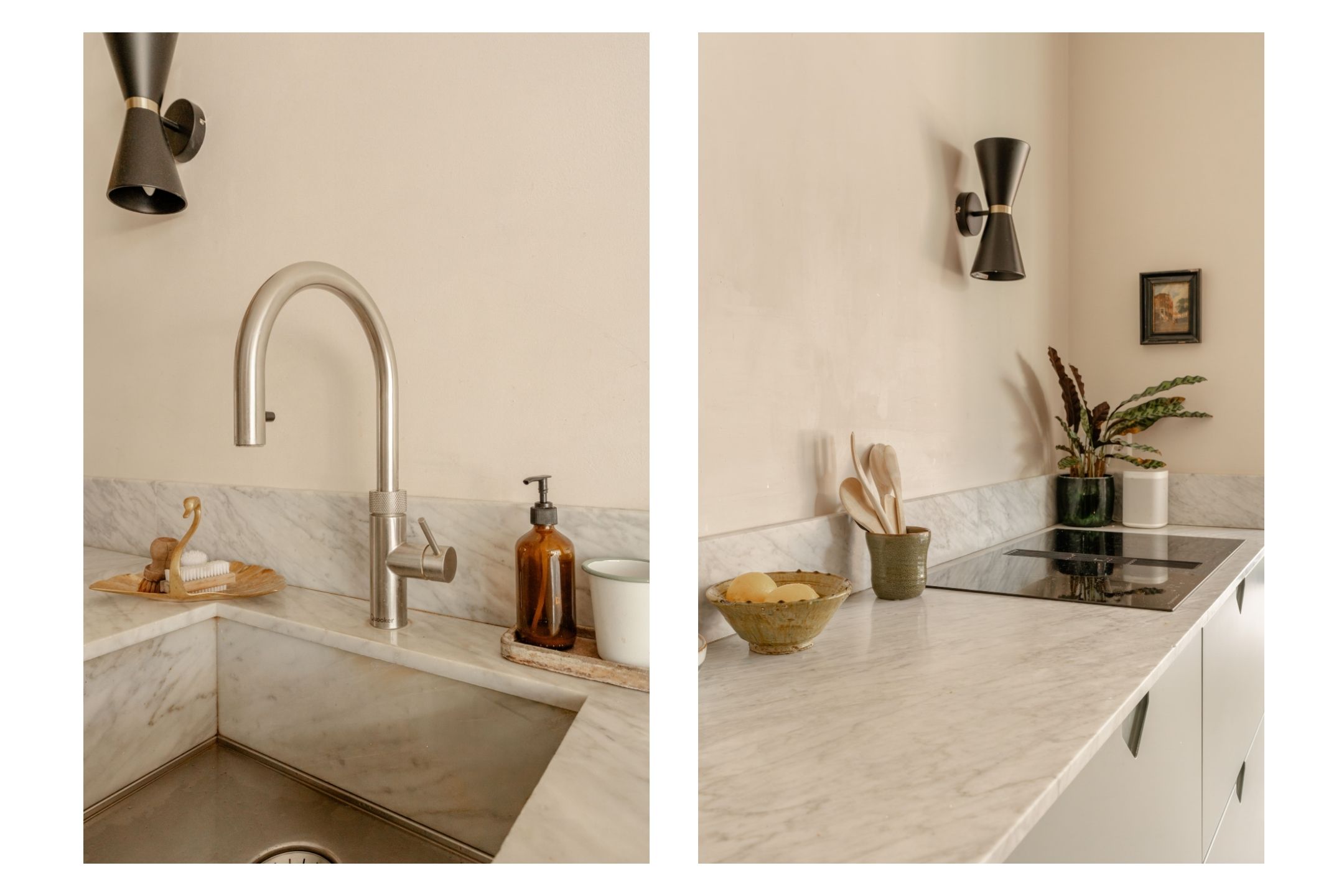 At the rear, there is a separate bedroom, ideal as a guest room, home office, or study, featuring built-in wardrobes and French doors opening onto the garden. Adjacent is the attractive extension housing a spacious open-plan kitchen, equipped with various built-in appliances, including an electric oven, induction hob with integrated extraction, fridge/freezer combination, and a Quooker providing both boiling and sparkling water.