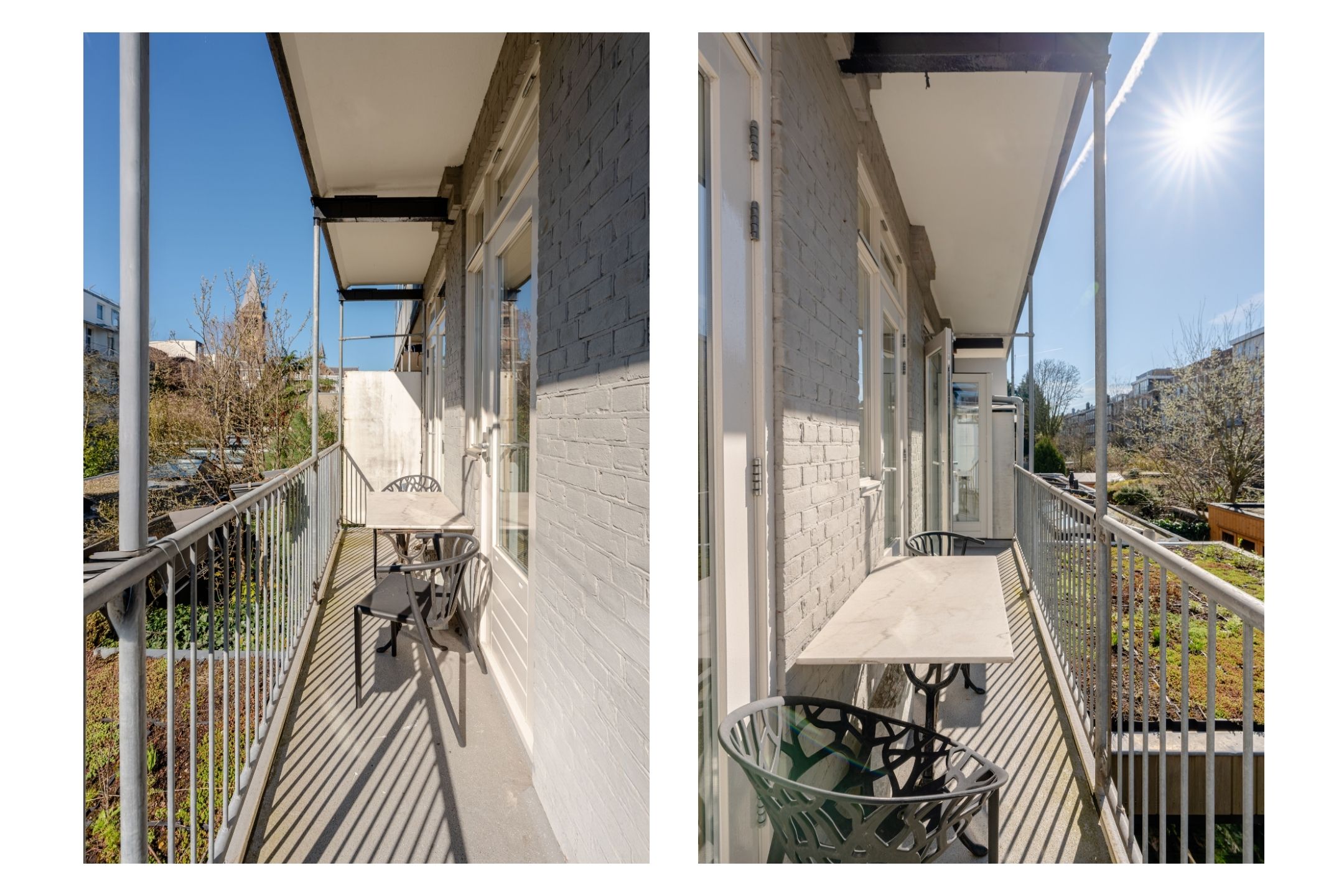 At the rear are two well-sized bedrooms, both featuring French doors opening onto the balcony, creating a strong connection between indoor and outdoor space while enjoying plenty of light and a green outlook.