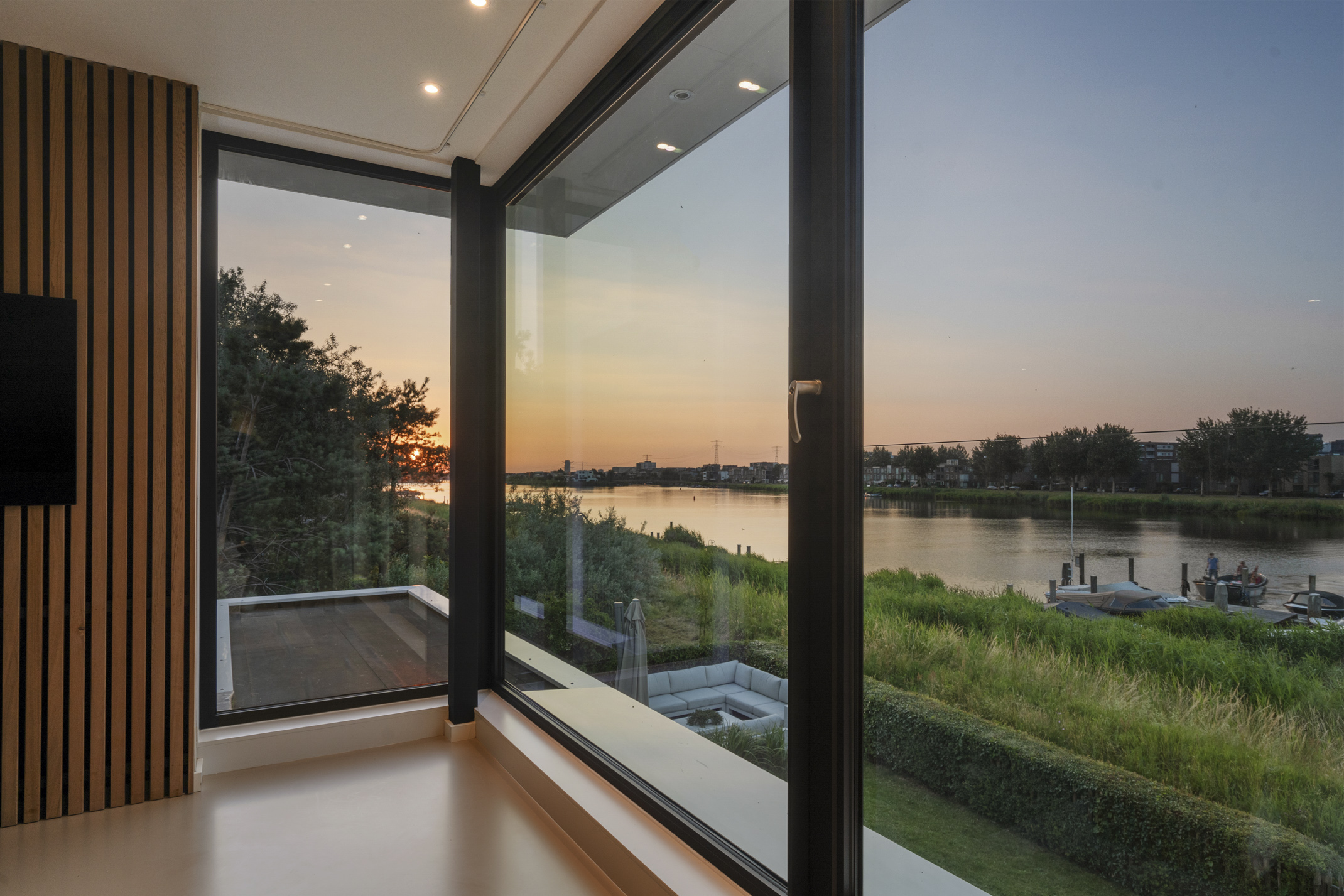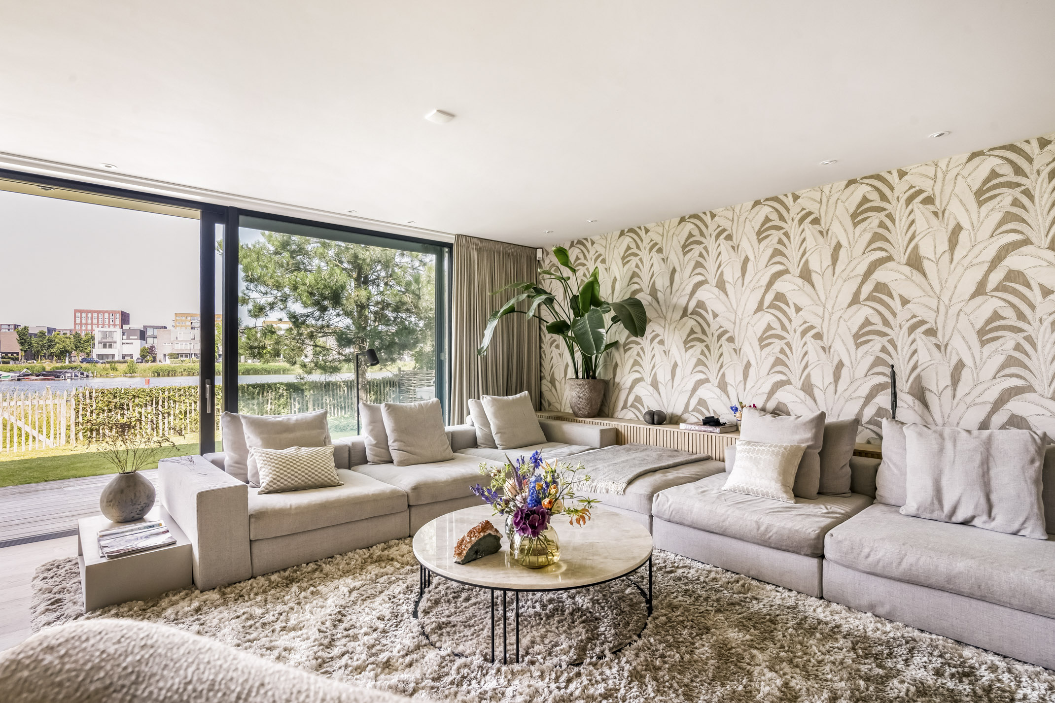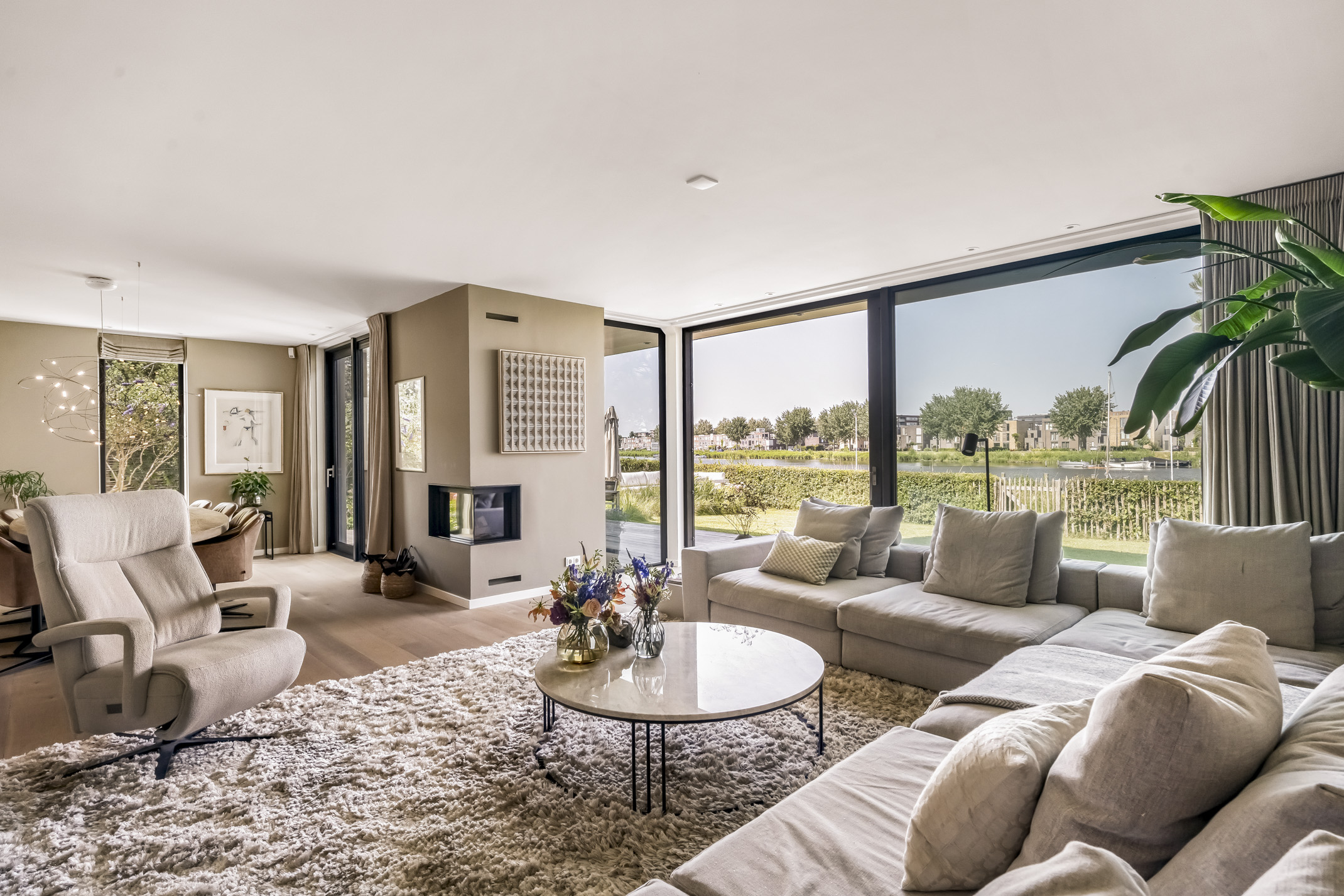- Spacious living area with large glass windows and fantastic views over the water