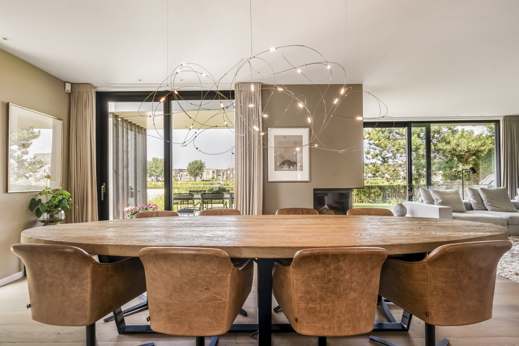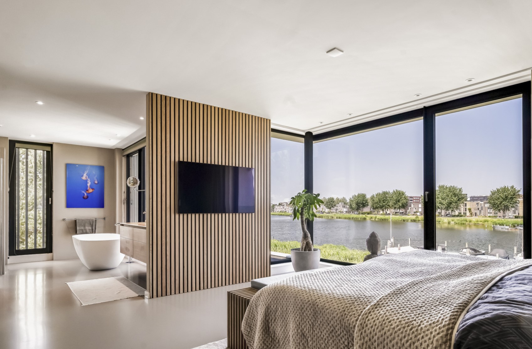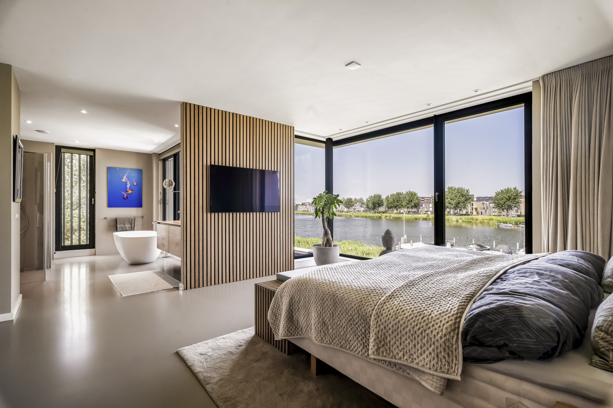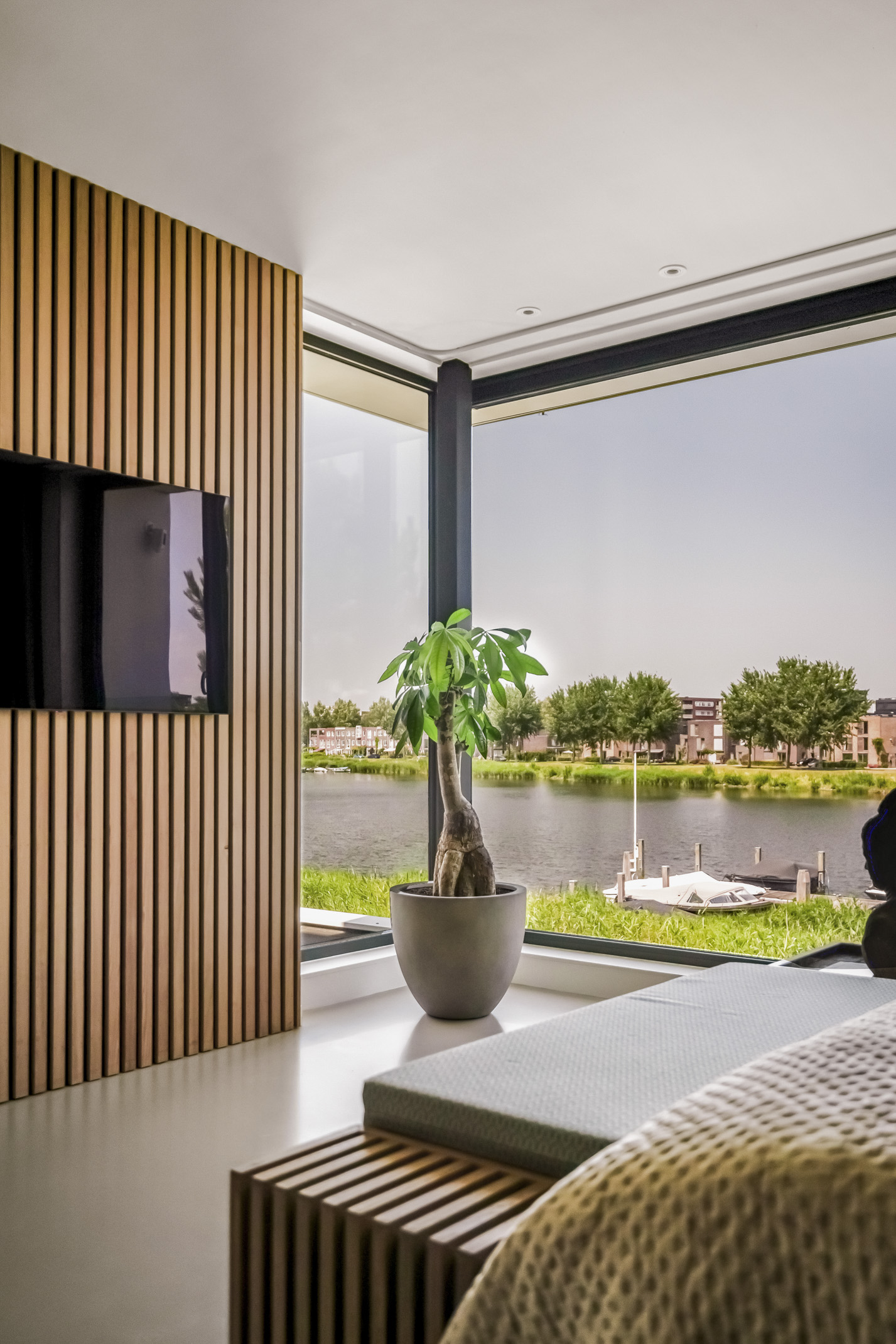 - Spacious living area with large glass windows and fantastic views over the water