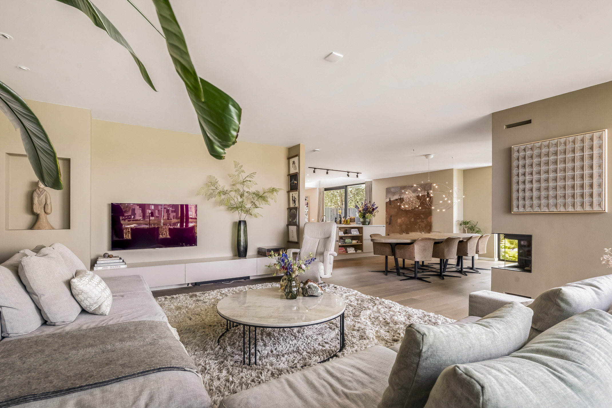 From the spacious hall with high ceilings, you enter the generous living area with large glass windows that immediately offer a beautiful view. The space has an impressive ceiling height and a cozy fireplace. Various sliding doors lead to the carefully landscaped garden with its own dock on the water. The garden features a large hardwood terrace, lawn and green borders.