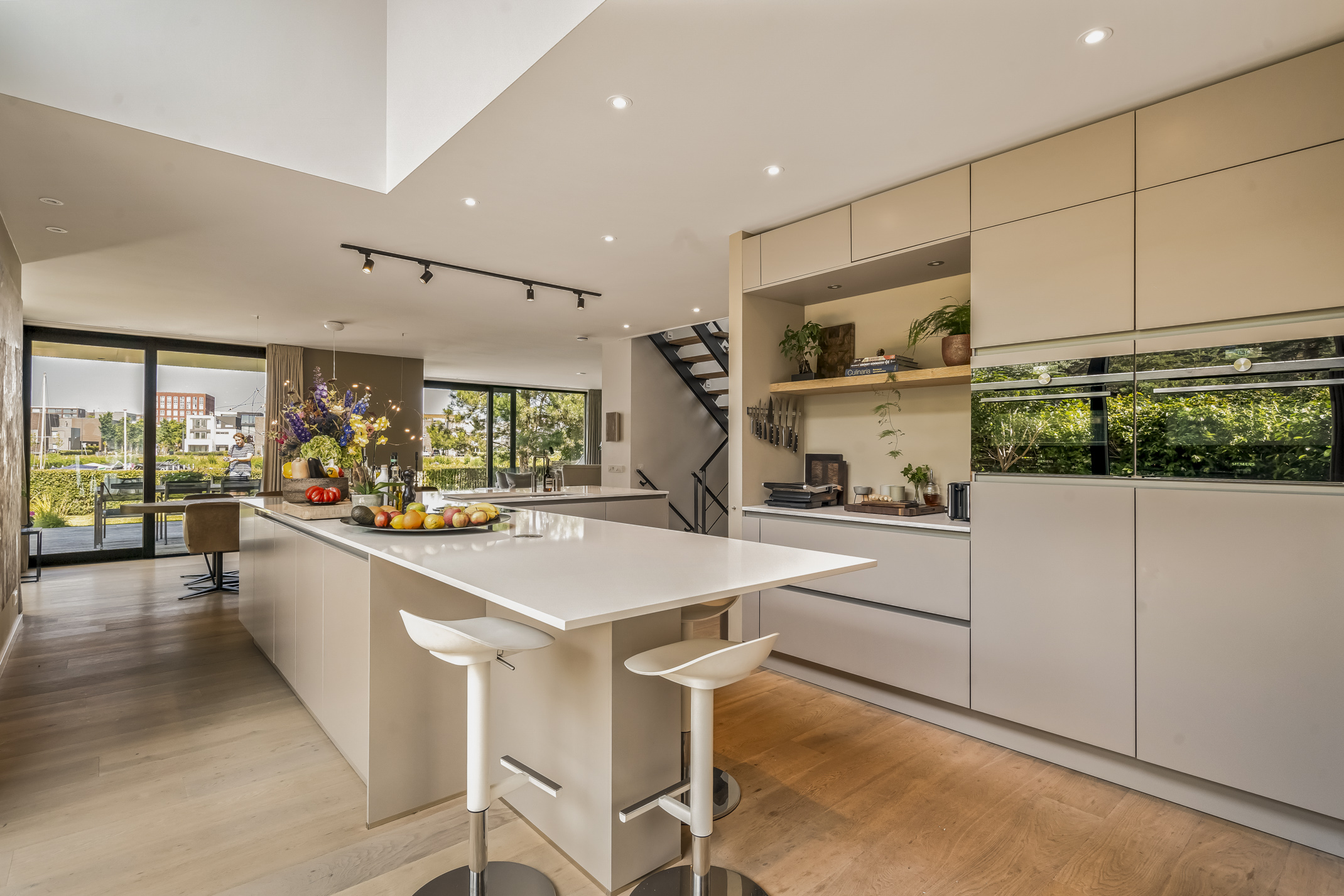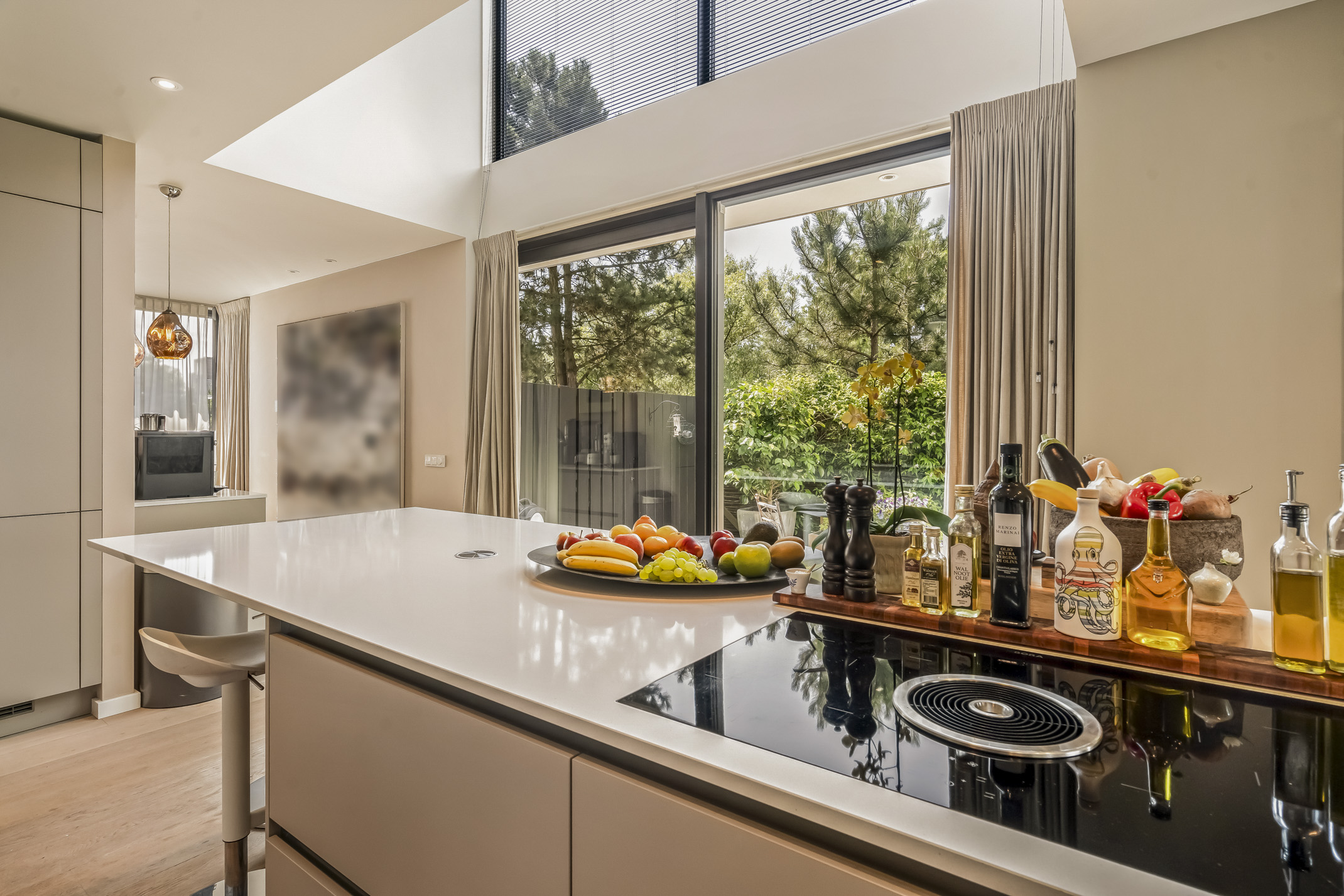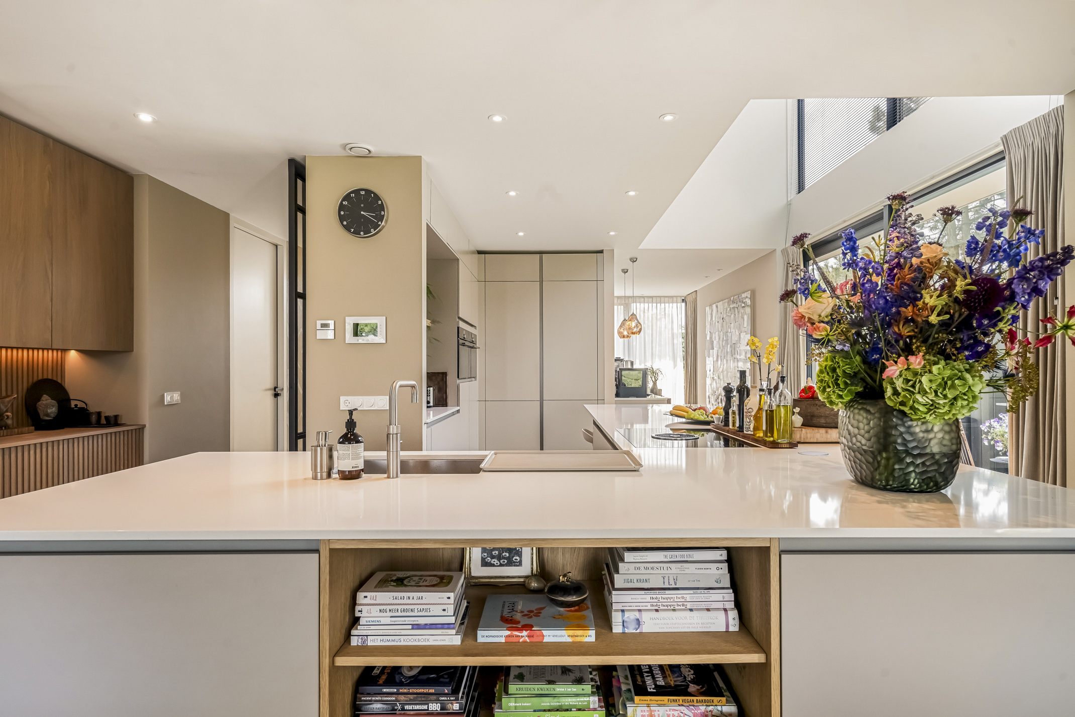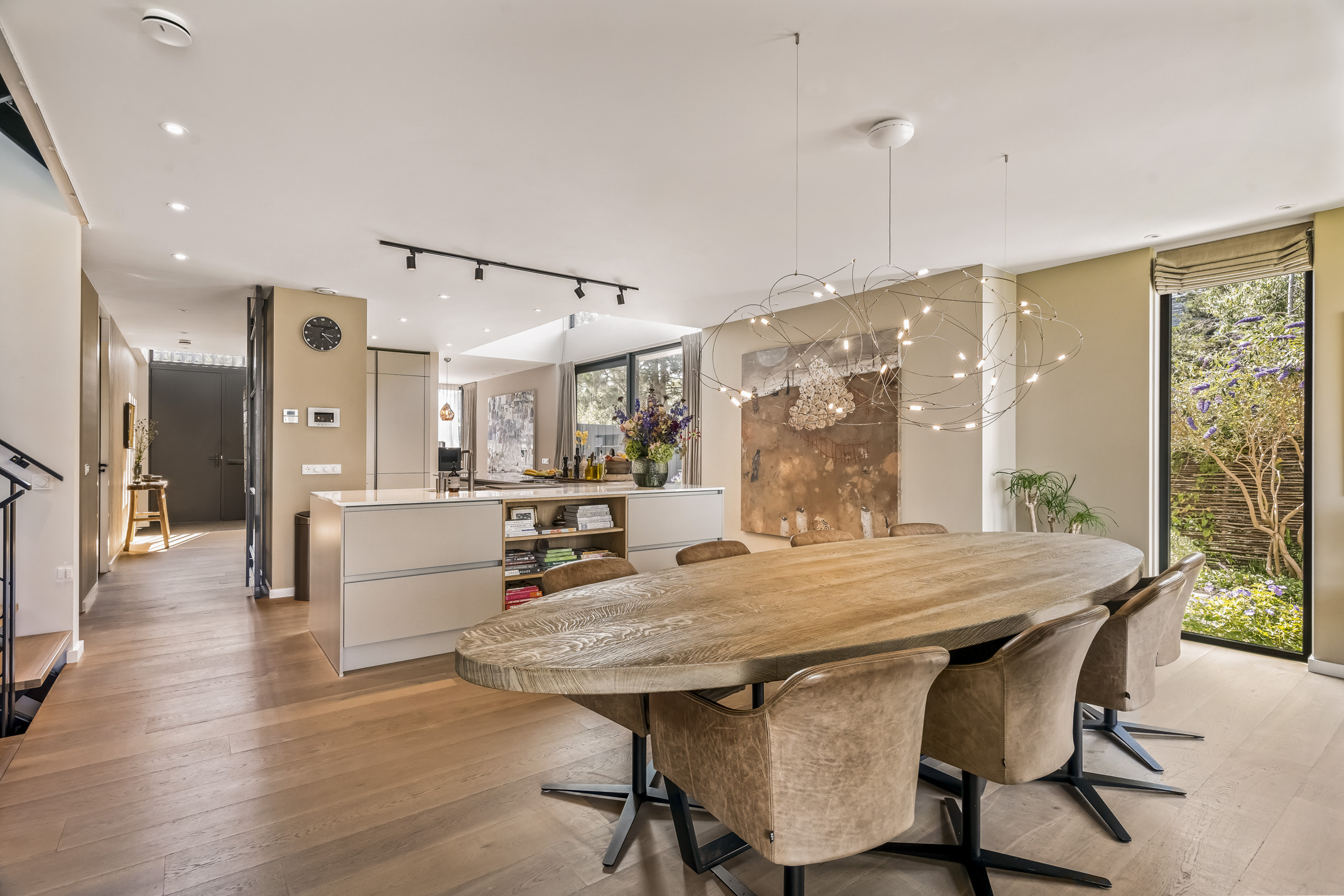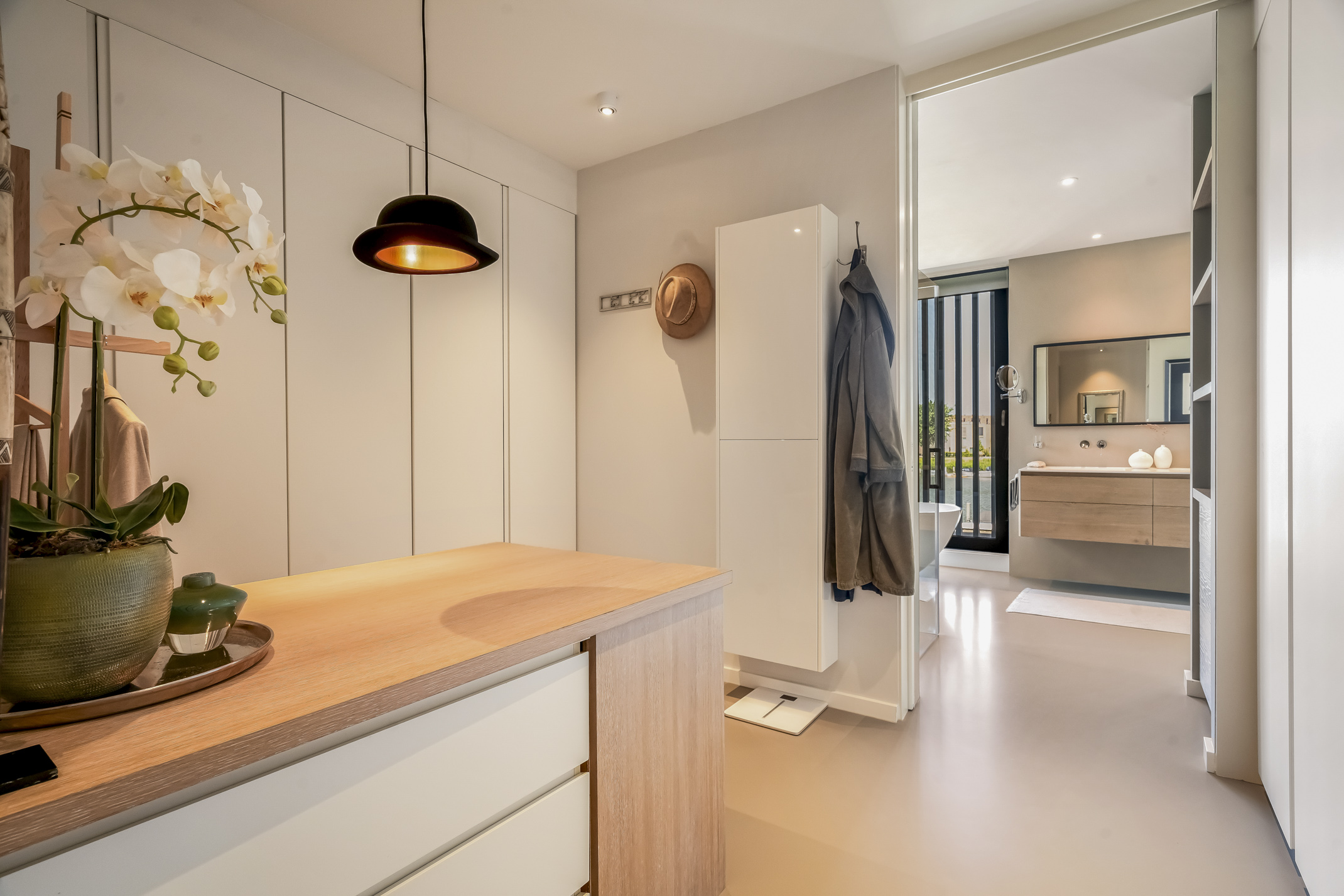 The luxurious kitchen is a dream for any chef, equipped with all modern appliances such as a Quooker, a Bora induction cooktop with integrated extraction system, dishwasher, extra large fridge and freezer, steam oven and a combi-oven. The coffee bar separates the kitchen from the study. There is also an outdoor kennel accessible from inside for your beloved pet.