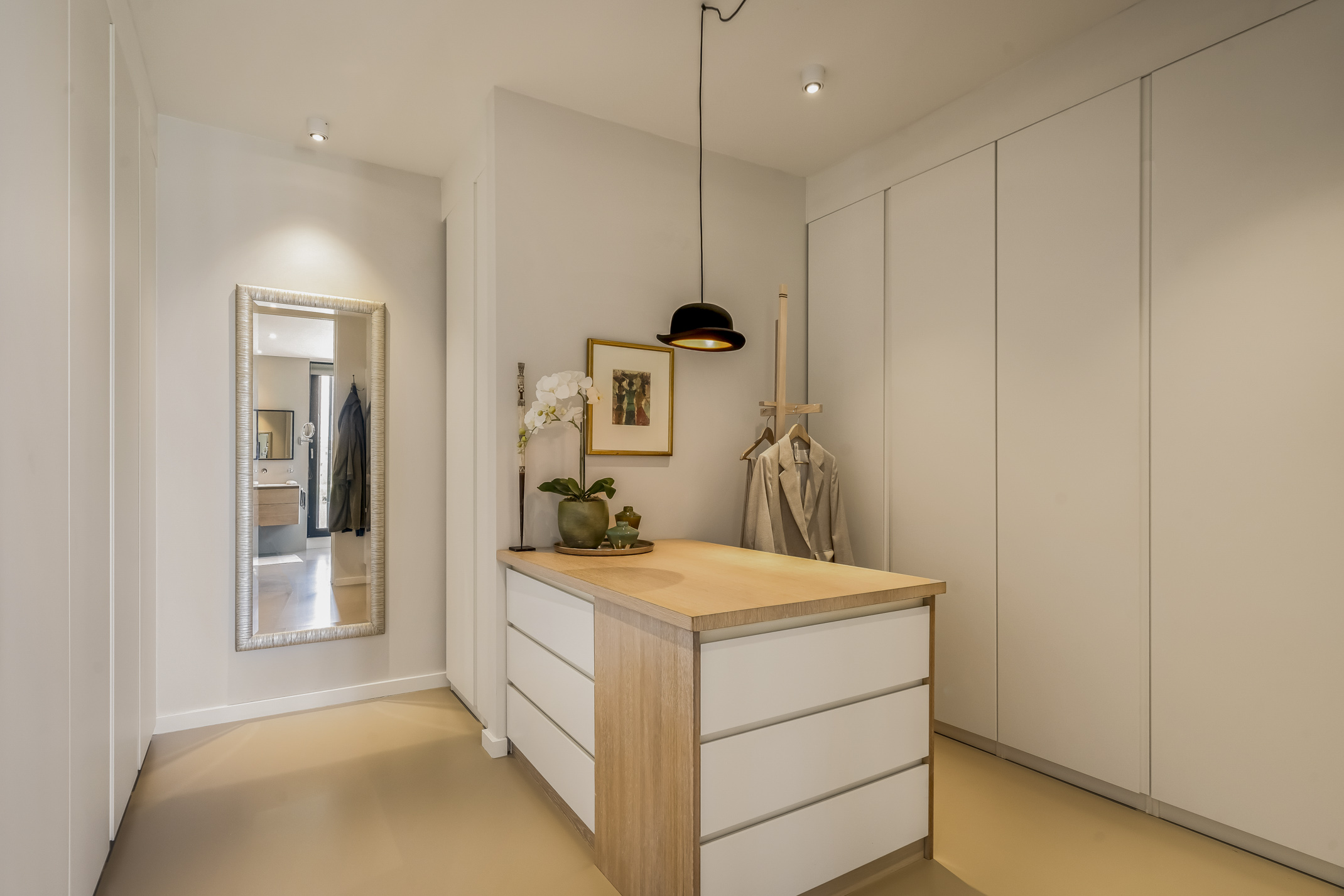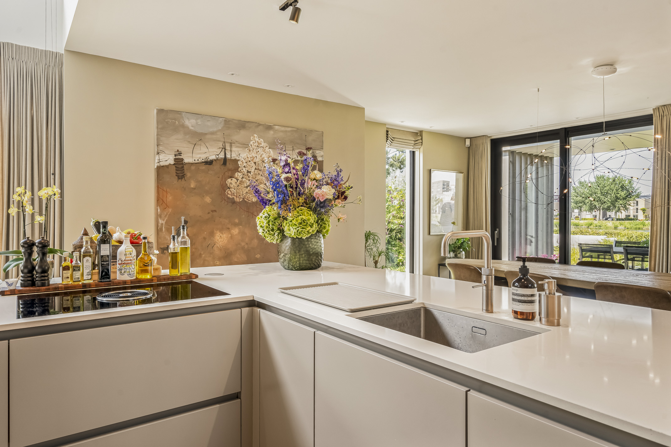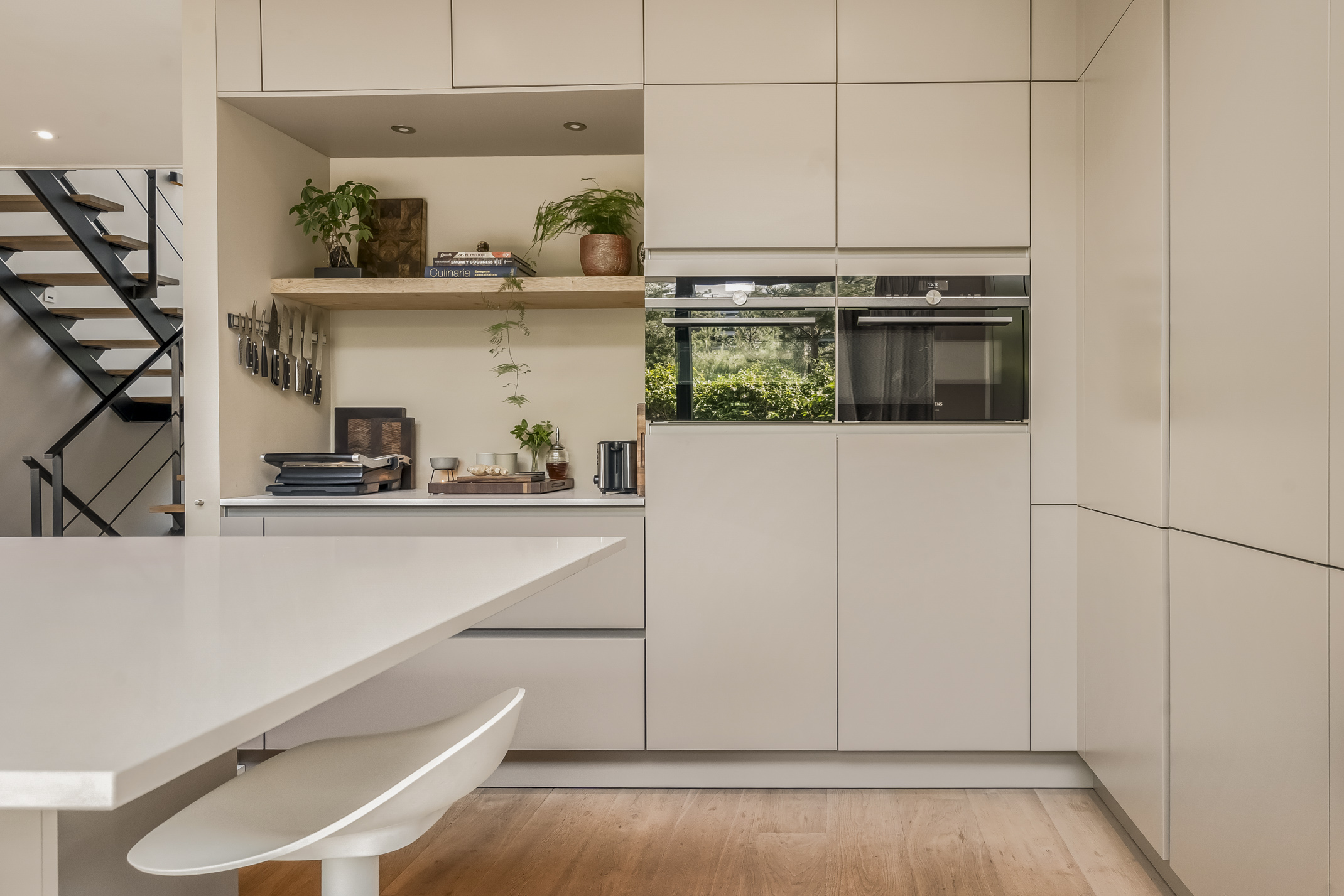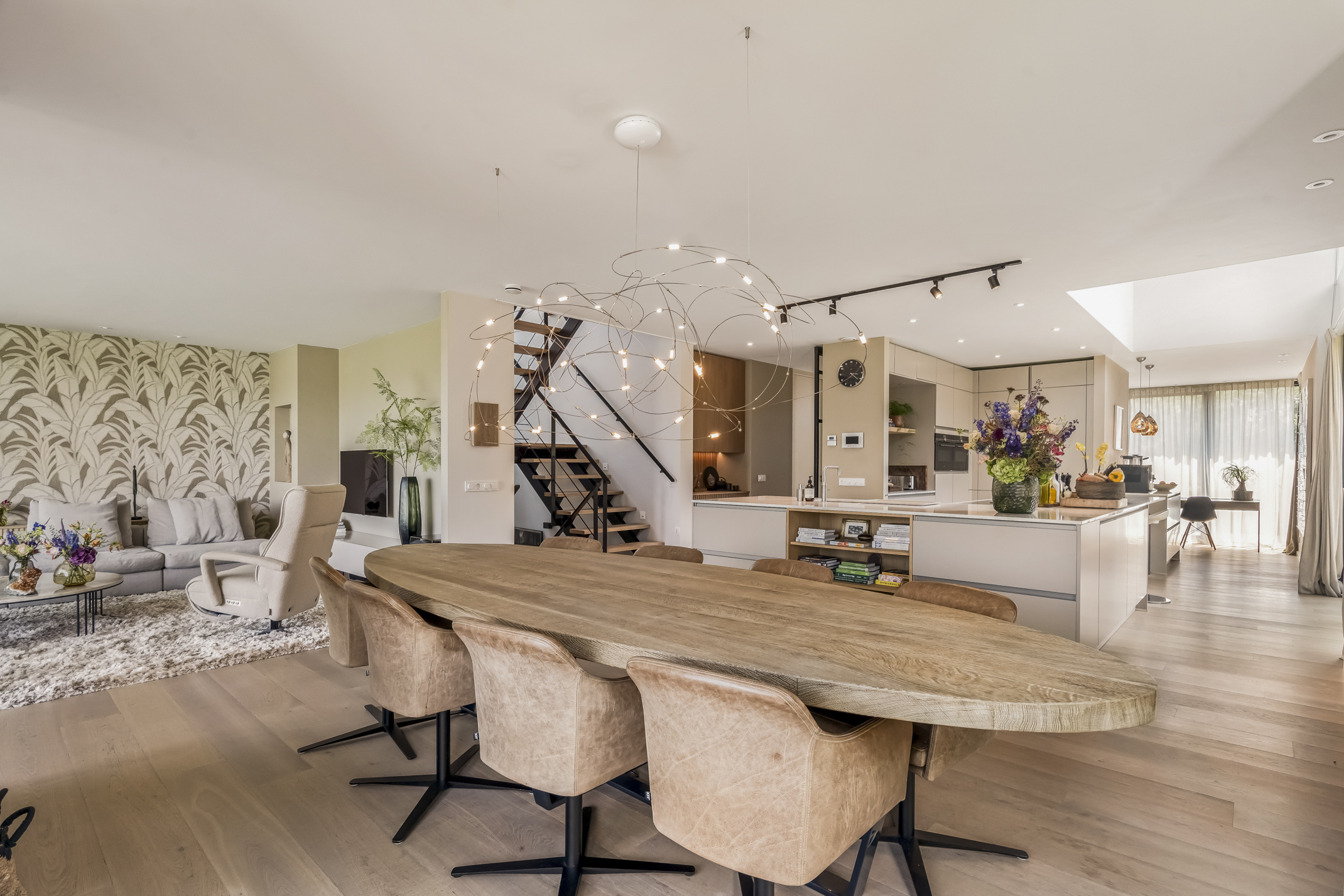 The luxurious kitchen is a dream for any chef, equipped with all modern appliances such as a Quooker, a Bora induction cooktop with integrated extraction system, dishwasher, extra large fridge and freezer, steam oven and a combi-oven. The coffee bar separates the kitchen from the study. There is also an outdoor kennel accessible from inside for your beloved pet.