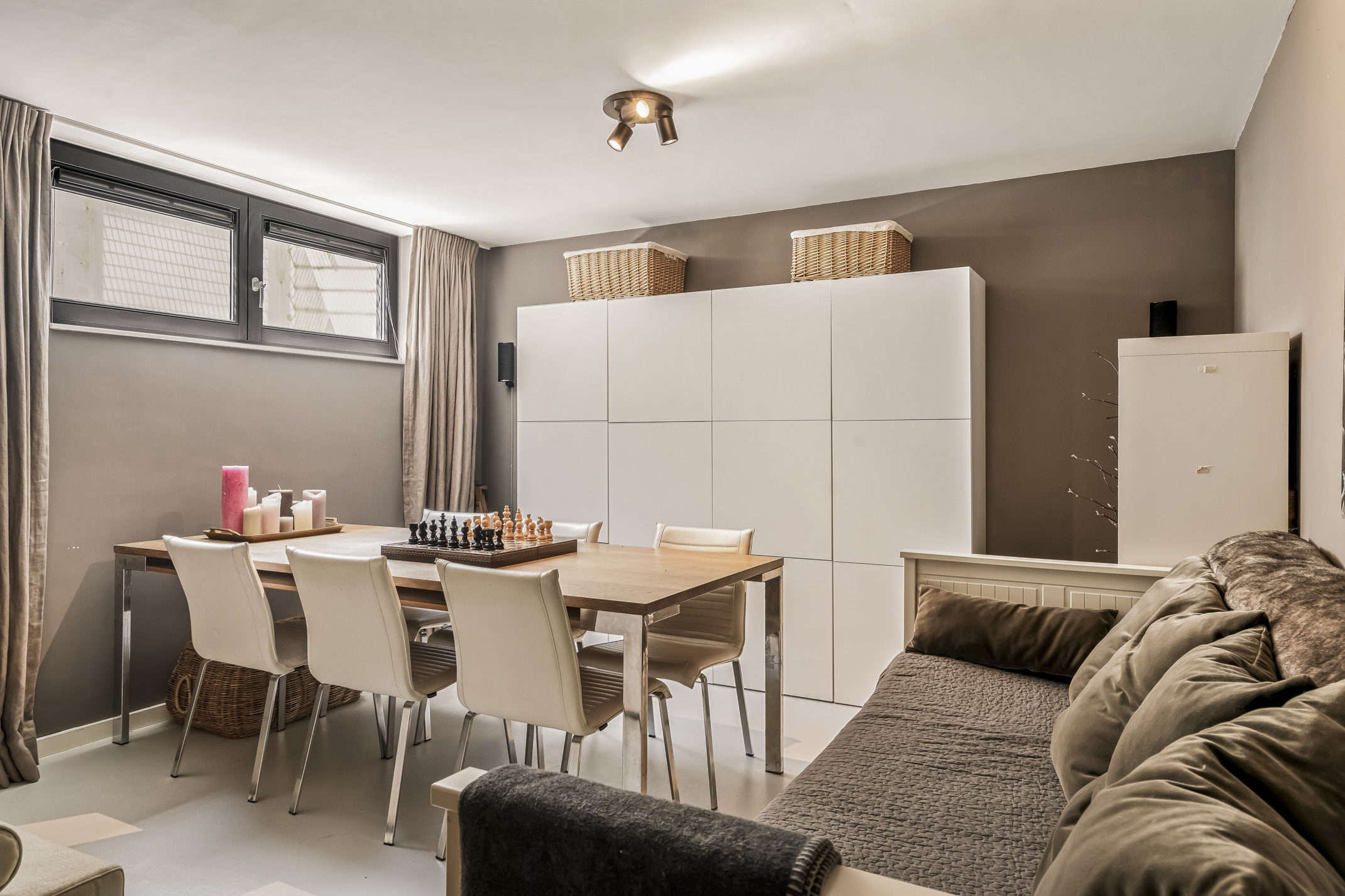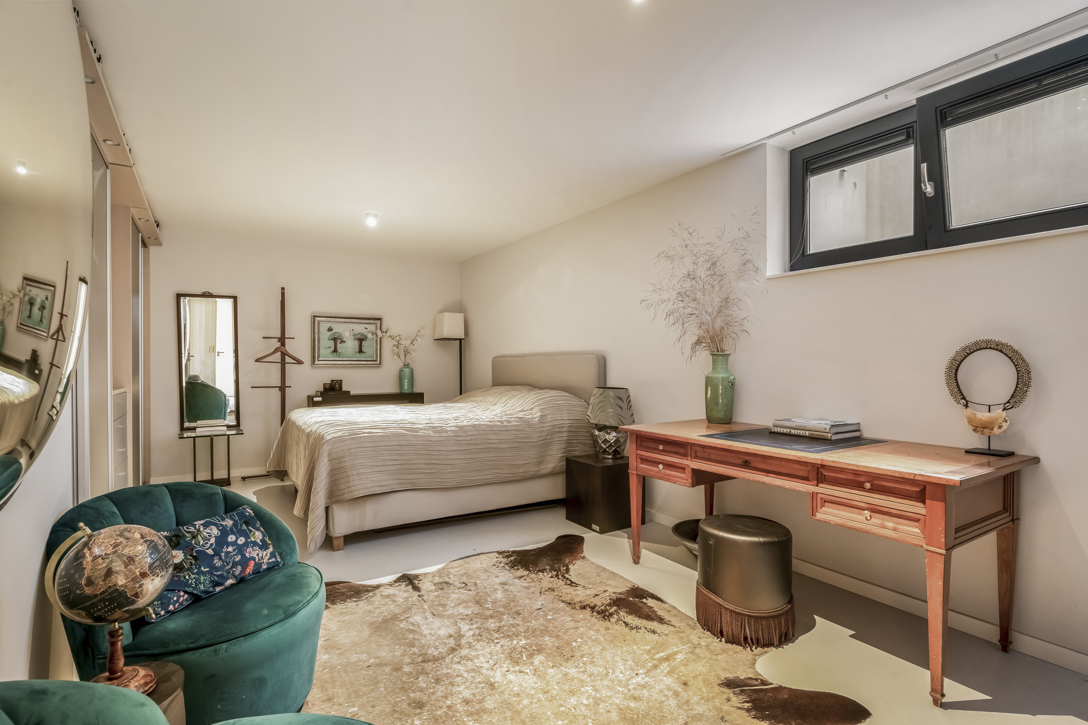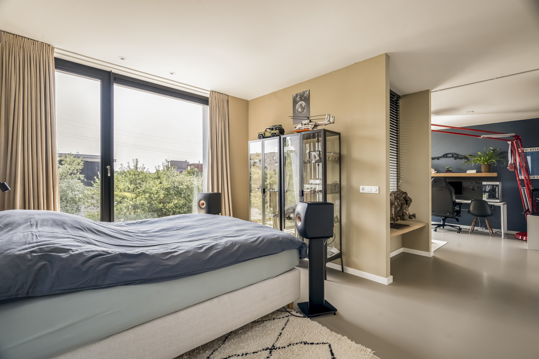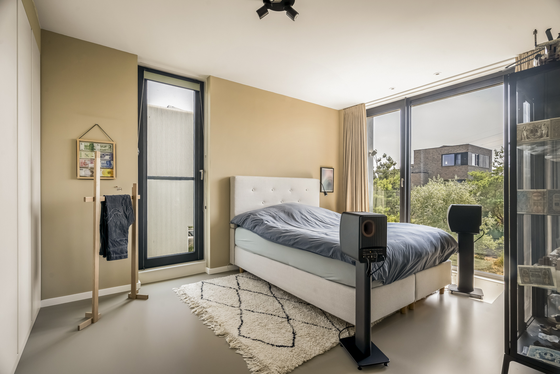 The spacious bedroom at the front can easily be divided into two bedrooms and offers a nice view of the entrance. This room is equipped with electric screens.
